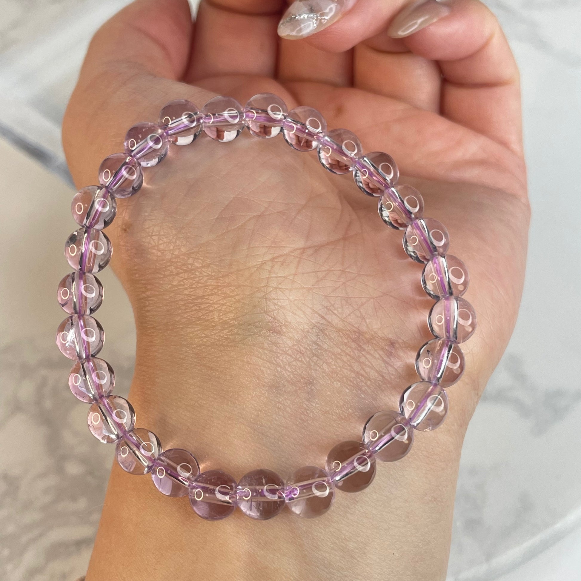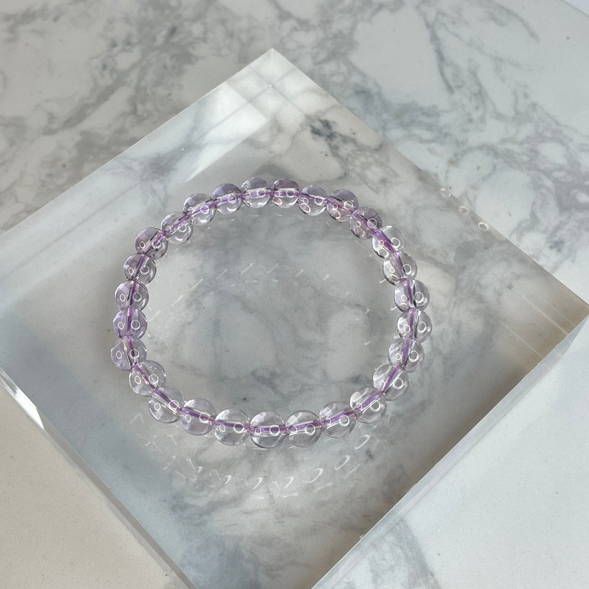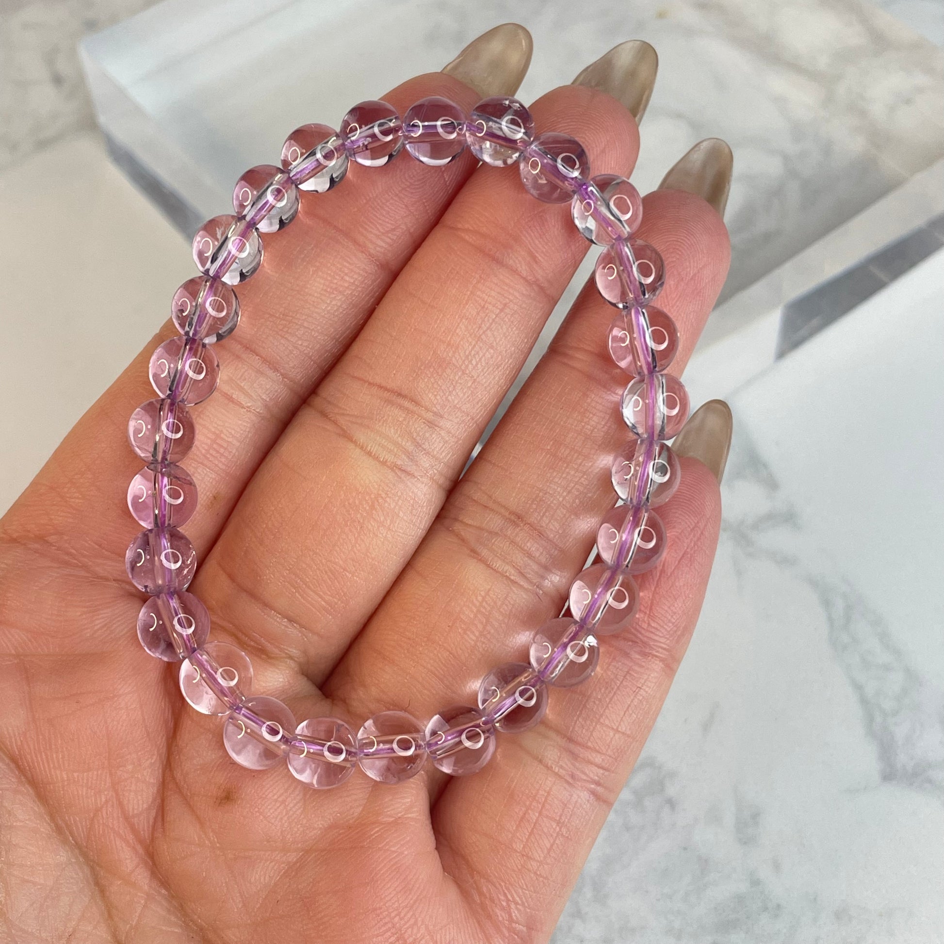 This delicate 6mm bracelet is made from high-grade natural Amethyst sourced from Bolivia, known for its soft lavender hue and exceptional clarity. Each bead is transparent with beautiful inner reflections, symbolizing peace, intuition, and emotional healing.