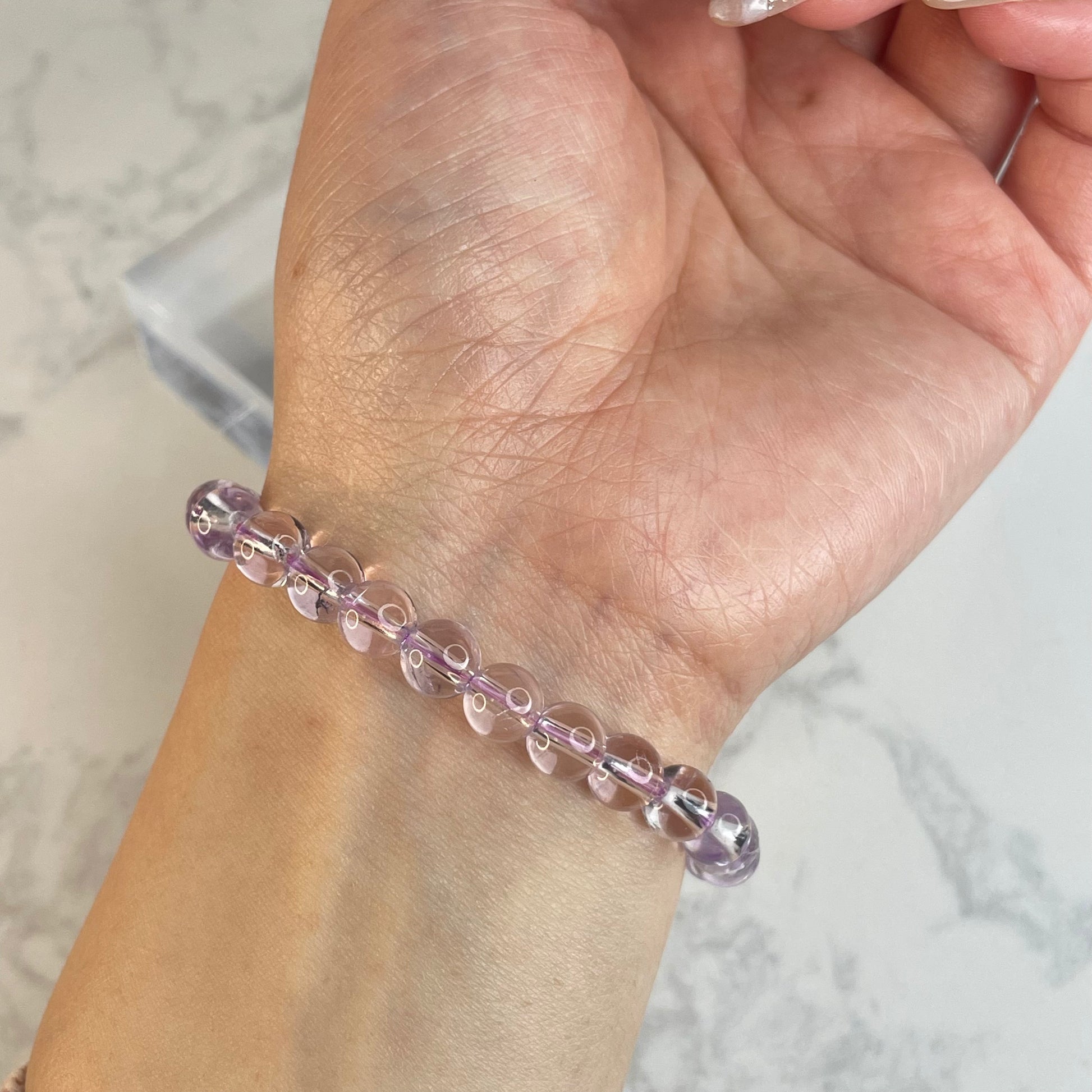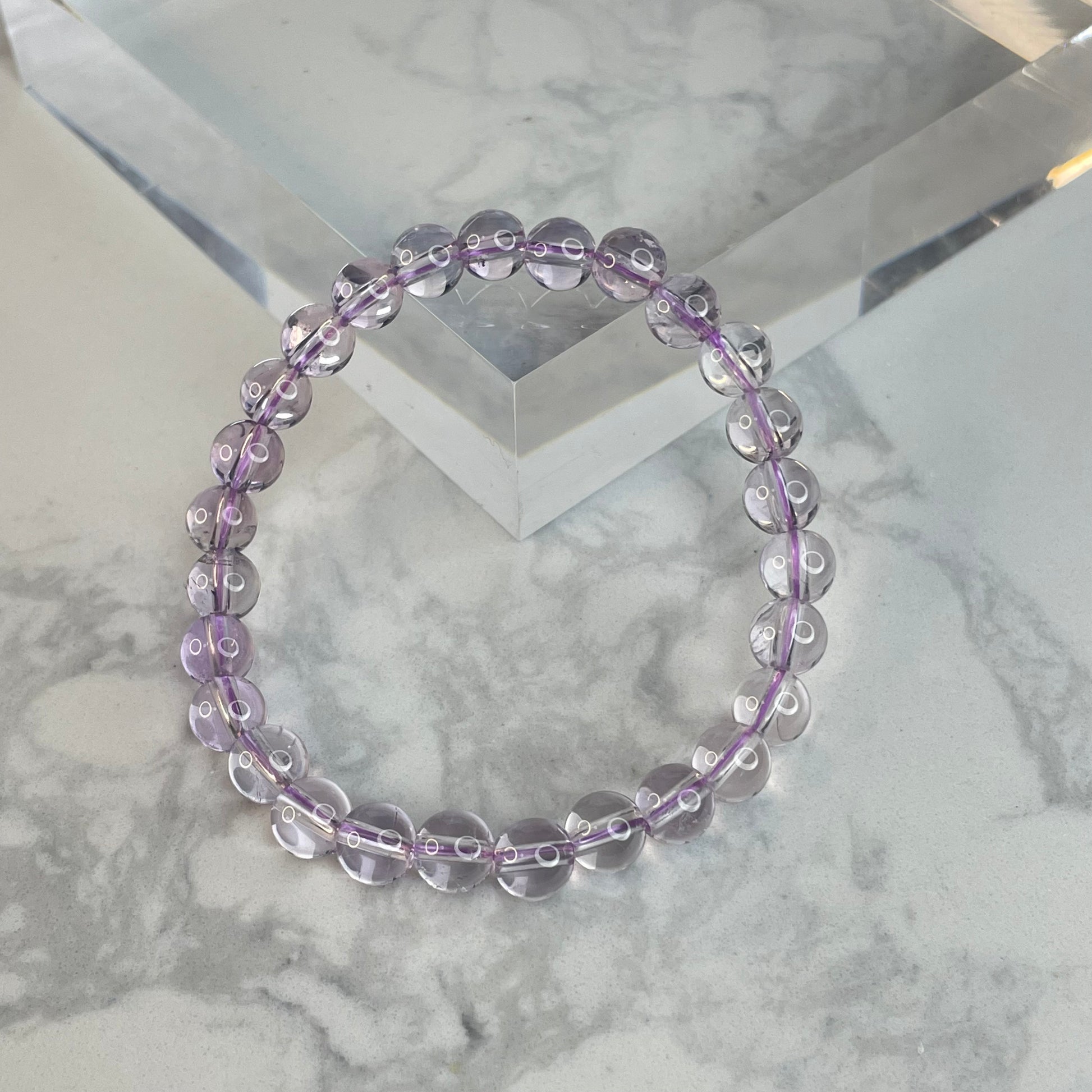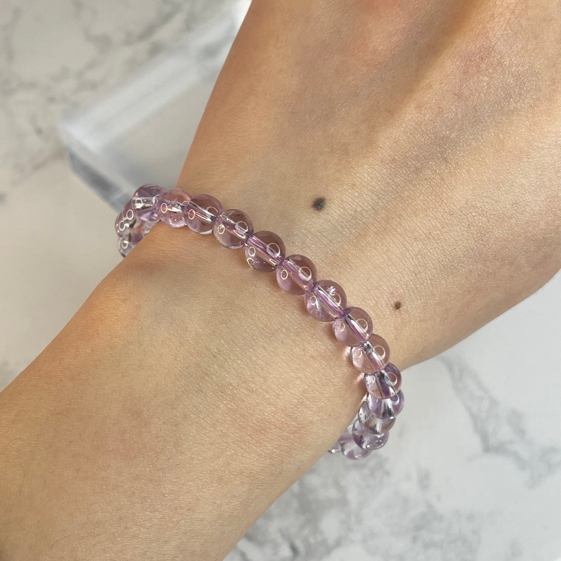 This delicate 6mm bracelet is made from high-grade natural Amethyst sourced from Bolivia, known for its soft lavender hue and exceptional clarity. Each bead is transparent with beautiful inner reflections, symbolizing peace, intuition, and emotional healing.