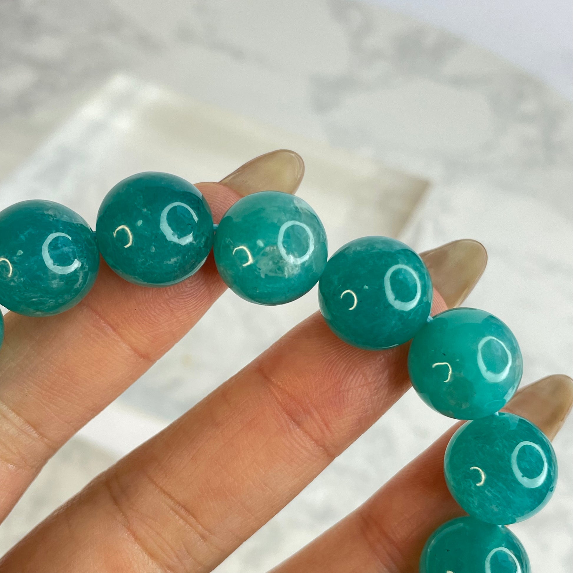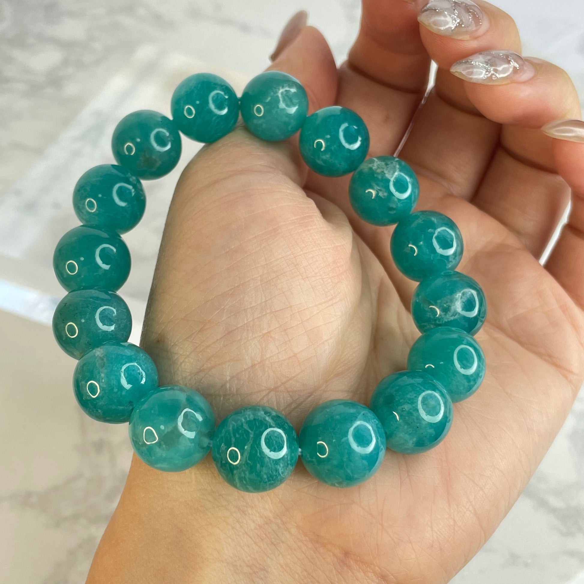 「海心寧語」亞馬遜石手串選用大顆 12mm 珠,色澤如海水般寧靜溫潤,散發出強而有力的安撫能量。亞馬遜石有助平衡情緒、釋放焦慮並強化溝通力,是追求心靈平靜與真誠表達的理想選擇。