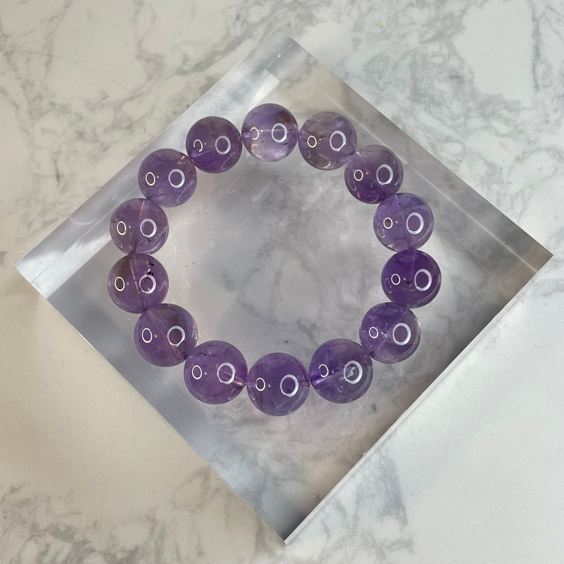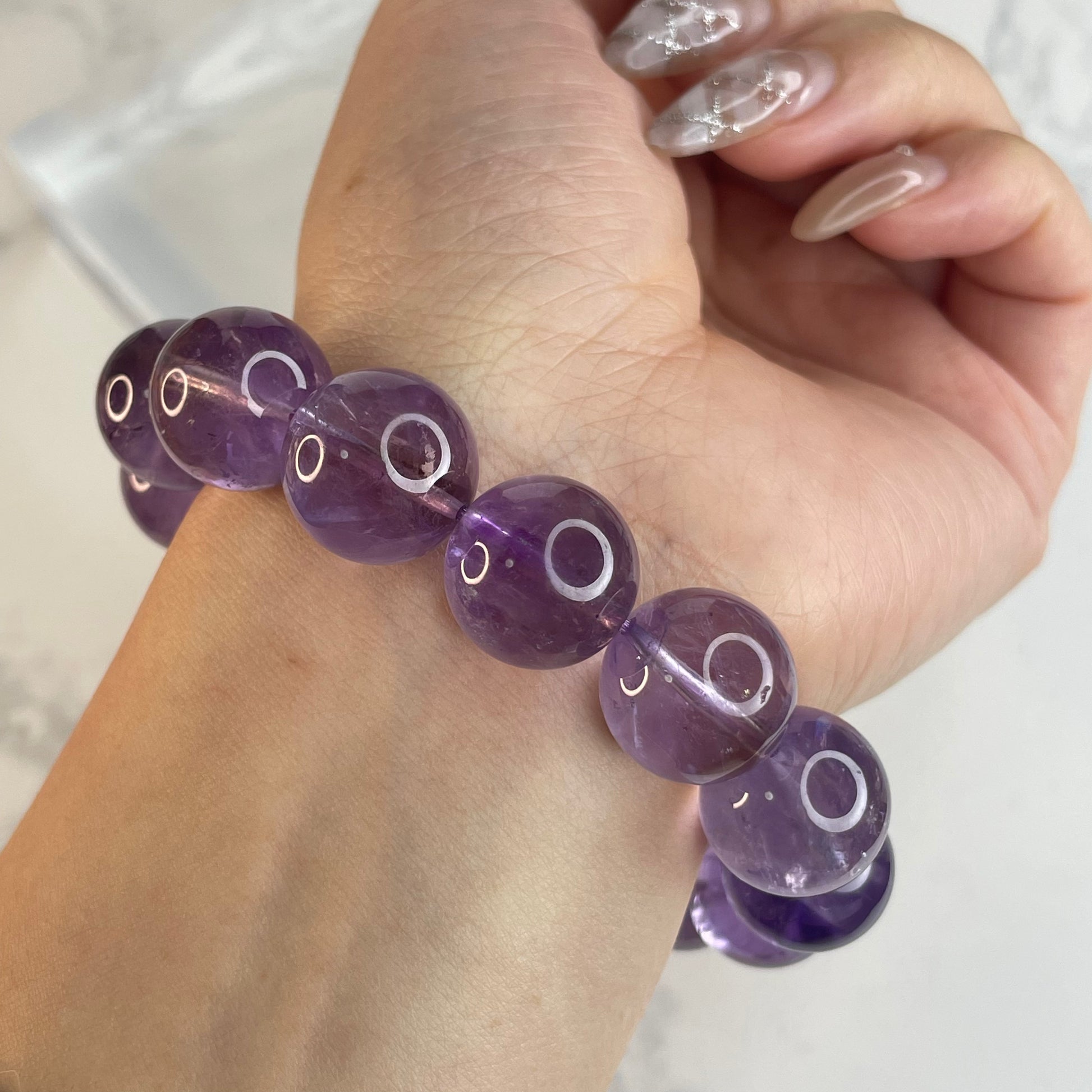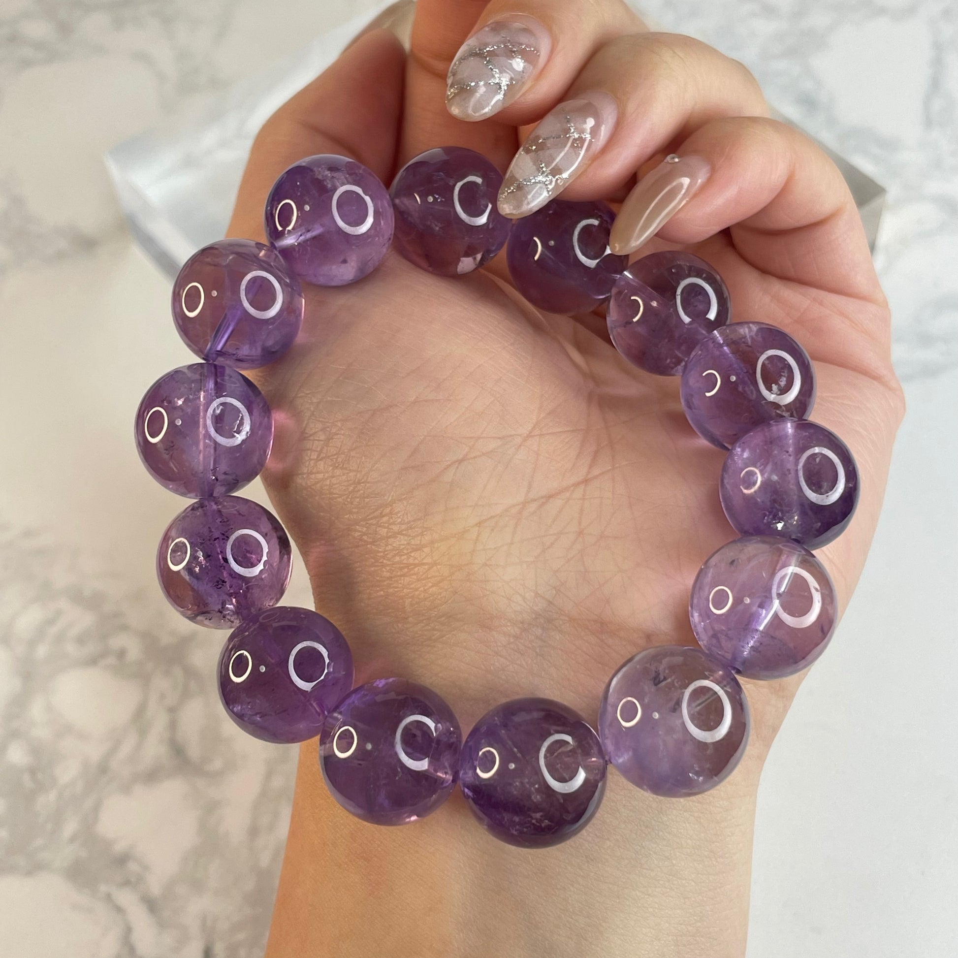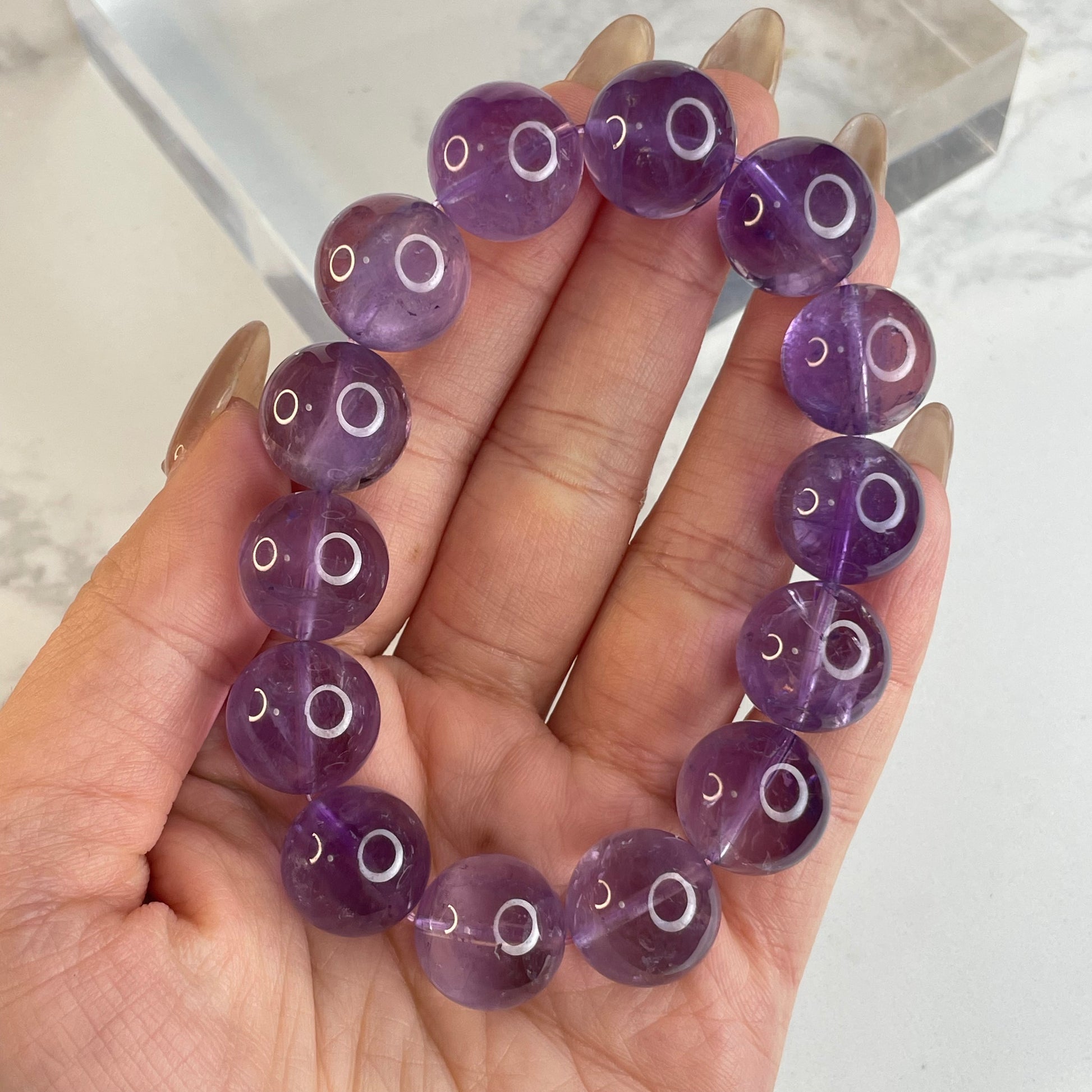 這條15mm巴西紫水晶手串以大顆圓潤珠子為主,紫色飽滿柔和,其中三顆天然帶有淡淡茶色調,令整體更具自然氣息與層次感。