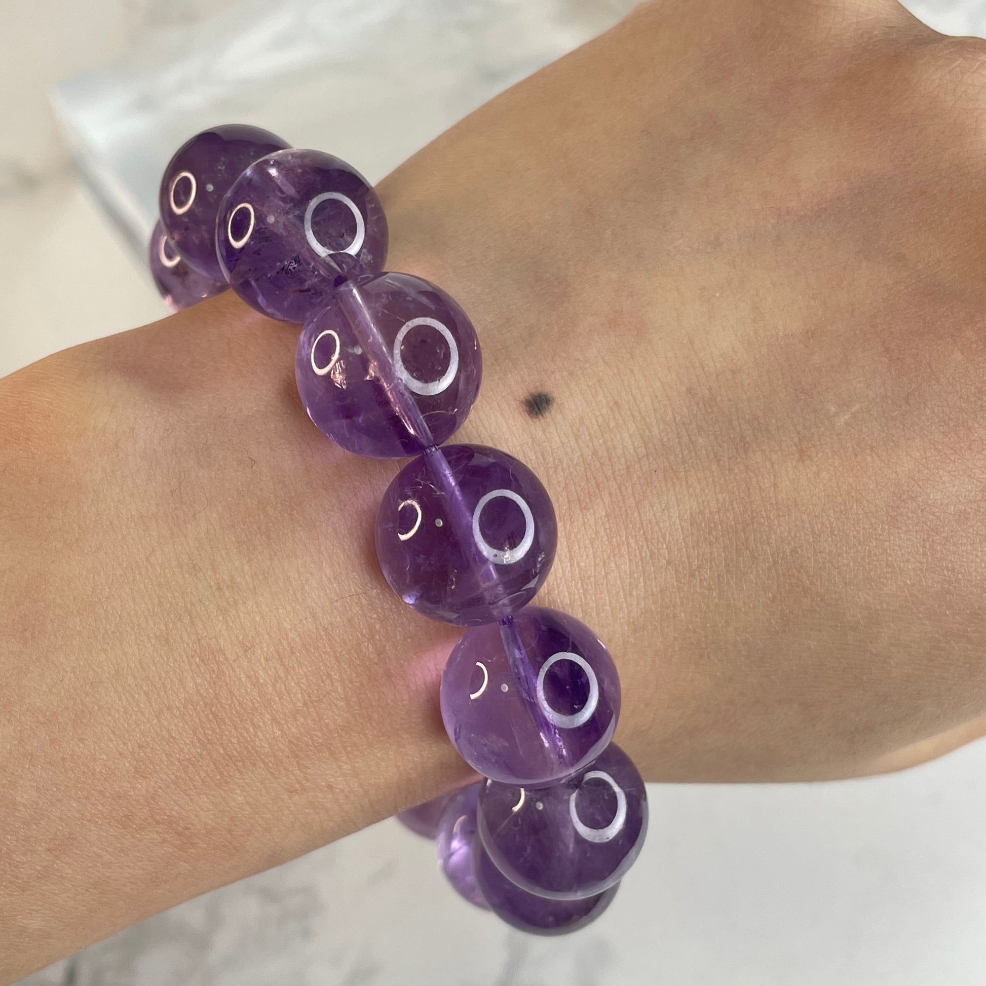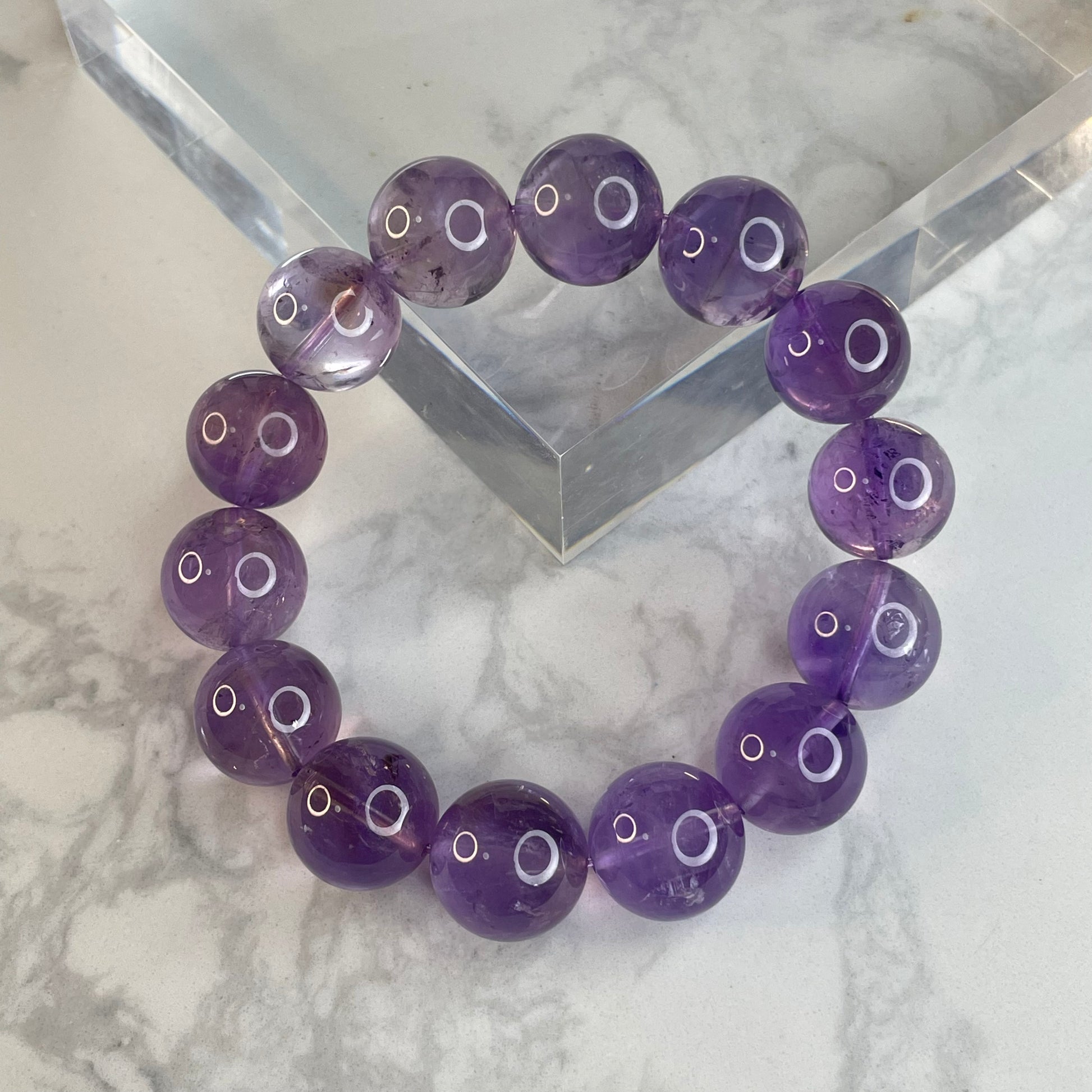 This 15mm Brazilian amethyst bracelet features large, glossy beads in rich violet hues, with three beads naturally tinted with smoky-brown undertones. The slight color variation adds unique personality to the piece while retaining its classic charm.