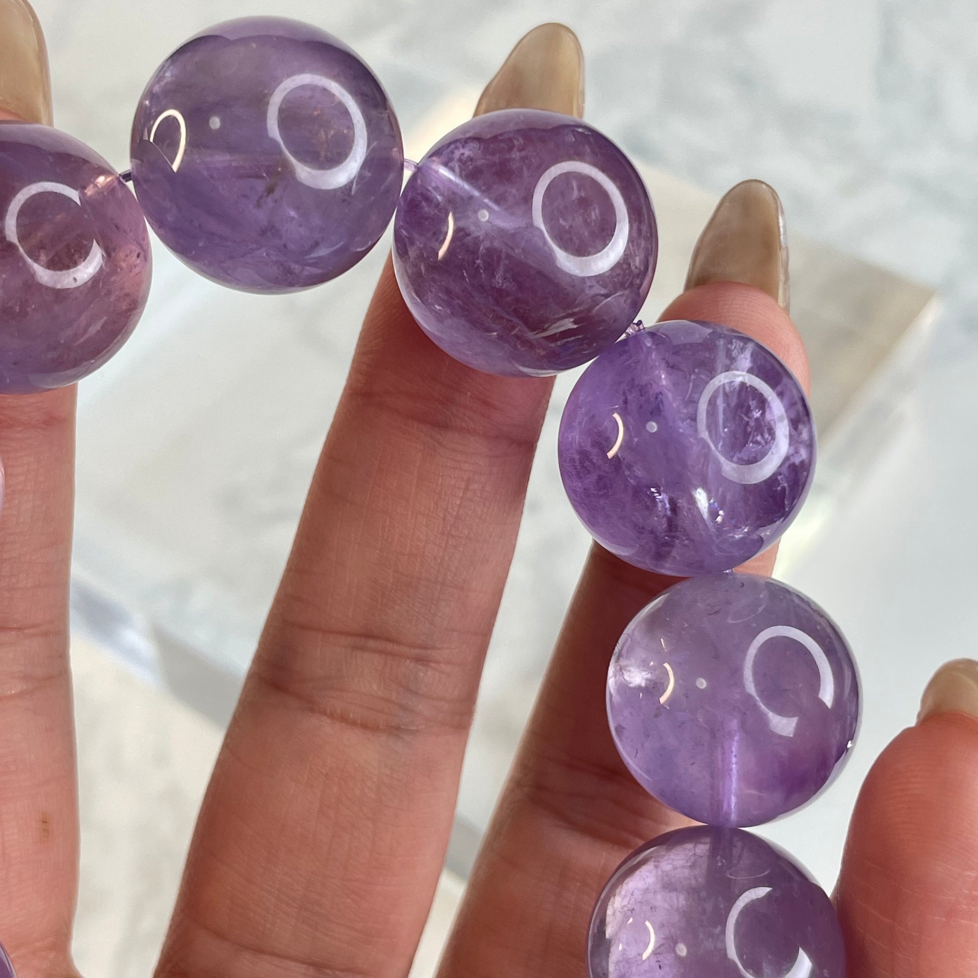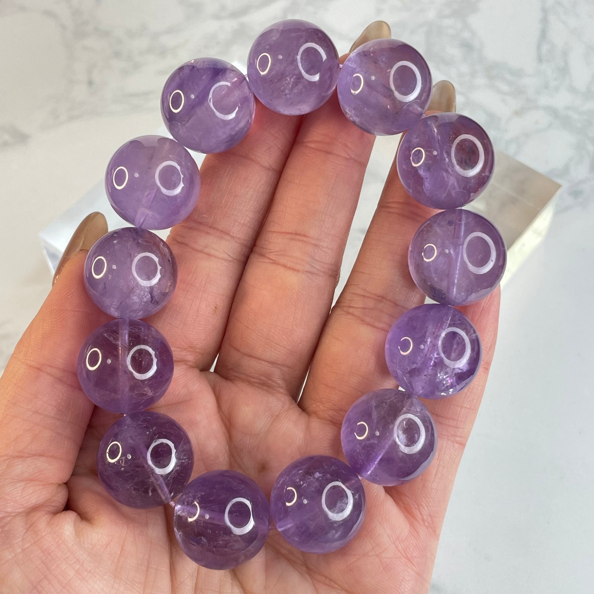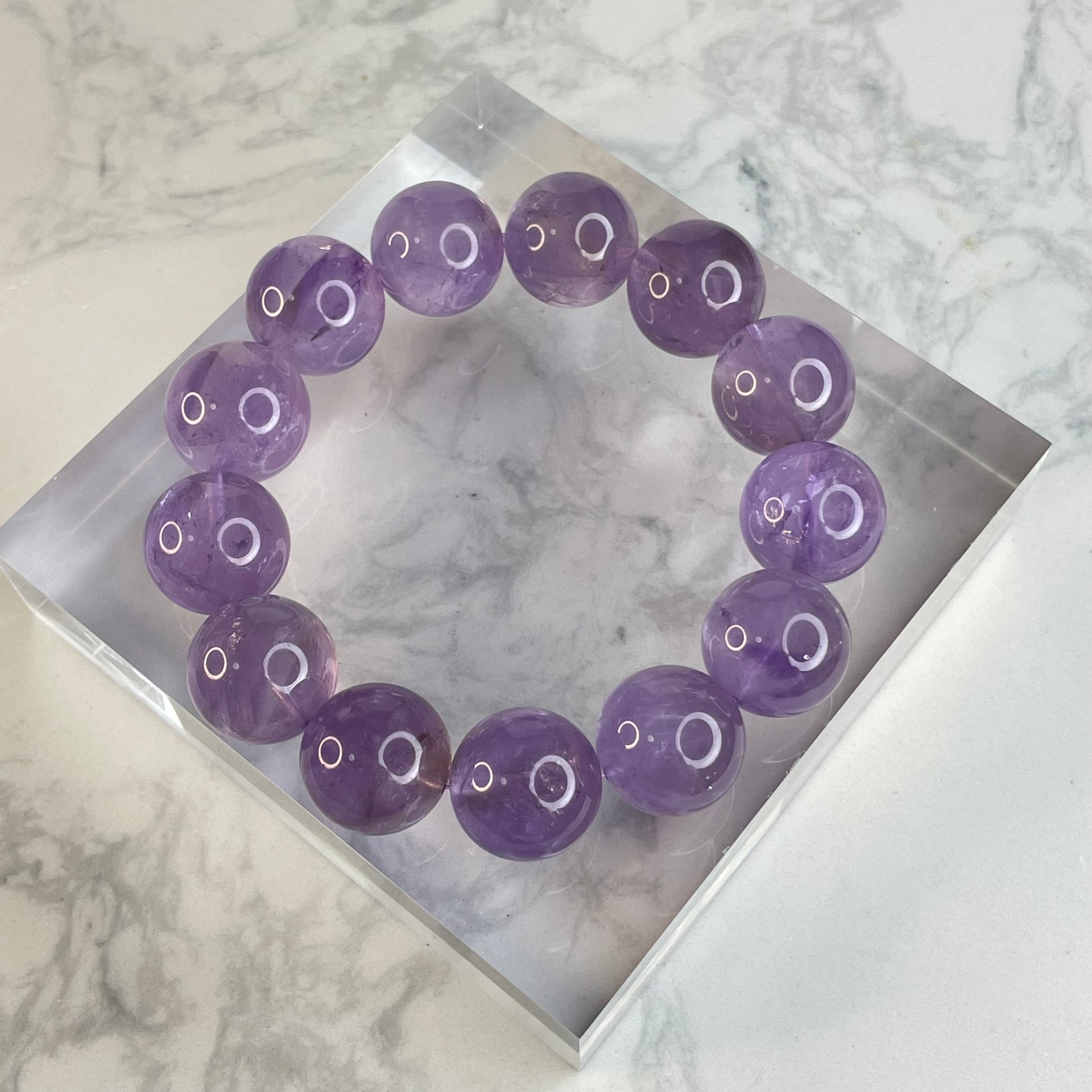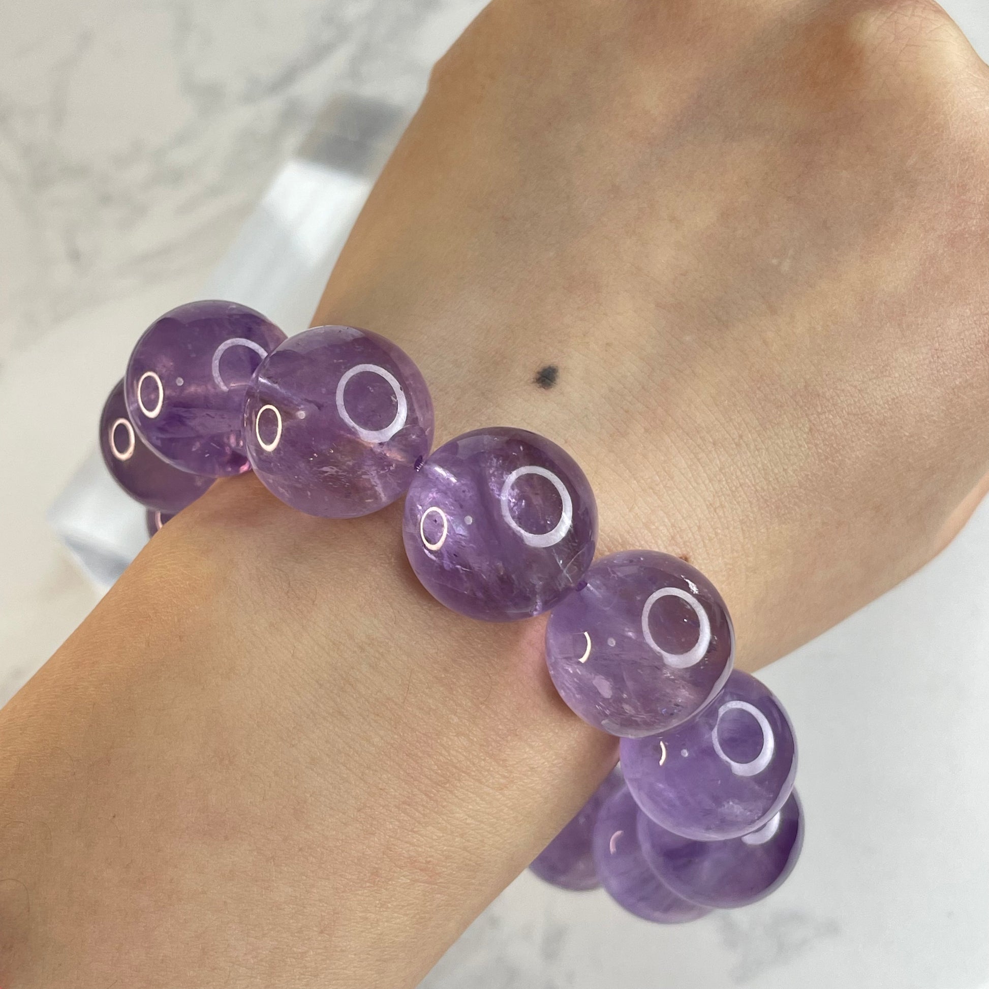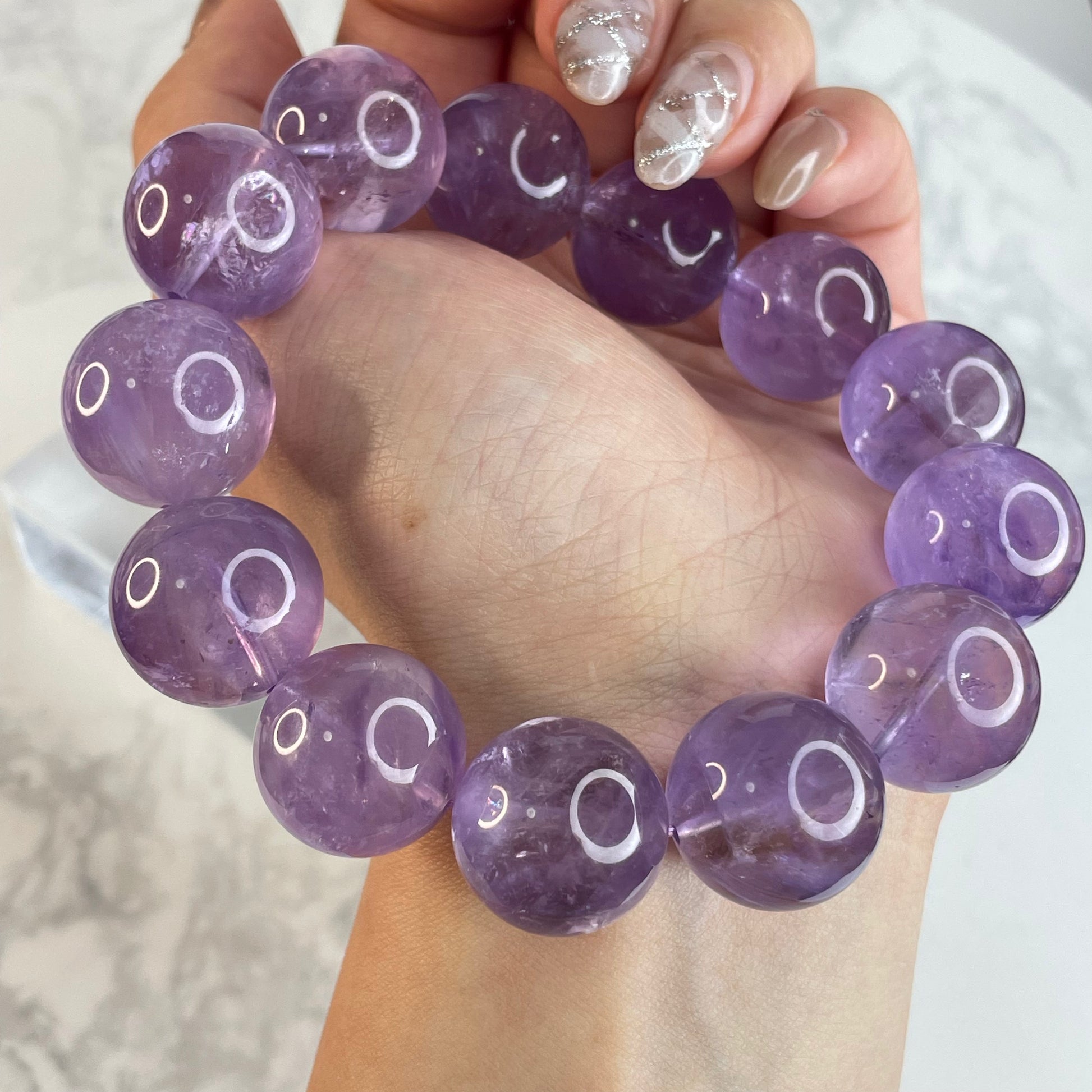 This 18mm Brazilian amethyst bracelet features large, rounded beads in soft purple tones. While not highly transparent, the crystal interiors reveal snowy textures with visible internal cracks and fine inclusions, resembling a mountain landscape dusted with snow. Some beads even shimmer with subtle rainbows under light.