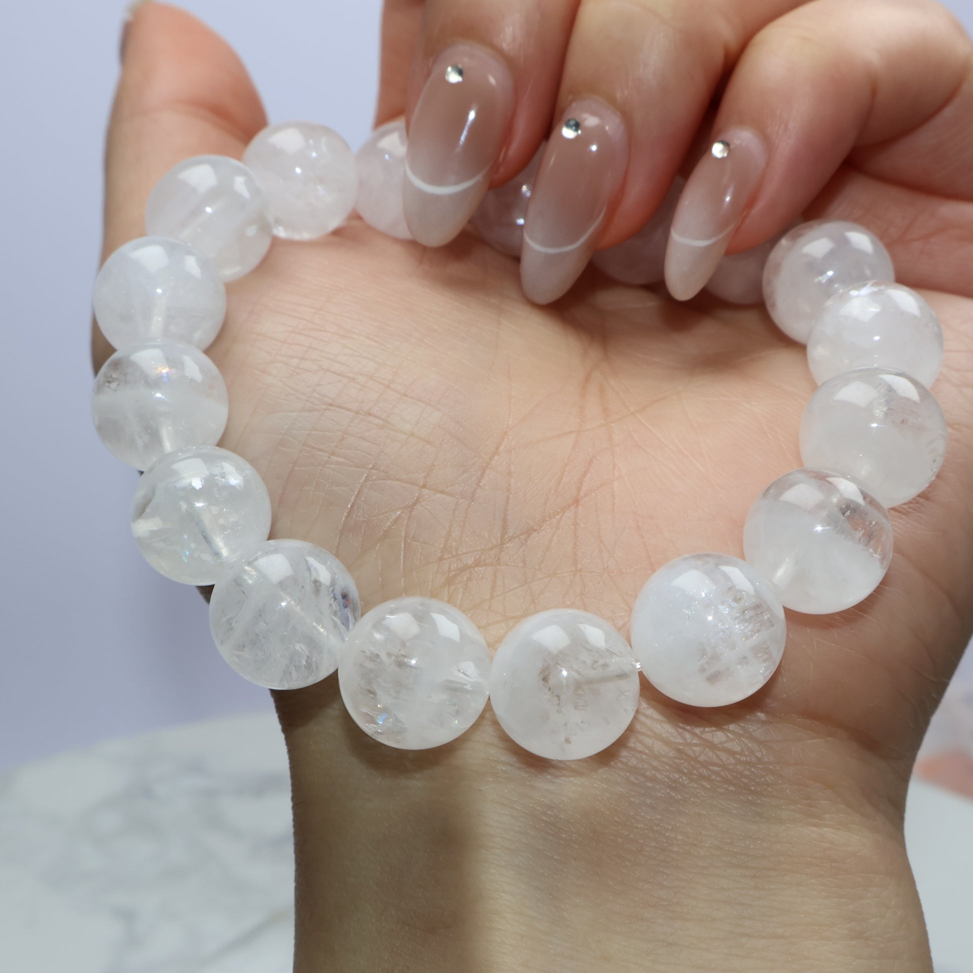 這款白幽靈手串由通透至乳白色的水晶珠組成,內部可見白霧狀礦物幻影與包裹體,呈現出柔和夢幻的視覺層次。白幽靈水晶被認為有助靈性成長、穩定情緒與提升覺知。