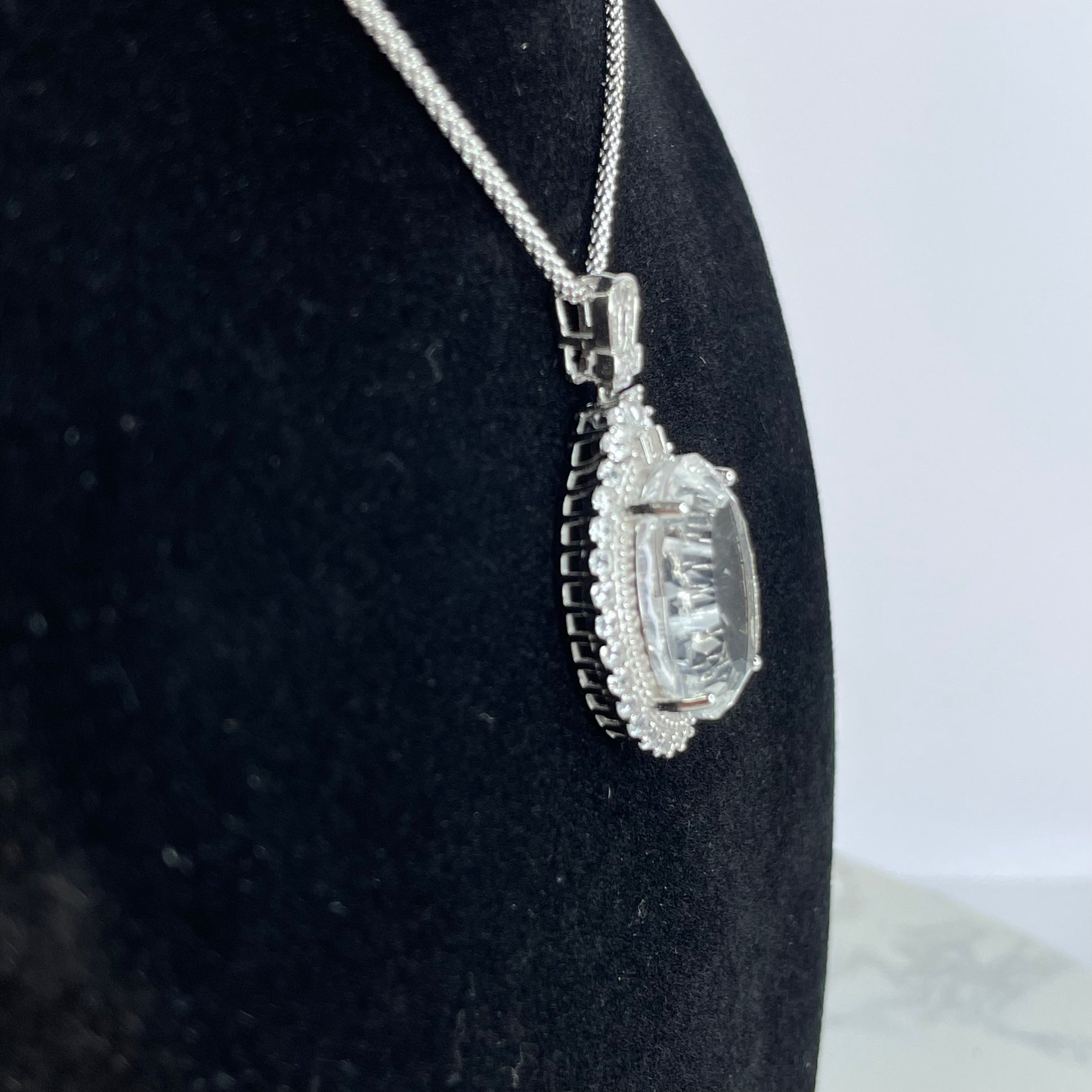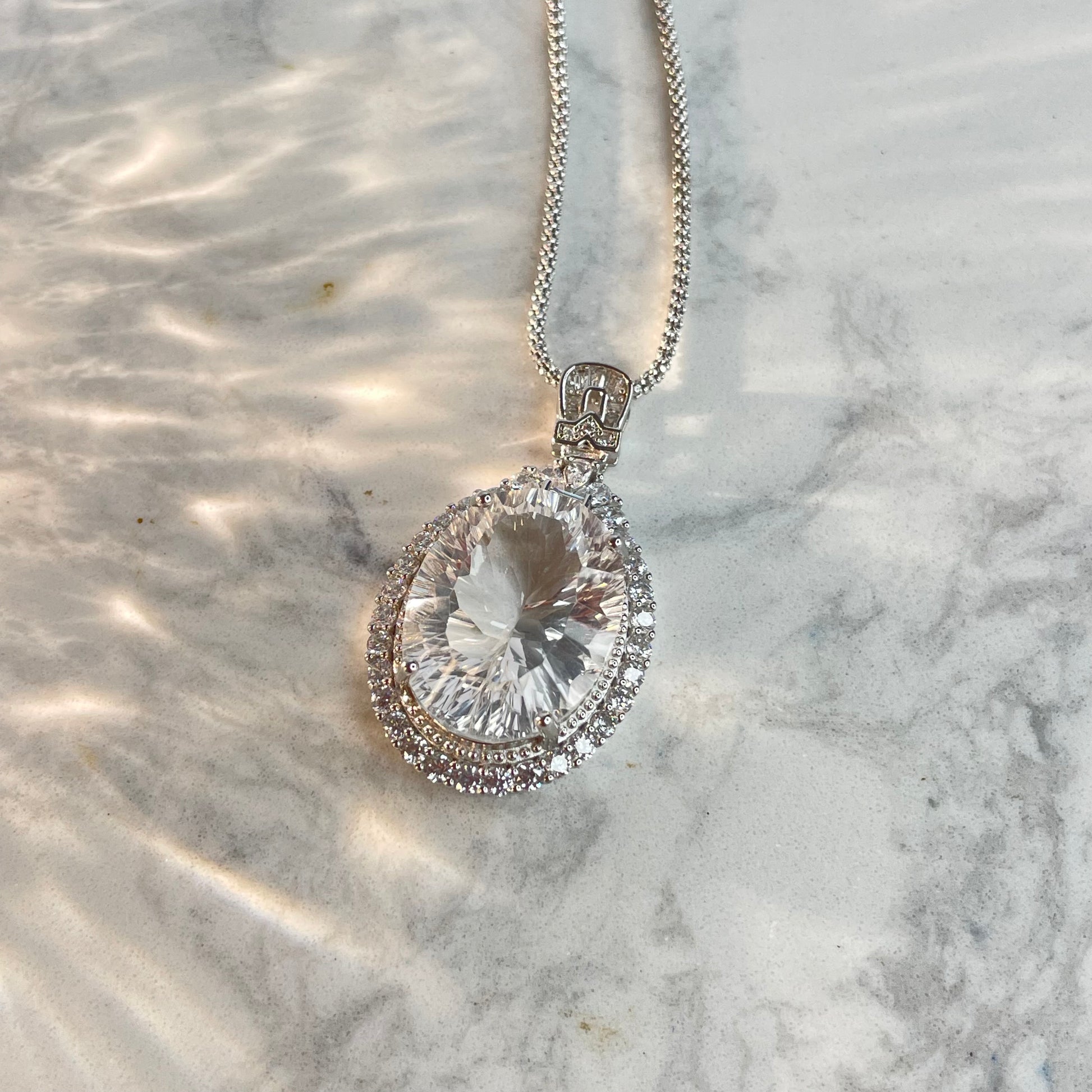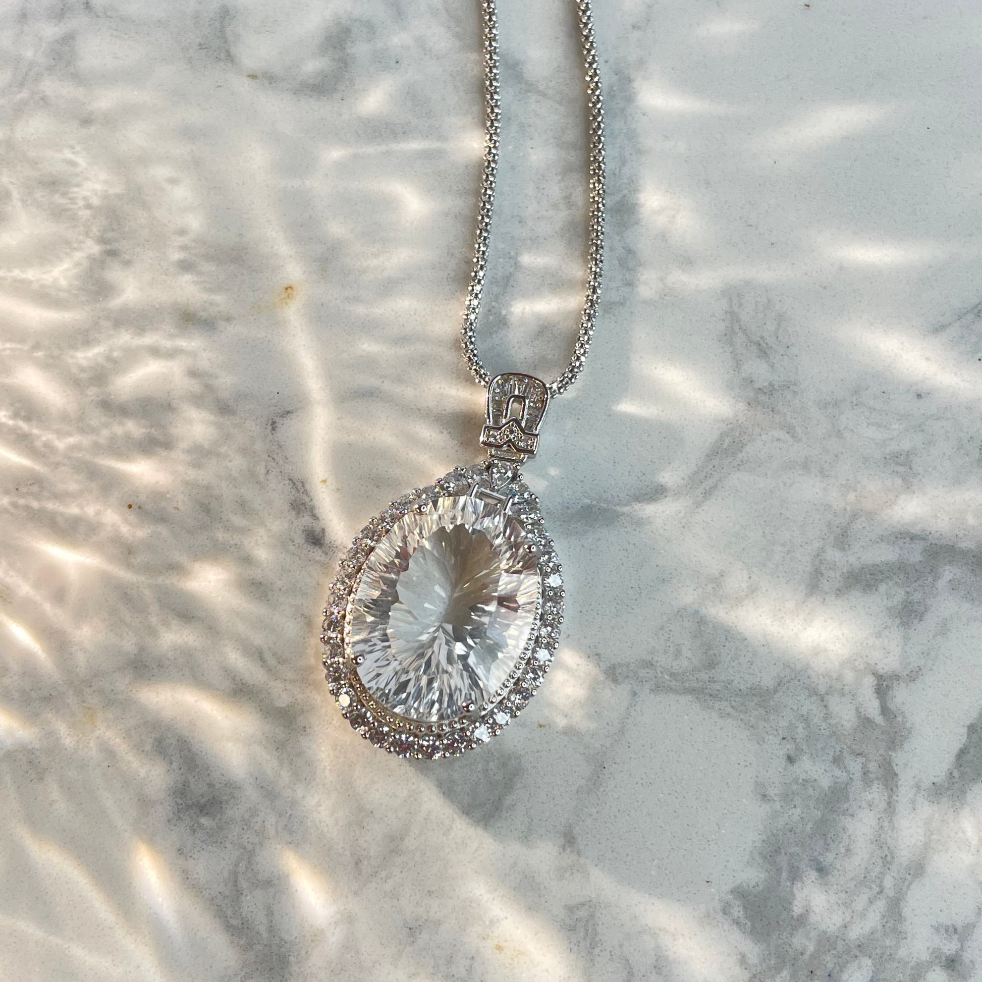 This radiant pendant features a stunning clear quartz crystal as the centerpiece, precision-cut to highlight its natural brilliance. Set in 925 sterling silver and framed with sparkling cubic zirconia, the teardrop shape enhances elegance and clarity. A timeless piece that amplifies energy, purity, and protection.