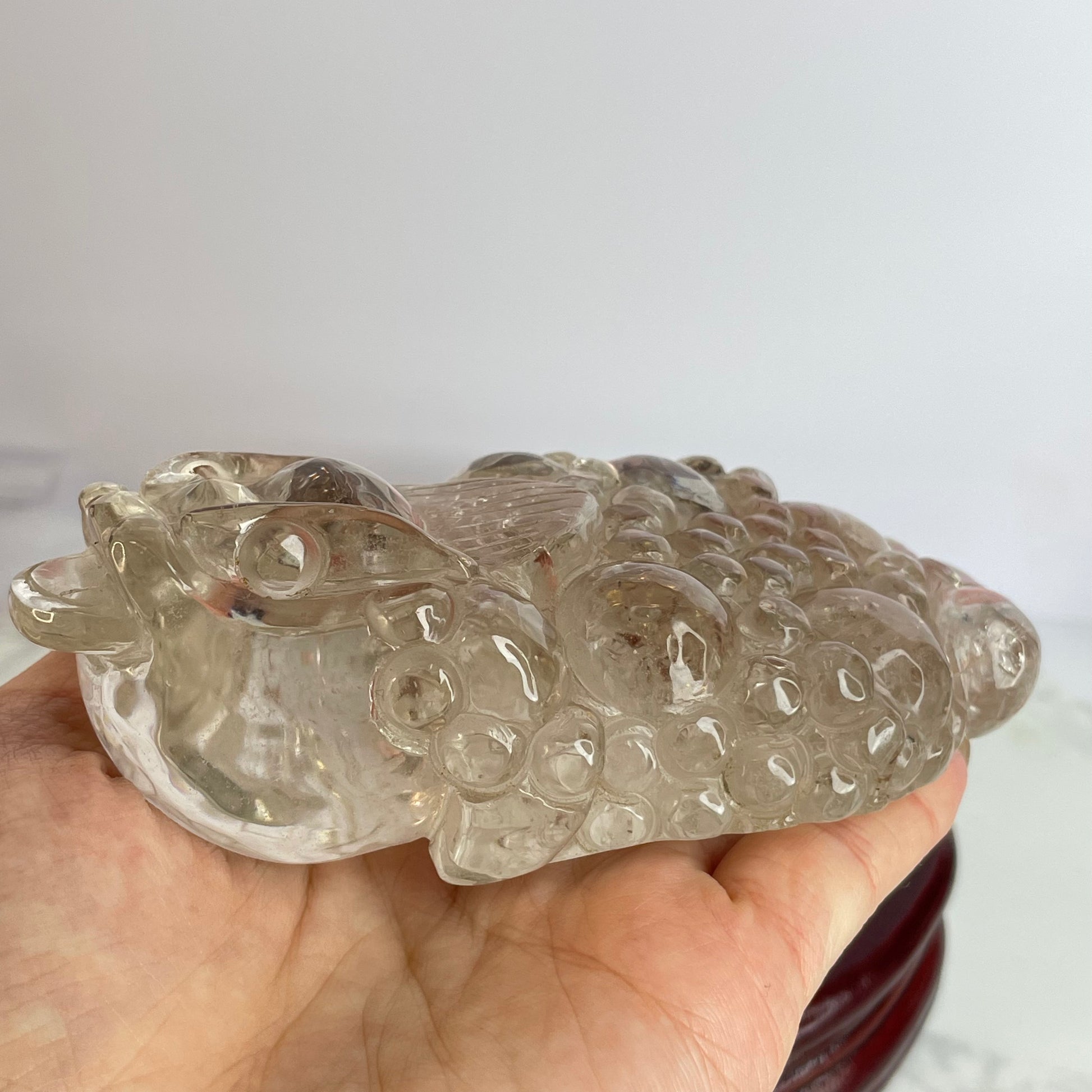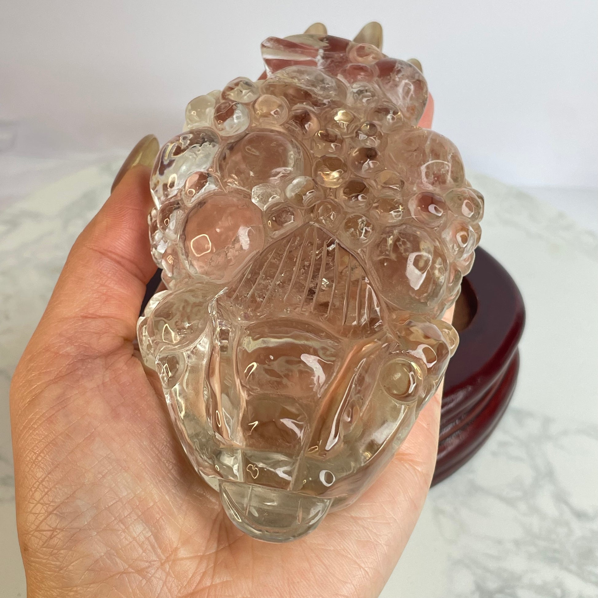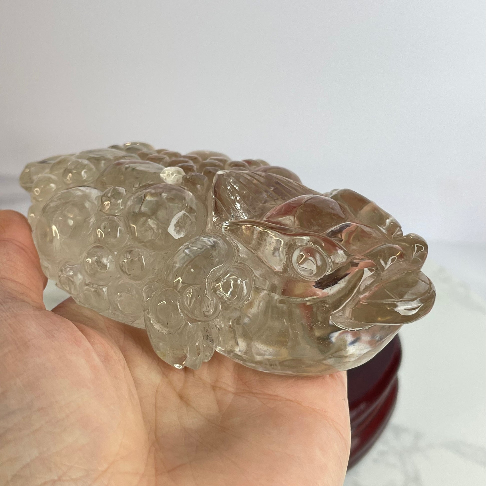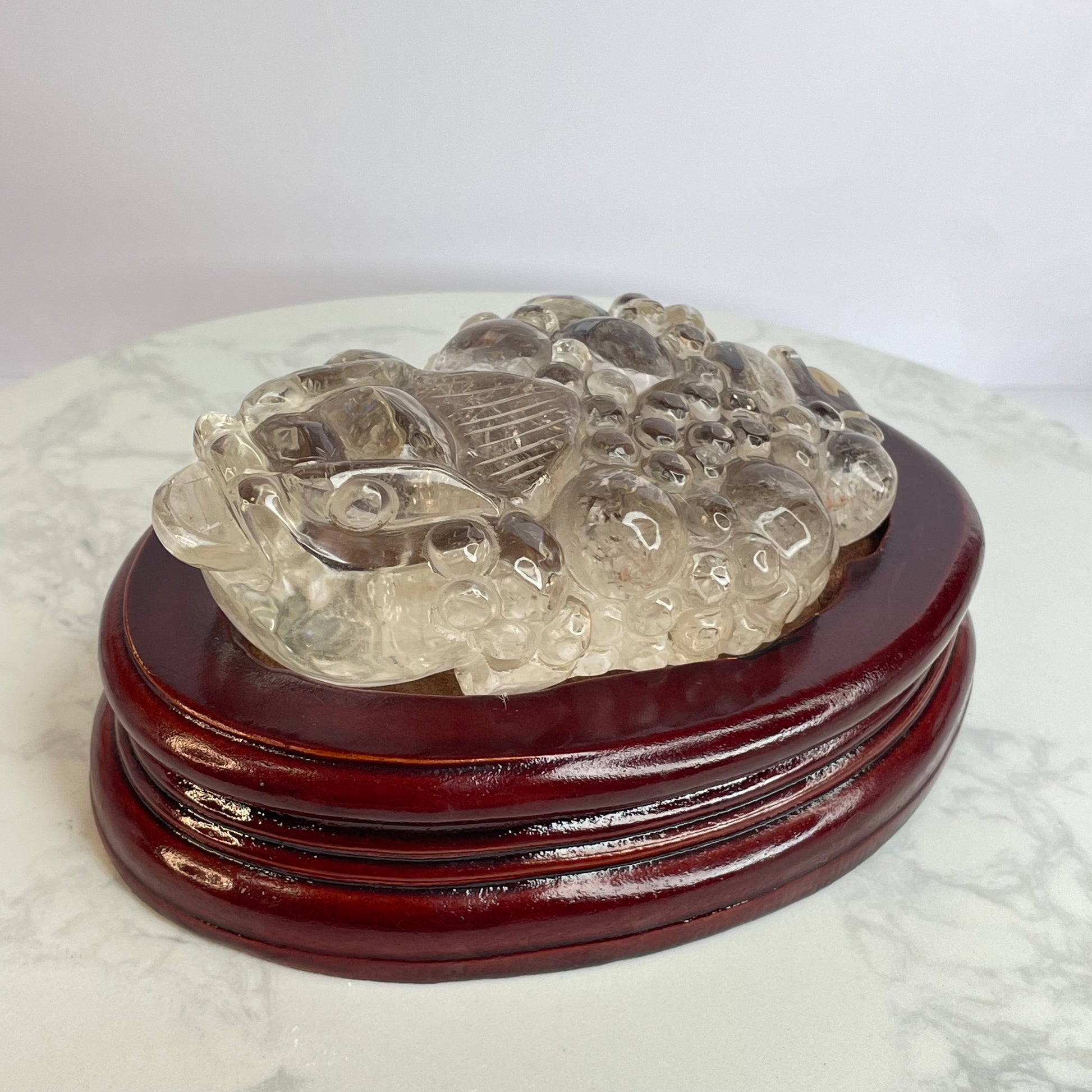 This exquisite Clear Quartz Three-Legged Toad is intricately carved with vibrant detail and rests steadily on a polished wooden base. The toad, also known as the “Money Toad” or “Chan Chu”, is a powerful symbol of wealth and good fortune in Feng Shui.