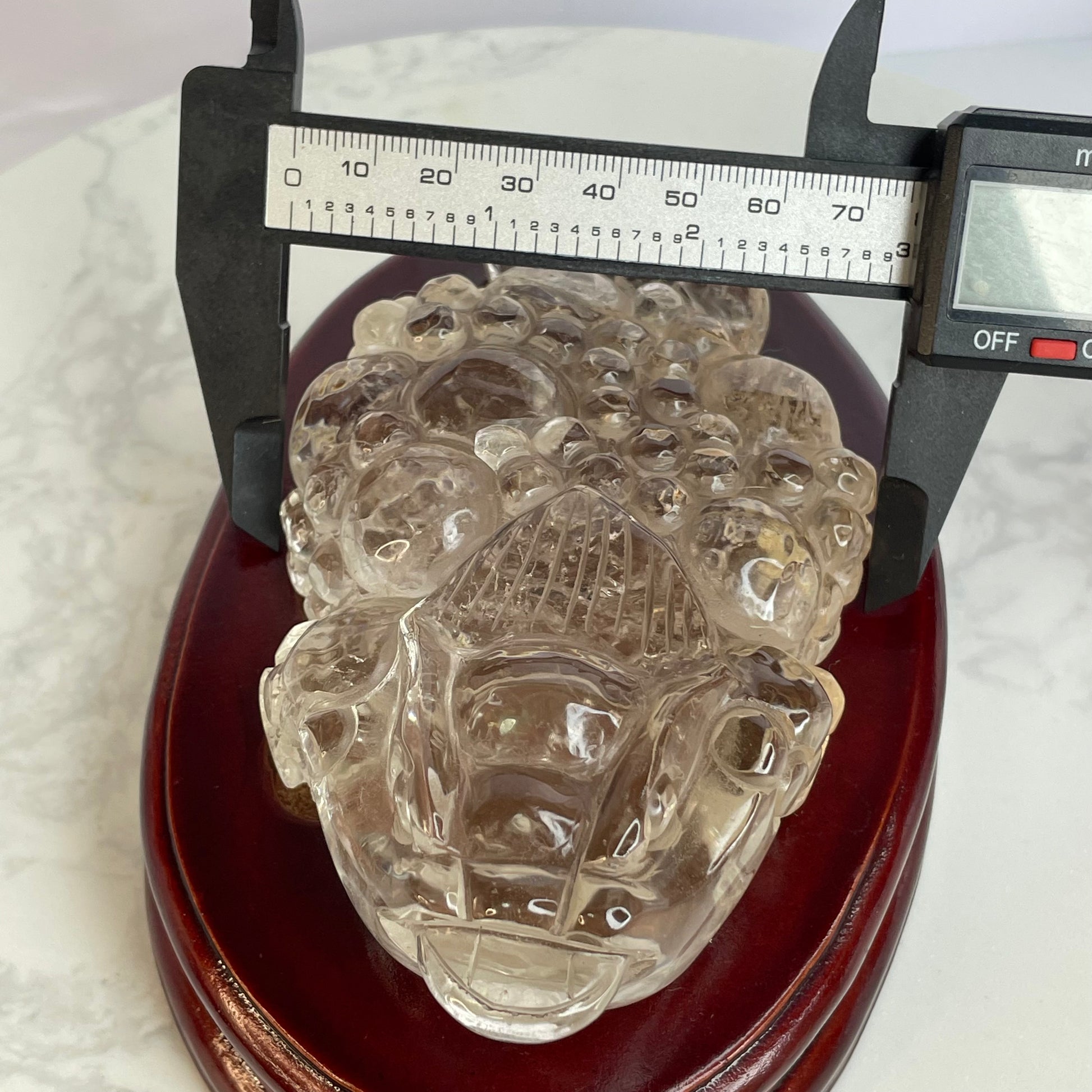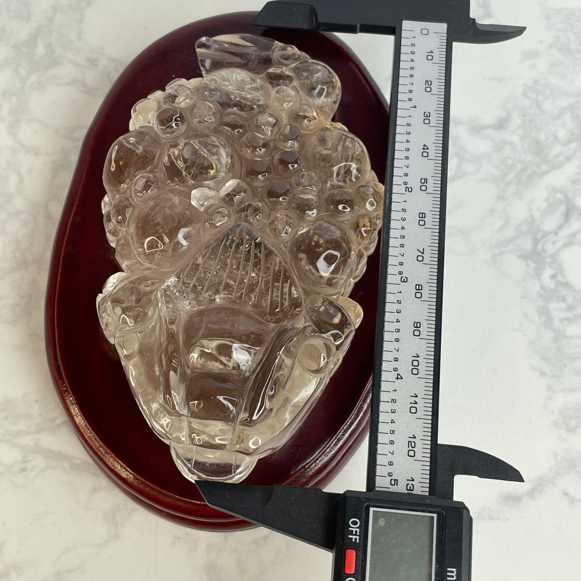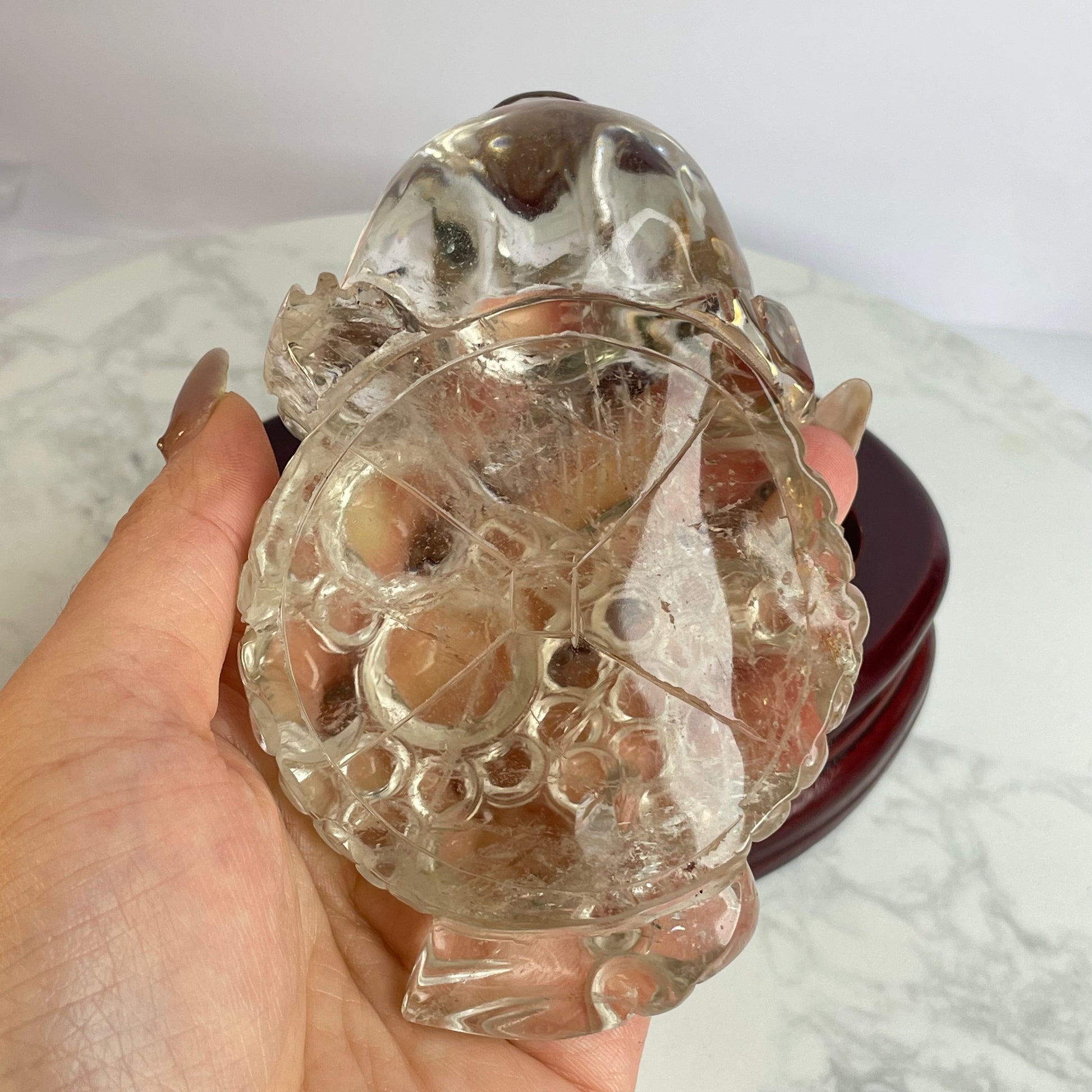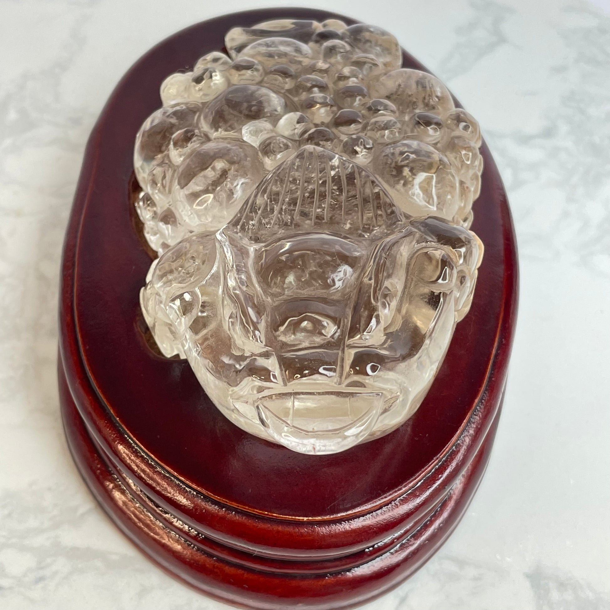 This exquisite Clear Quartz Three-Legged Toad is intricately carved with vibrant detail and rests steadily on a polished wooden base. The toad, also known as the “Money Toad” or “Chan Chu”, is a powerful symbol of wealth and good fortune in Feng Shui.