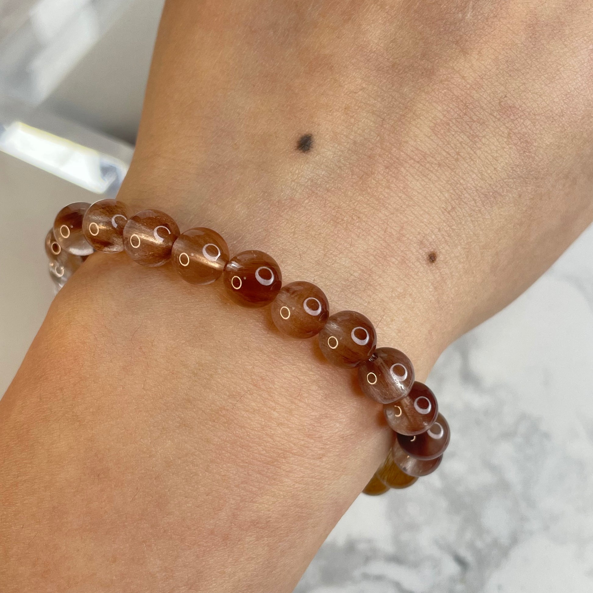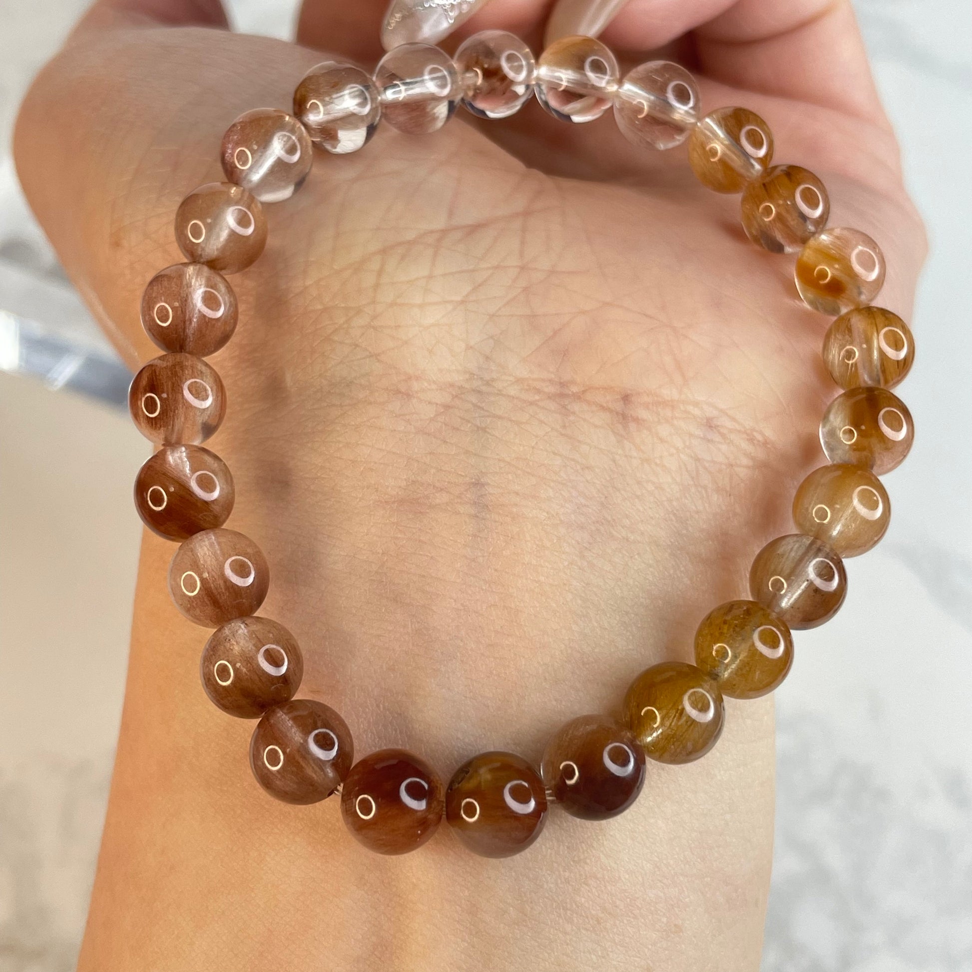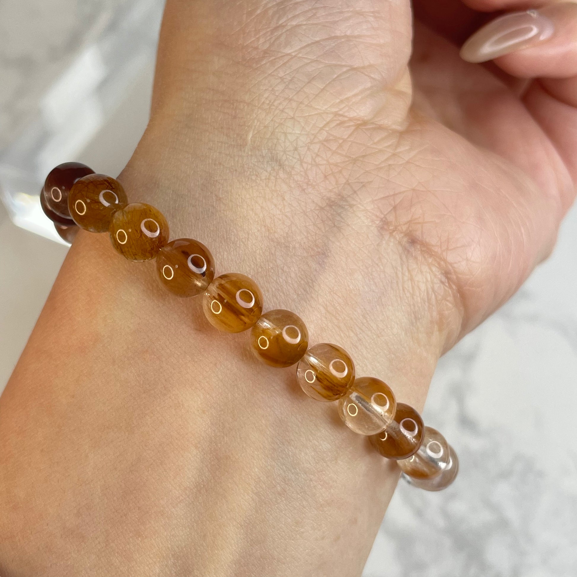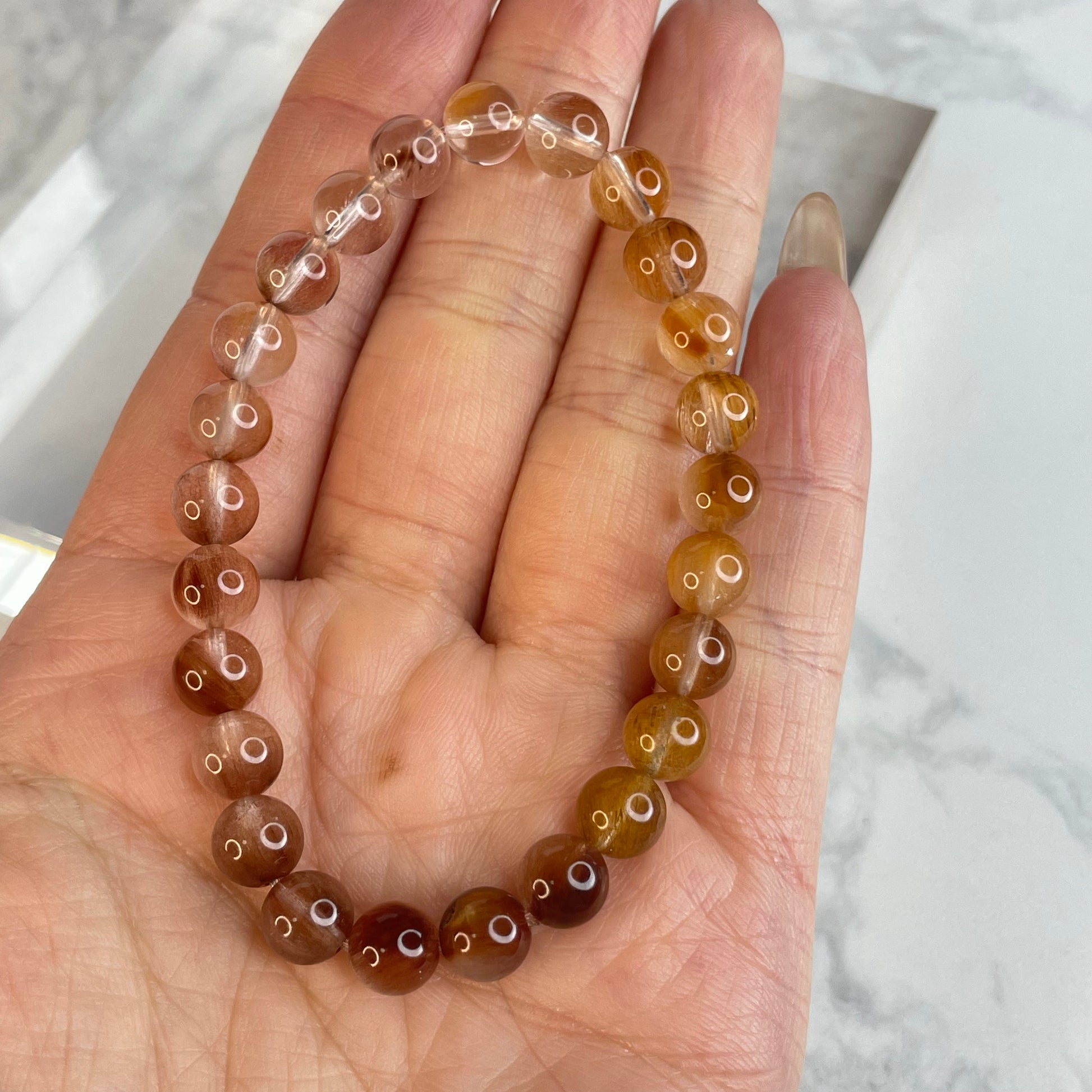 This 7mm Rainbow Rutile Quartz bracelet features a striking dual-tone gradient—from golden honey to warm reddish-brown. Each transparent bead reveals fine rutile inclusions, resembling delicate rabbit hair. The bracelet embodies both grounding strength and soft elegance.