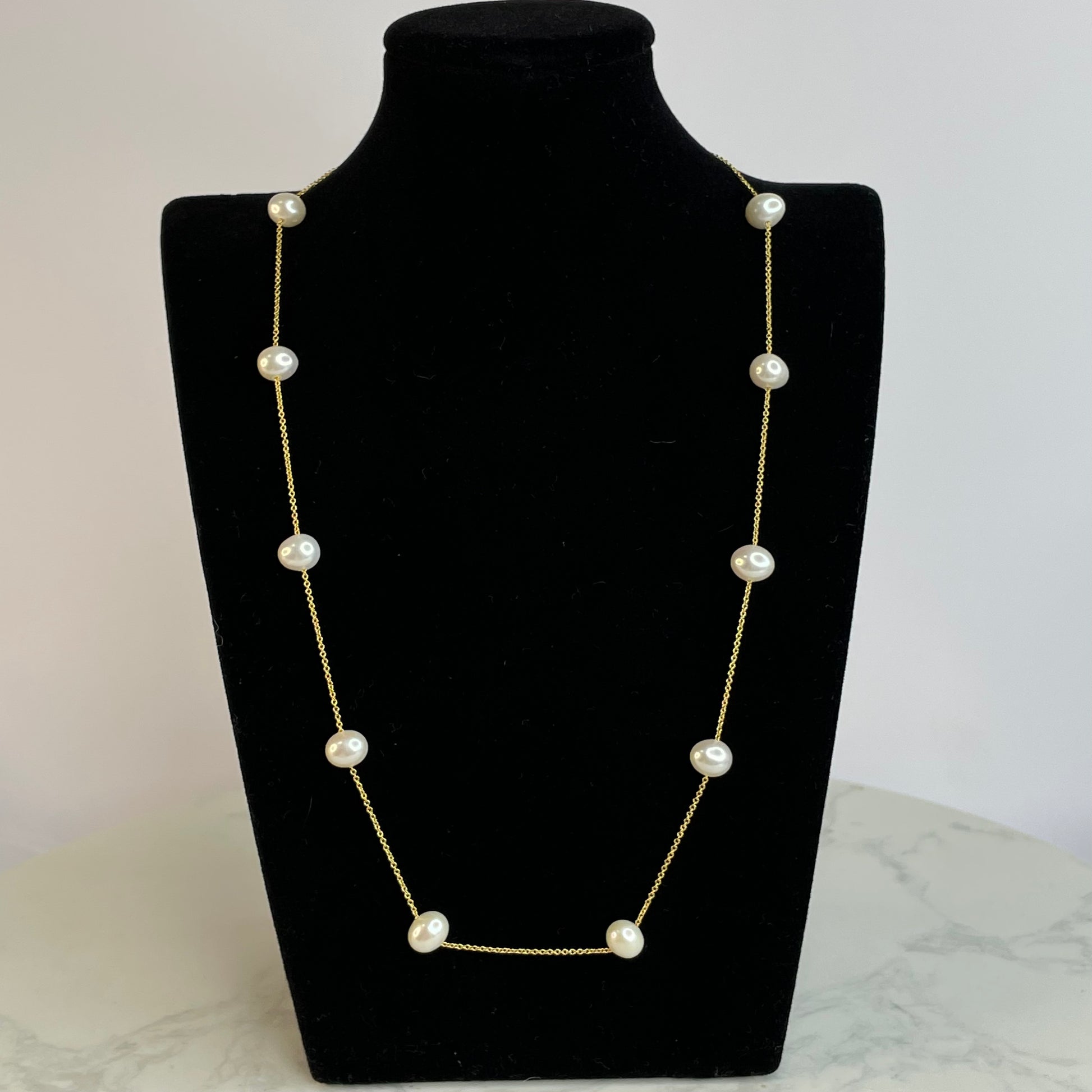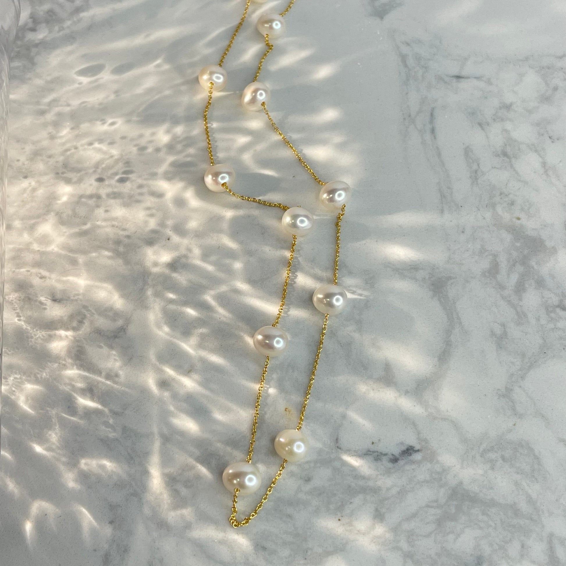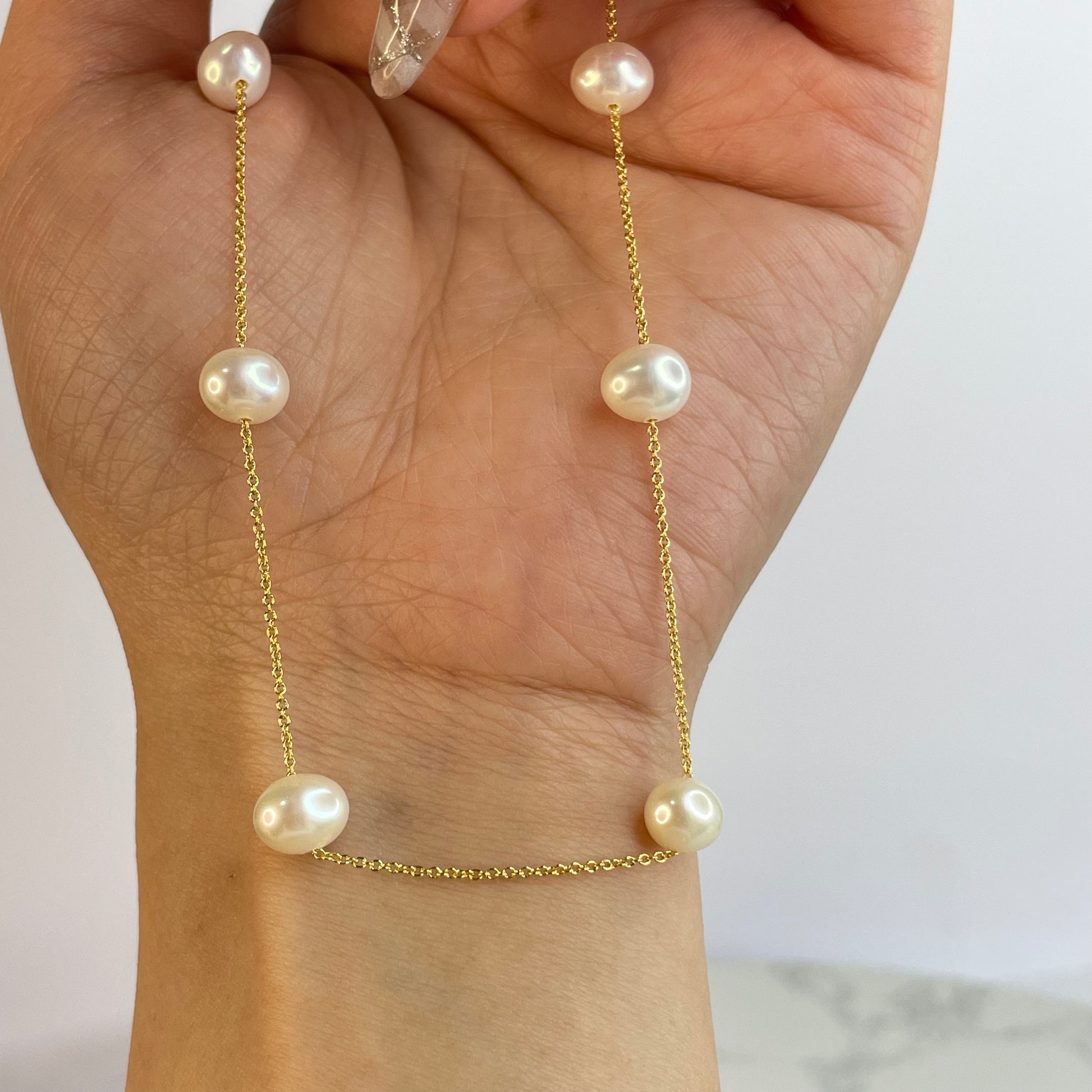This delicate necklace features natural freshwater pearls (approx. 7mm each) evenly spaced along a fine gold-colored alloy chain. Each pearl shines with its own gentle luster and subtle organic shape — perfect for everyday styling or layering with other pieces.