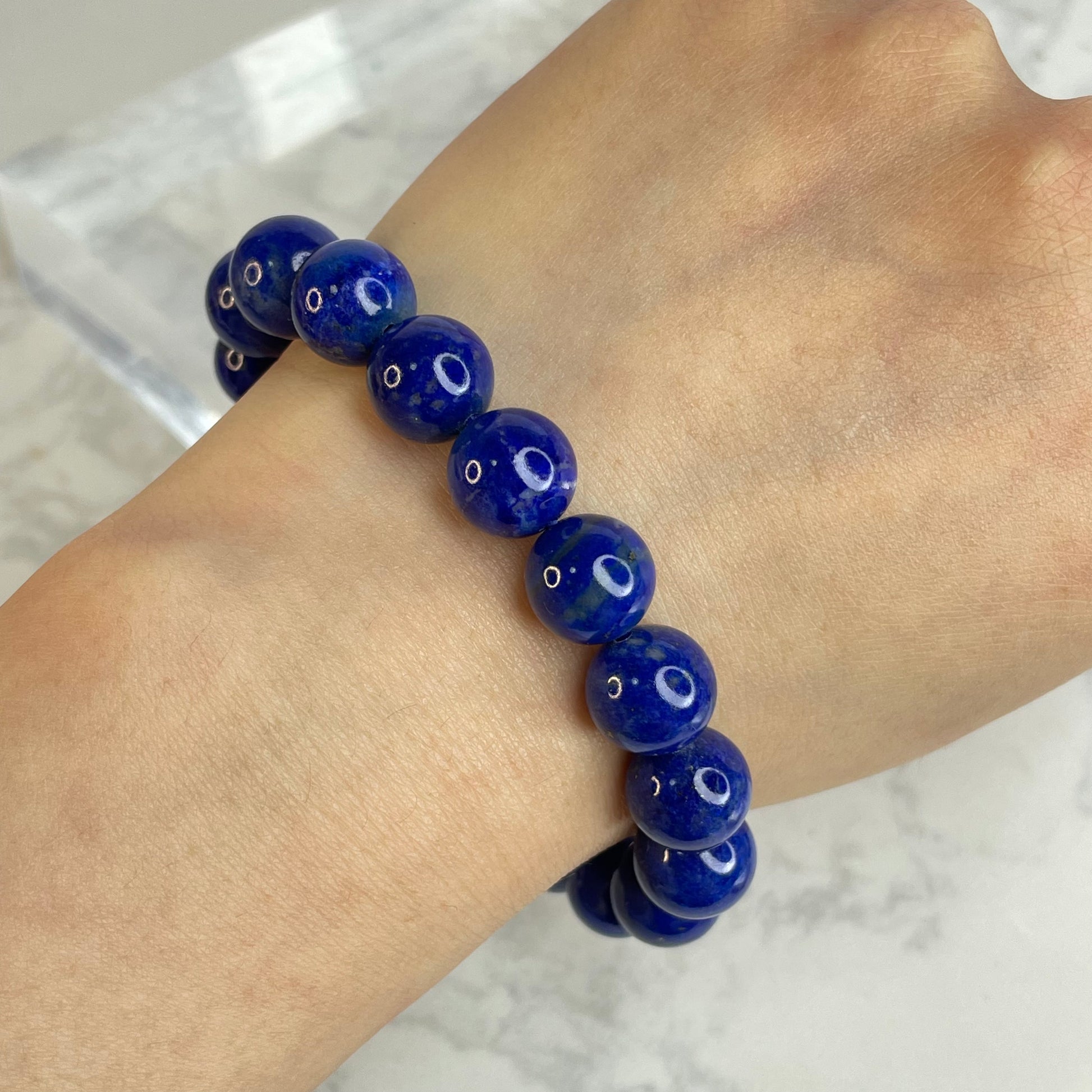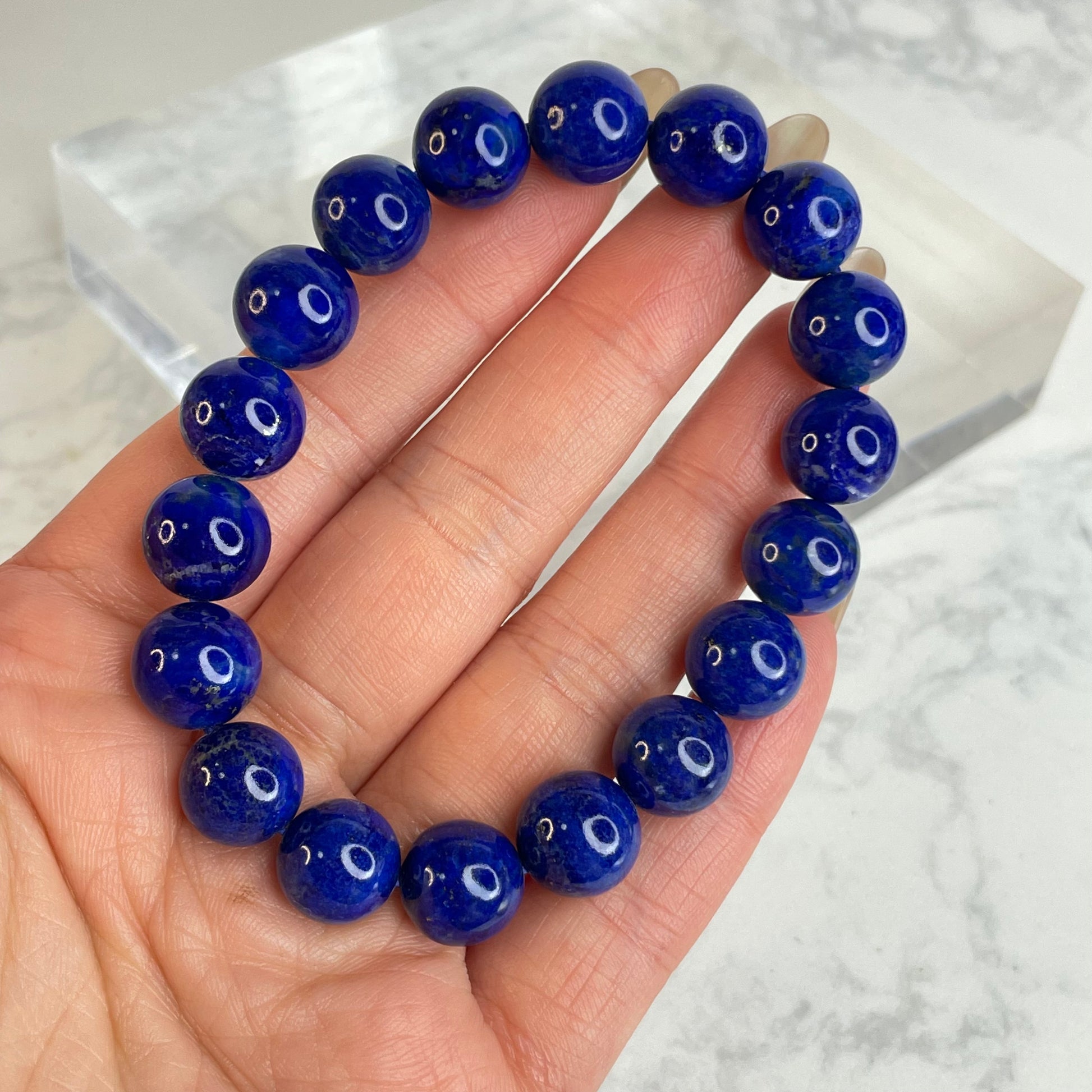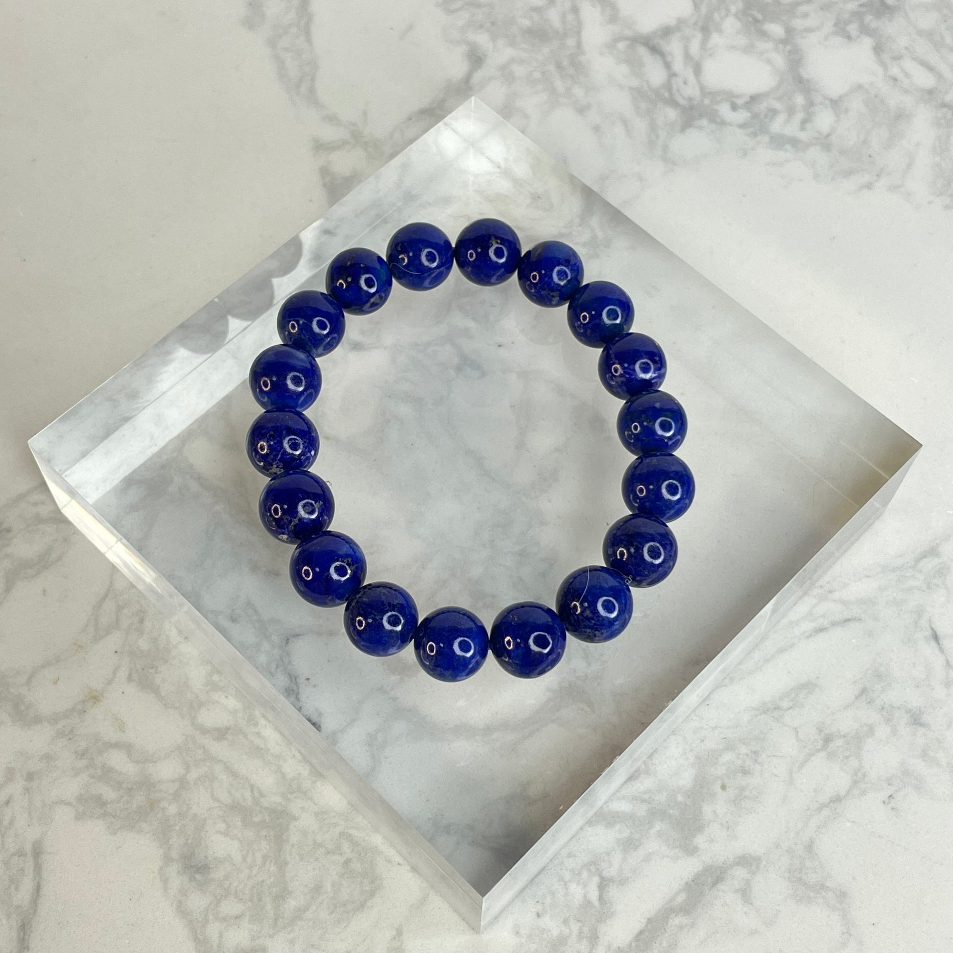 This striking 11mm Lapis Lazuli bracelet features a rich royal blue tone with minimal white calcite and golden pyrite inclusions, resulting in an exceptionally uniform and elegant appearance. Lapis Lazuli has long been revered as a stone of wisdom, truth, and spiritual growth. It helps enhance clarity, boost confidence, and encourages honest communication.