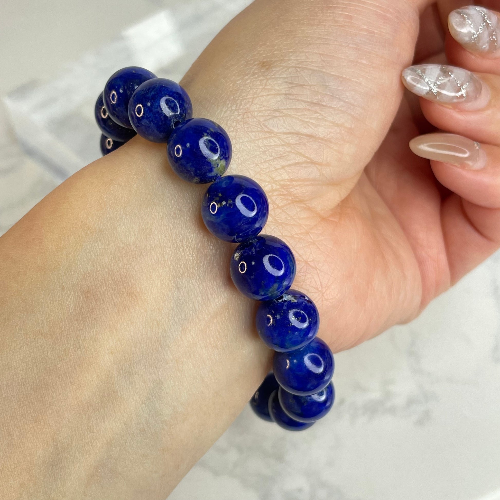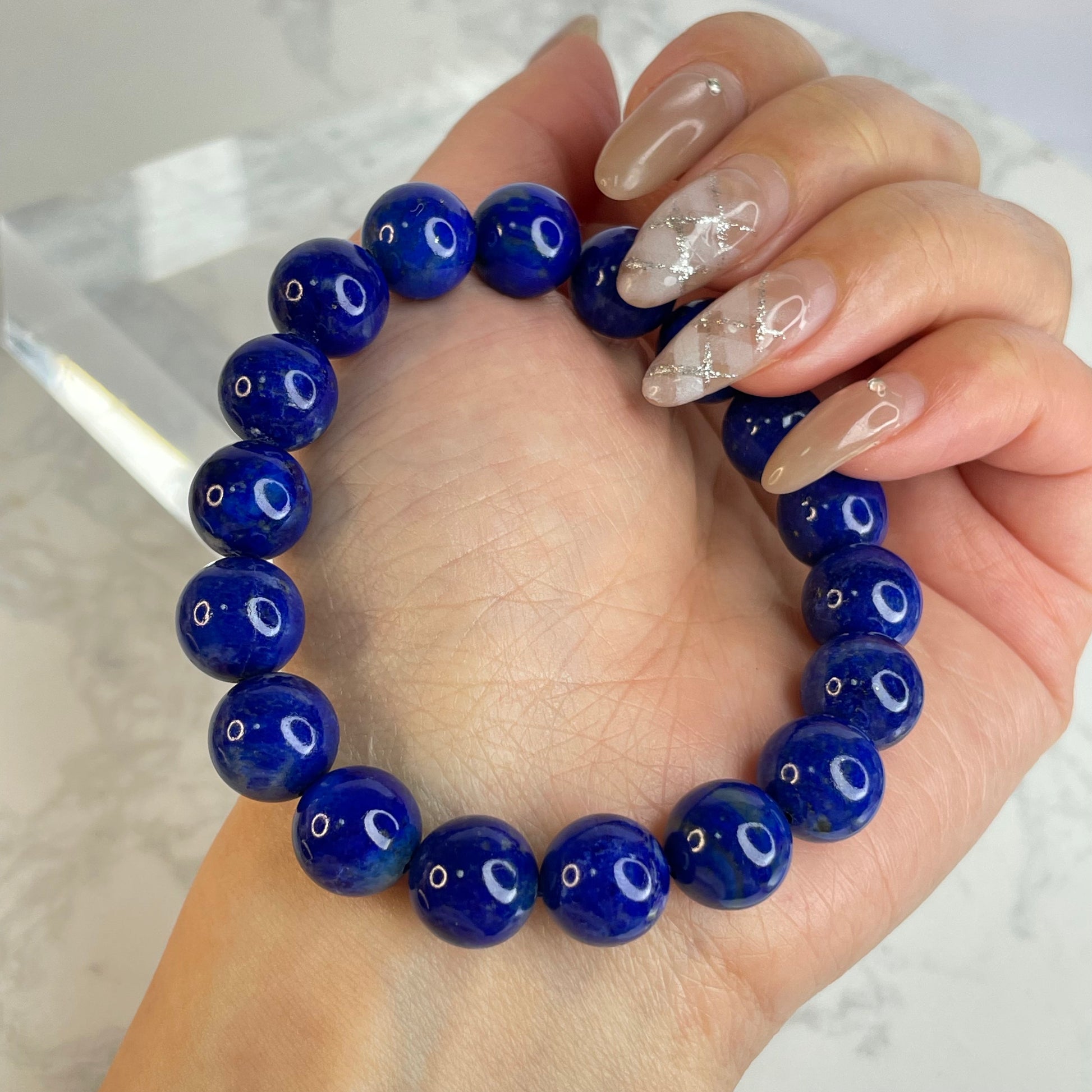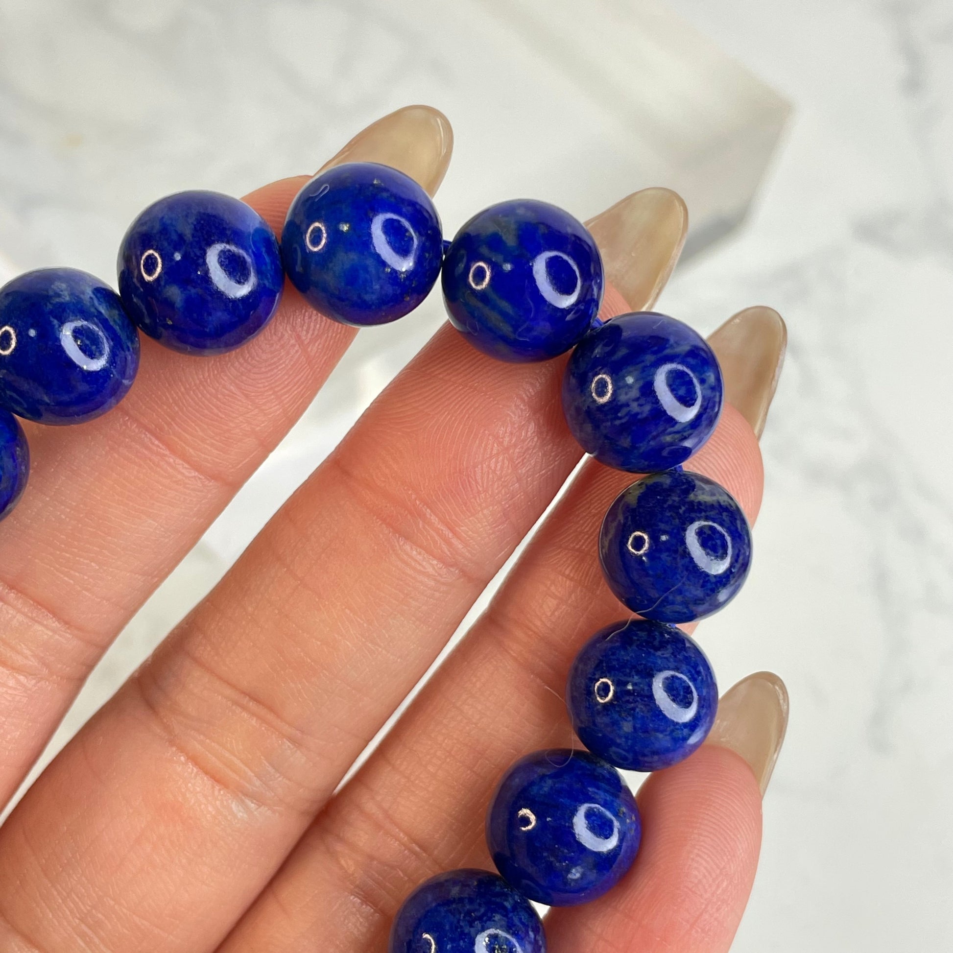 This striking 11mm Lapis Lazuli bracelet features a rich royal blue tone with minimal white calcite and golden pyrite inclusions, resulting in an exceptionally uniform and elegant appearance. Lapis Lazuli has long been revered as a stone of wisdom, truth, and spiritual growth. It helps enhance clarity, boost confidence, and encourages honest communication.
