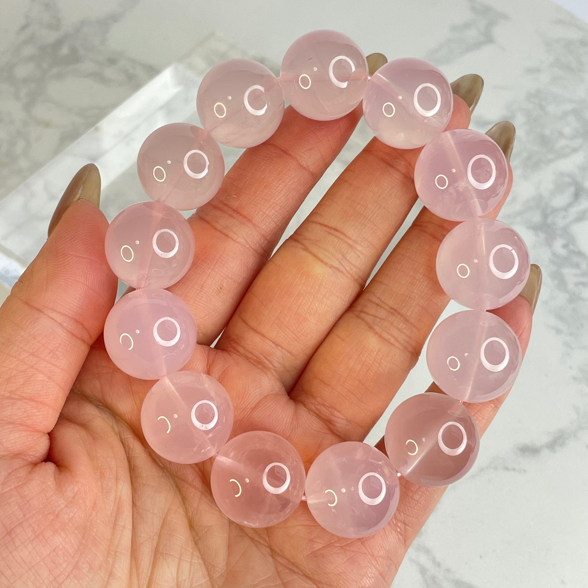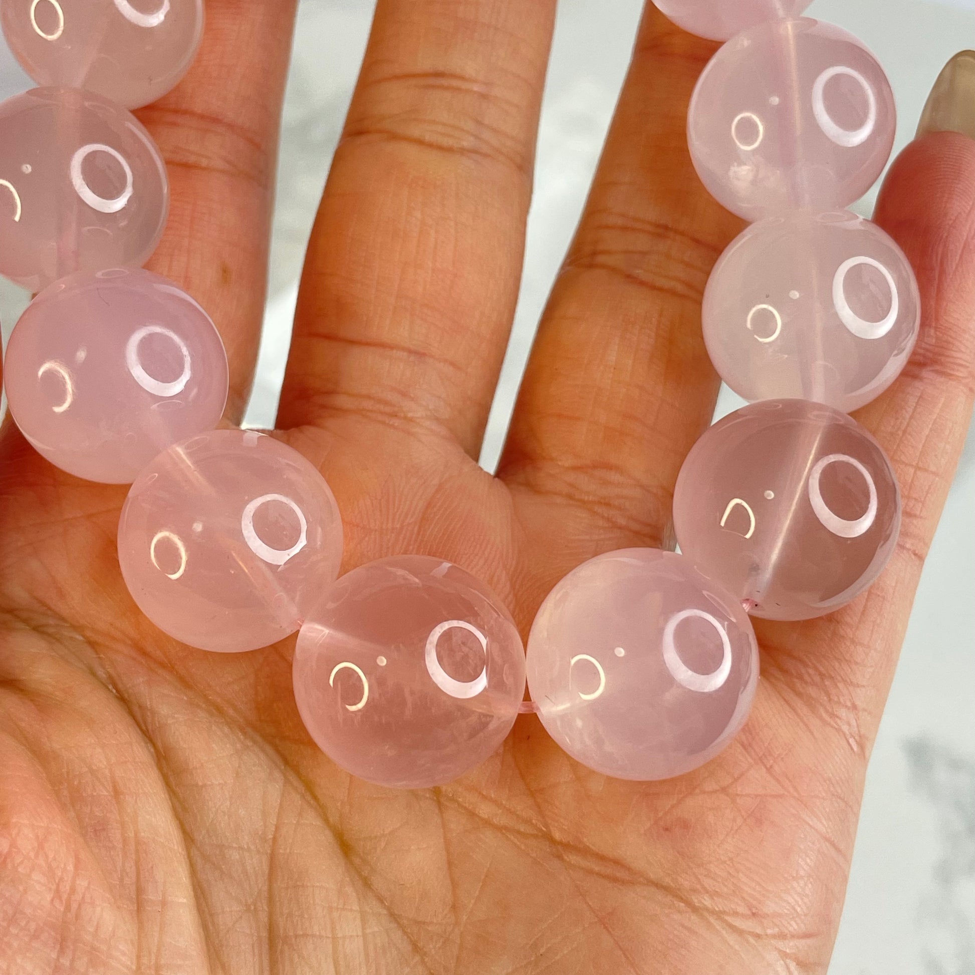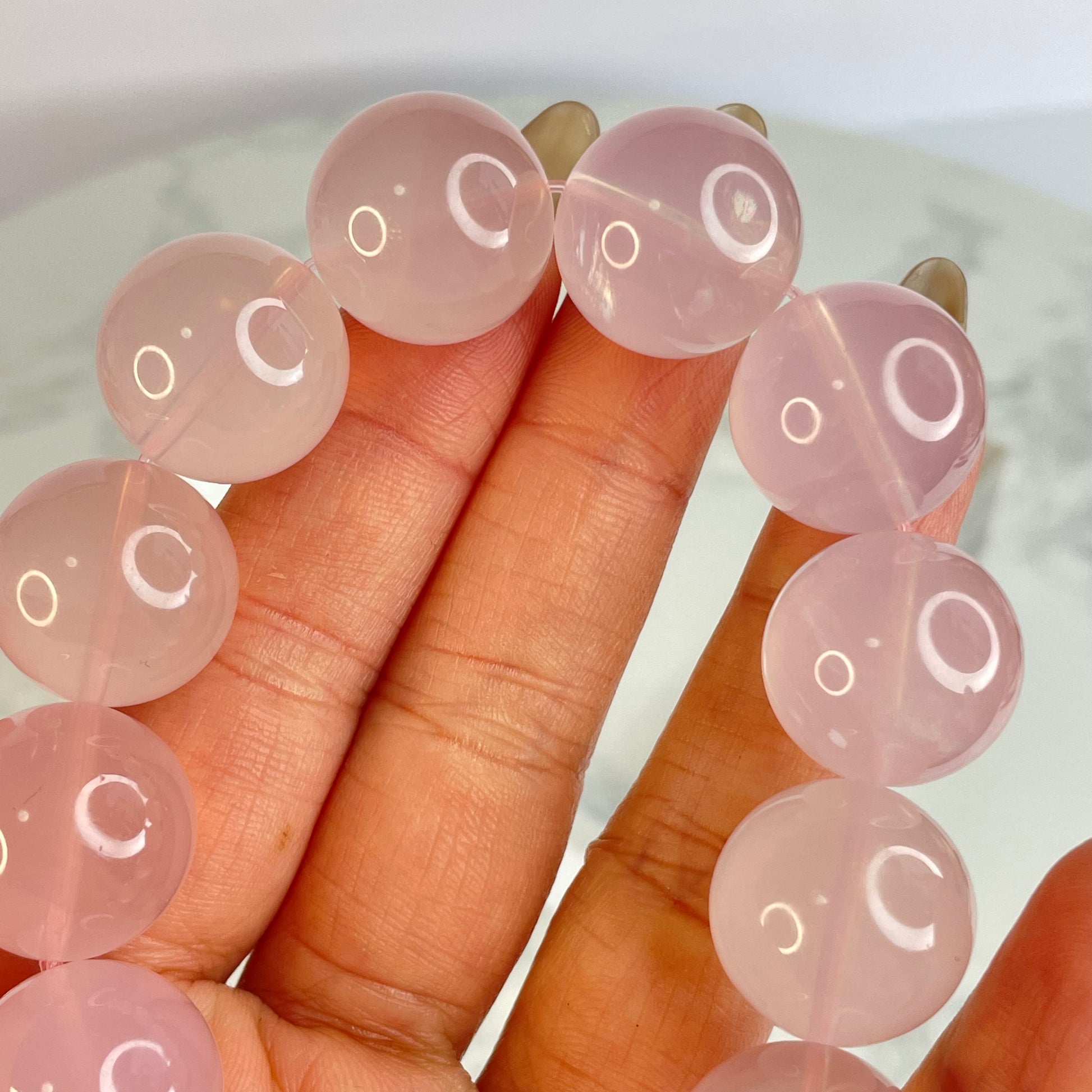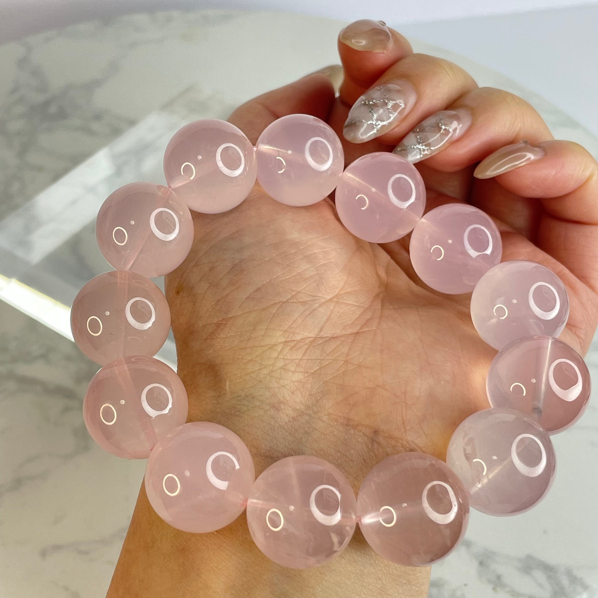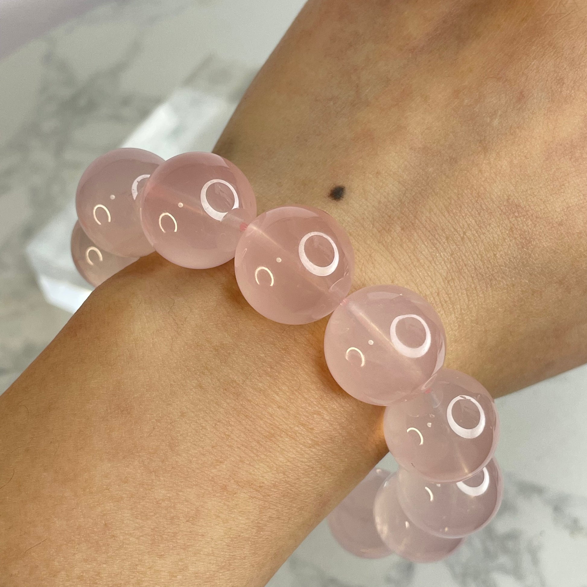 This 17mm Madagascar Rose Quartz bracelet is a bold expression of love and self-worth. With its soft, milky pink hue and full-bodied shine, it gently radiates calming, nurturing energy. Ideal for those seeking emotional healing and a strong feminine presence.