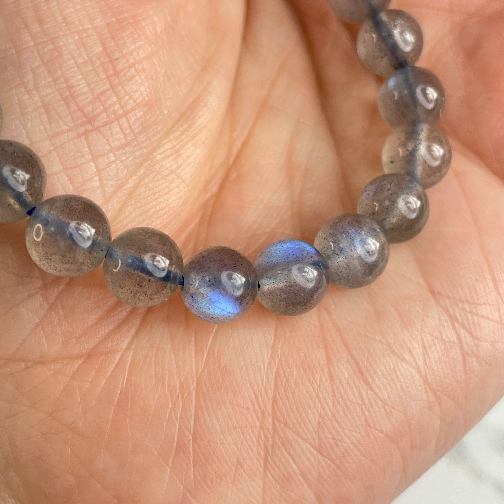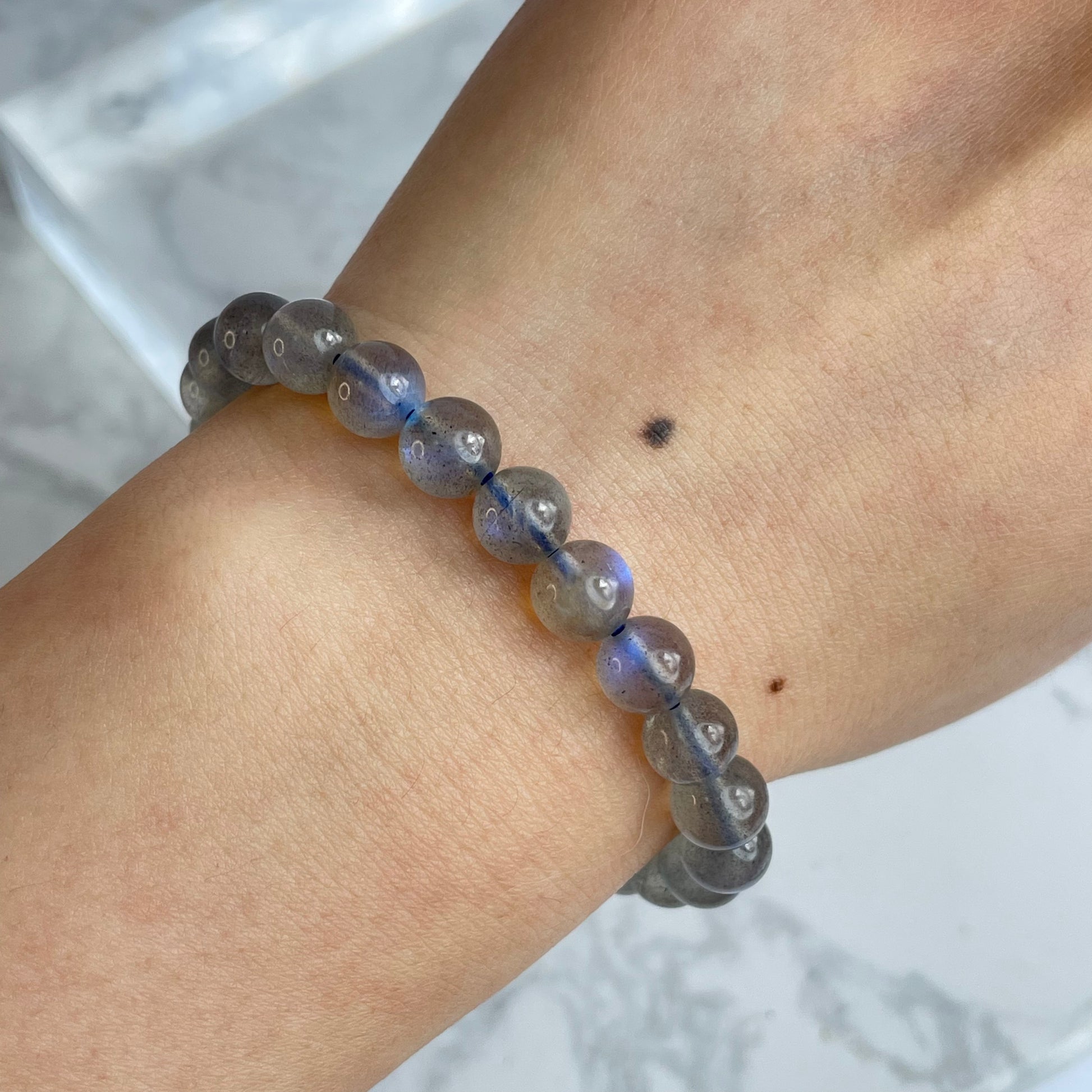 This natural Labradorite bracelet features beautiful blue flashes under light, like veils of moonlight dancing across a twilight sky. Its mystical energy helps enhance intuition, deflect negative energies, and strengthen your inner vision. An ideal talisman for spiritual seekers and creatives alike.