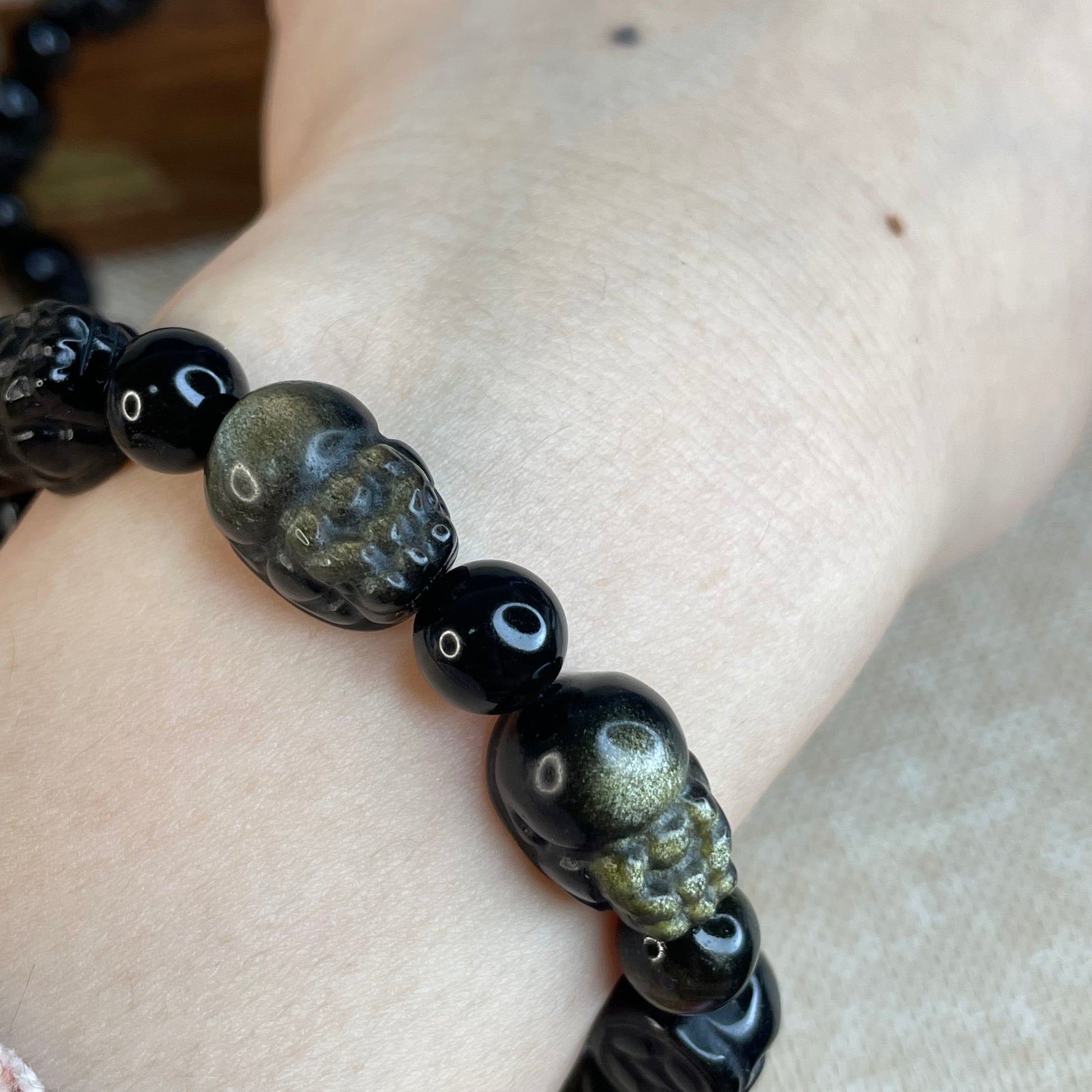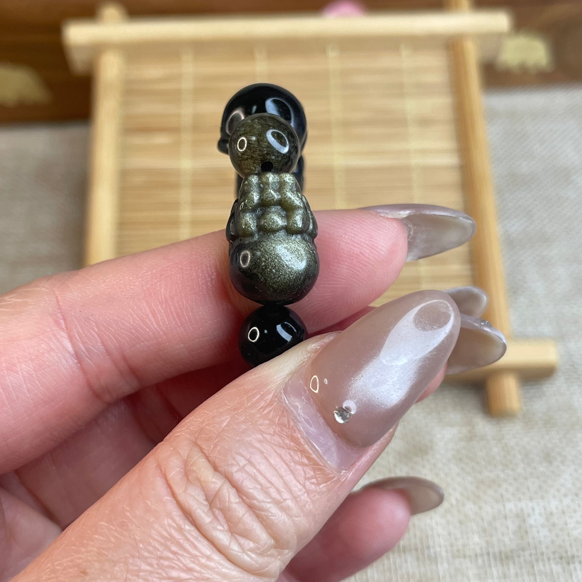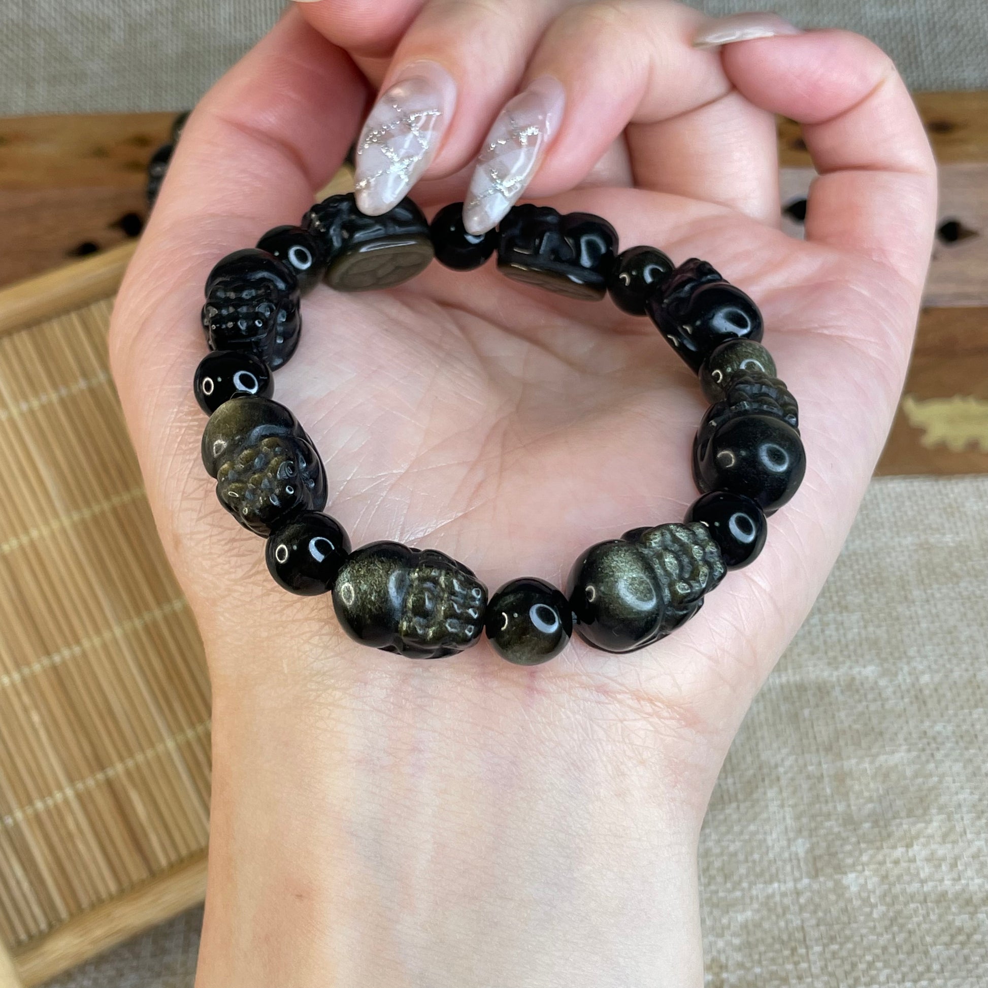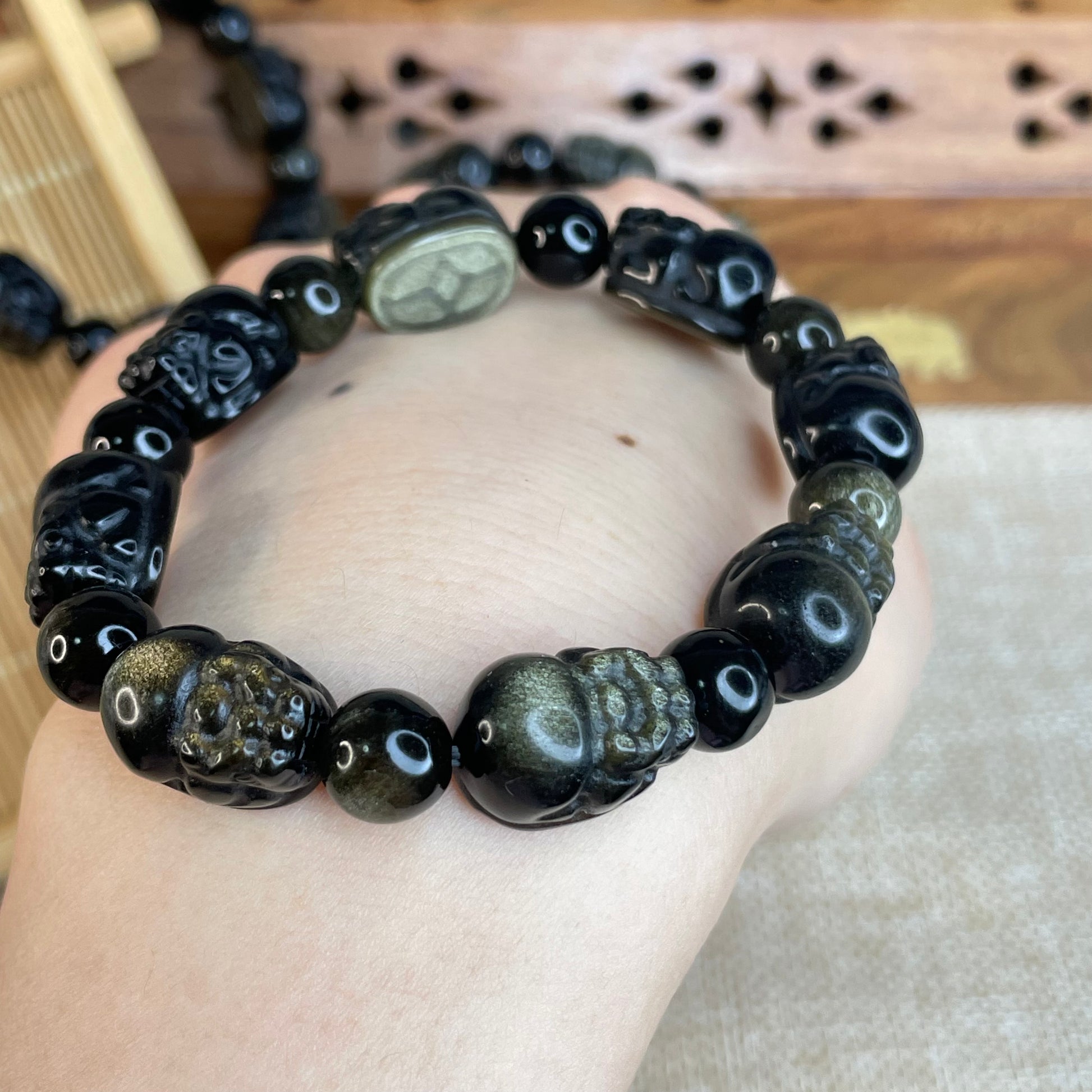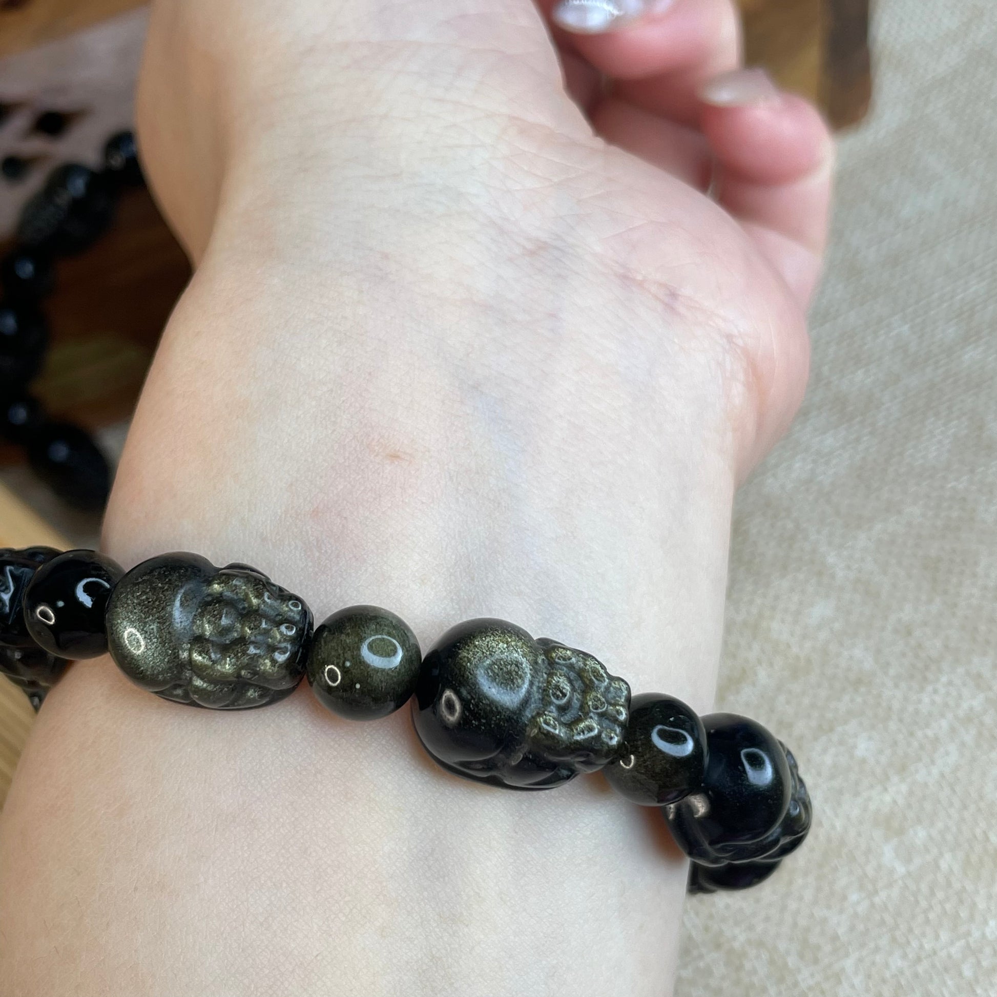 This handcrafted bracelet features 9mm carved Pi Xiu beads made from a mix of Black Obsidian and Golden Sheen Obsidian.