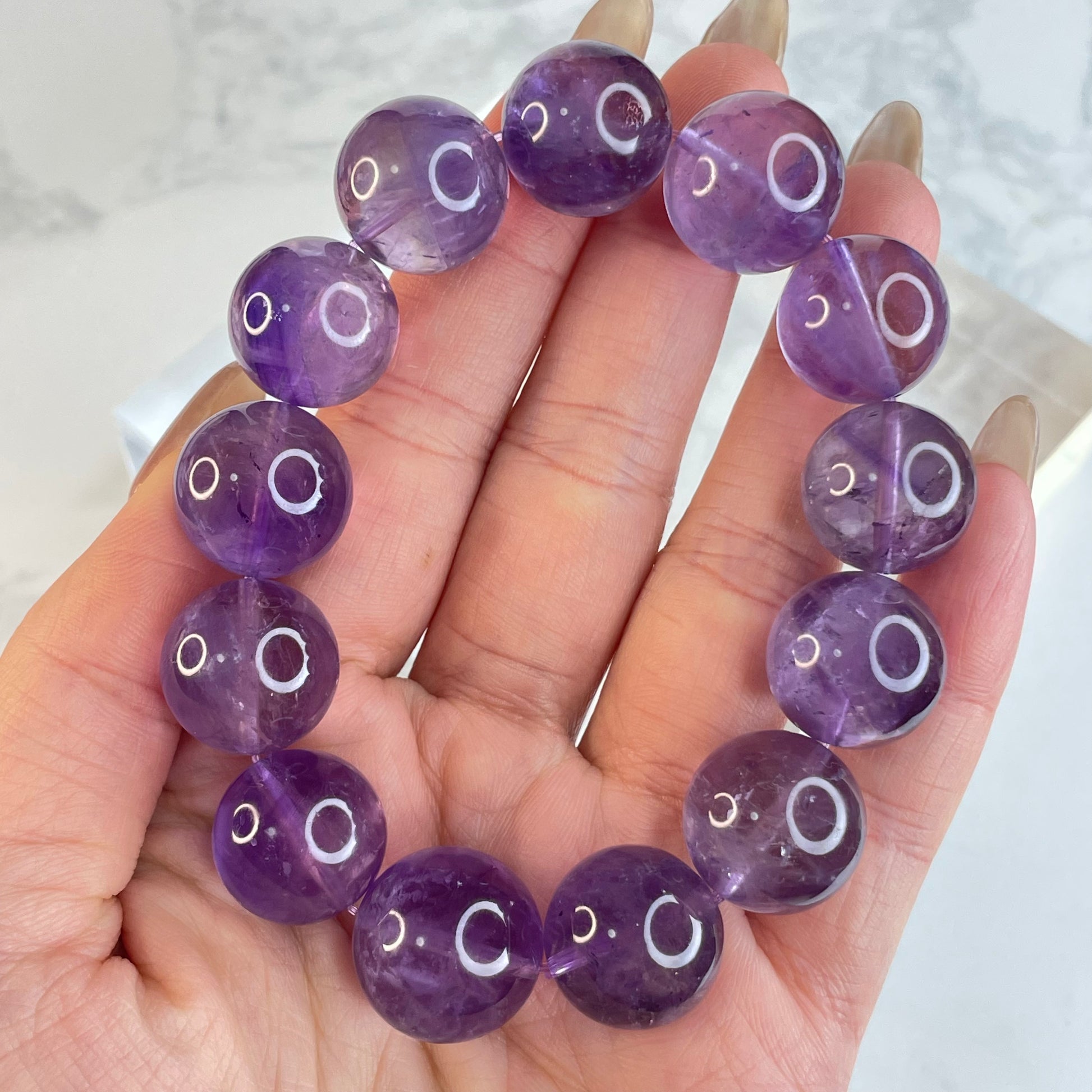This 16mm Brazilian amethyst bracelet features bold, rounded beads in rich violet tones. One of the beads carries a natural light smoky tint, giving the piece subtle variation and a more organic character.