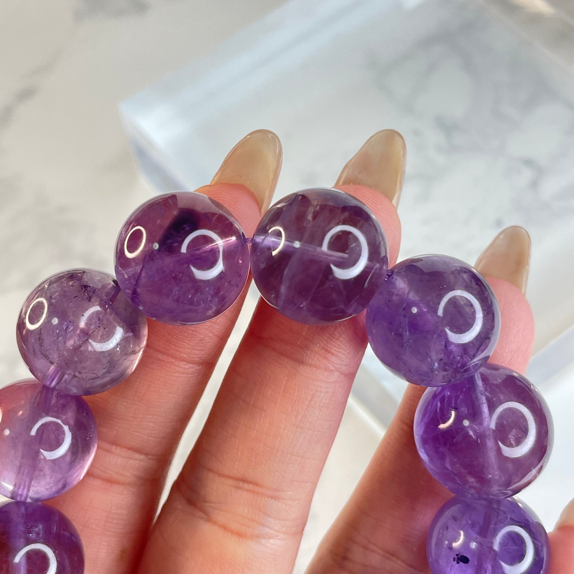 這條16mm巴西紫水晶手串以色澤濃郁的圓珠為主,晶體通透,其中一顆珠子自然帶有微淡茶色,使整體更顯個性與自然層次感。