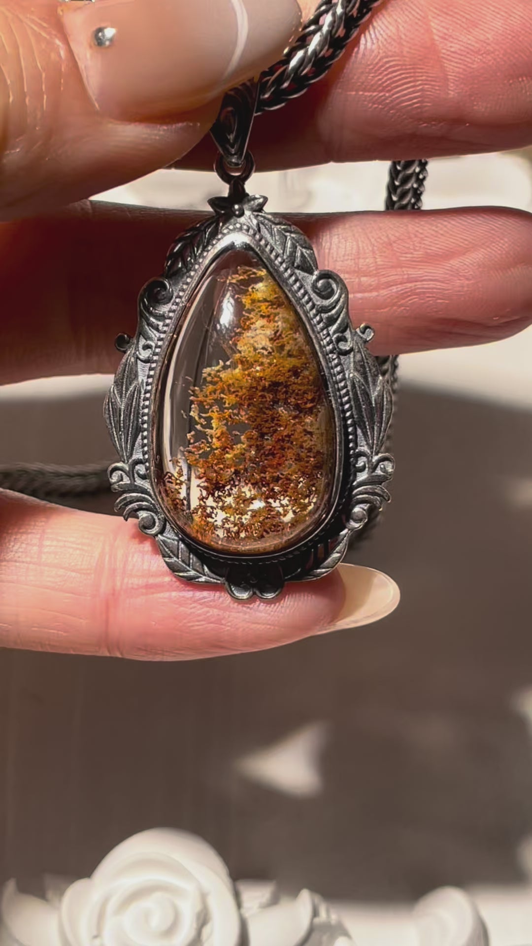 這款復古風吊墜選用天然幽靈水晶,晶體內含獨特的棕紅色包裹體,如夢幻森林般展現在眼前。水滴形設計與雕花S925純銀托架相得益彰,典雅又充滿靈氣。每一顆水晶都是大自然獨一無二的藝術品。
