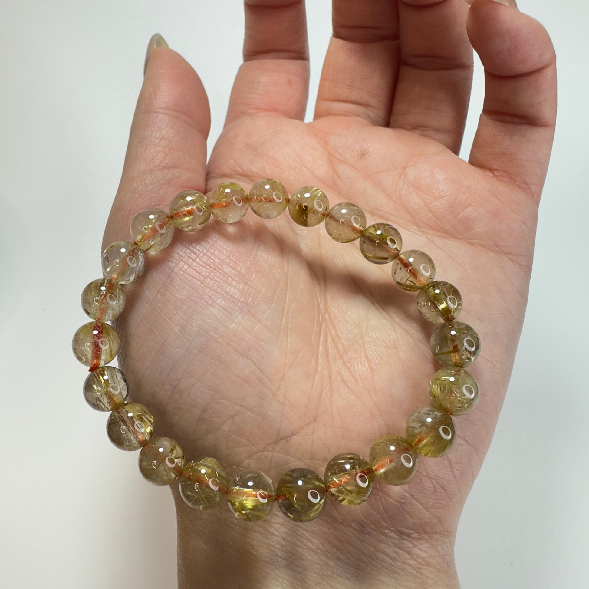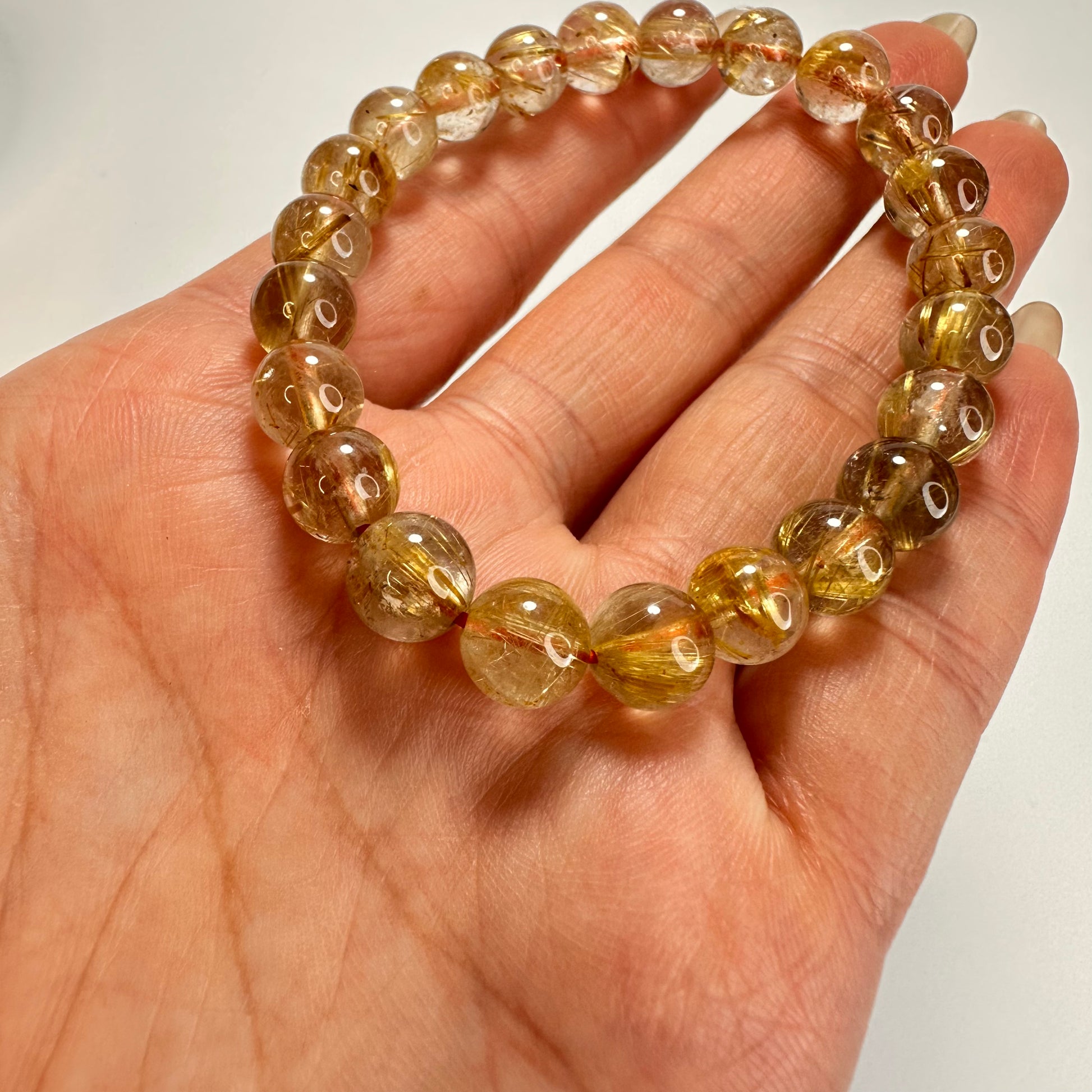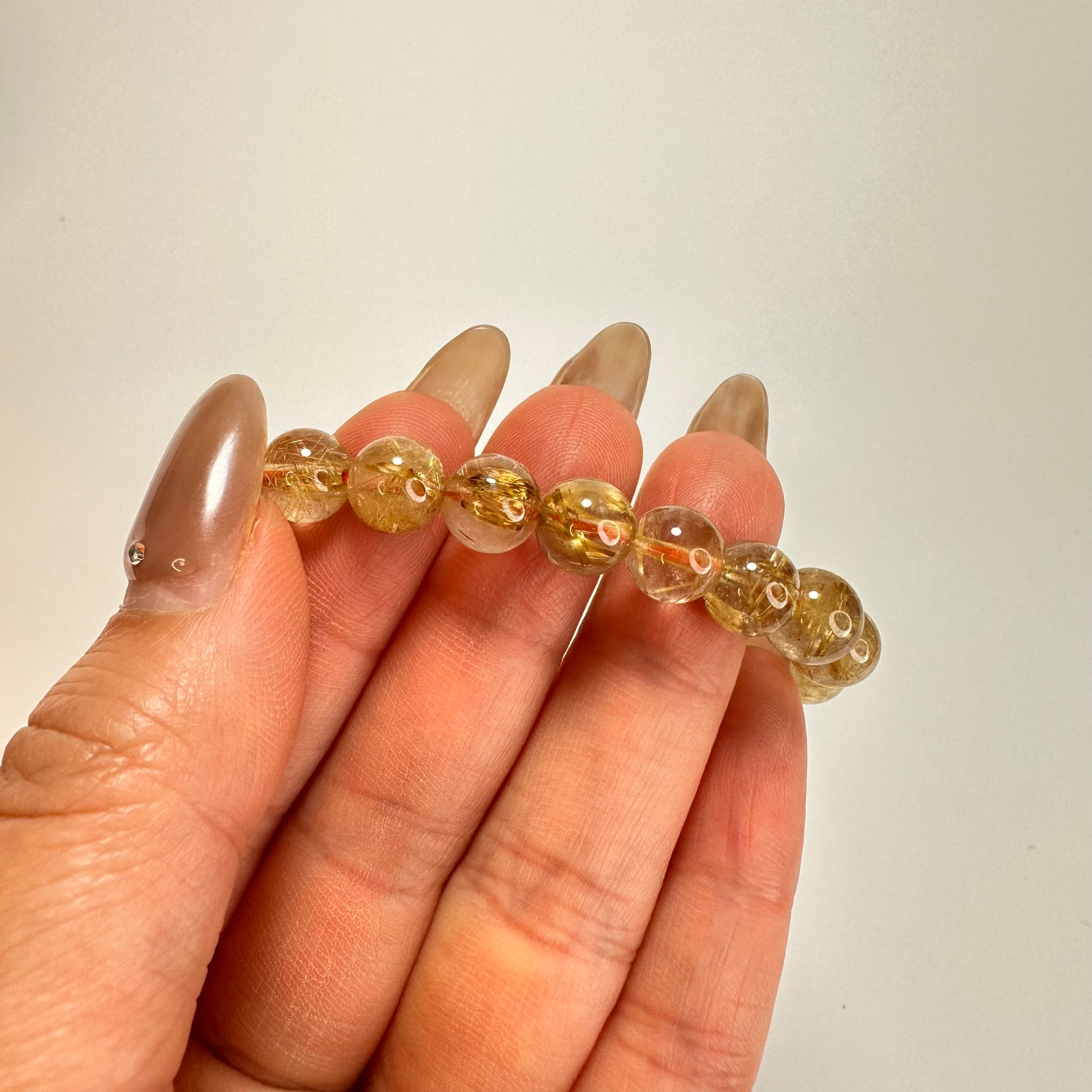 這款「星耀金絲」頂級鈦金髮晶手串,選用8mm晶瑩剔透的高品質金髮晶,內含清晰分明的金色針狀鈦晶,如星光閃閃的金絲交織其中。鈦金髮晶被譽為「財富之石」中的王者,不僅能招財聚氣,更能強化行動力與專注力,是追求成就與自信之人的絕佳選擇。