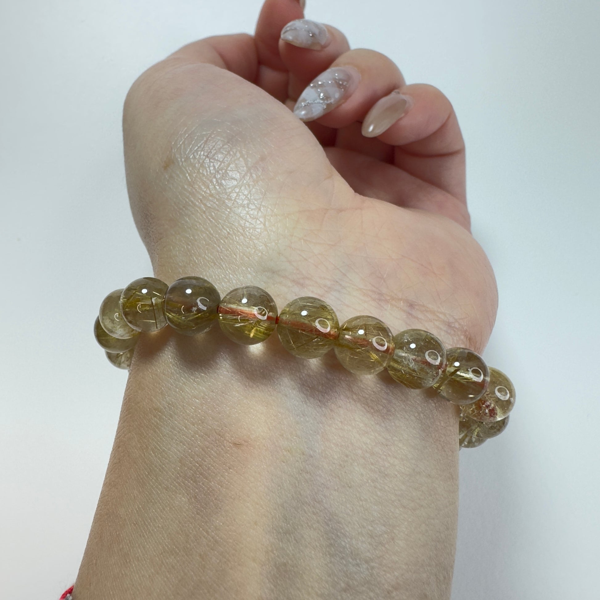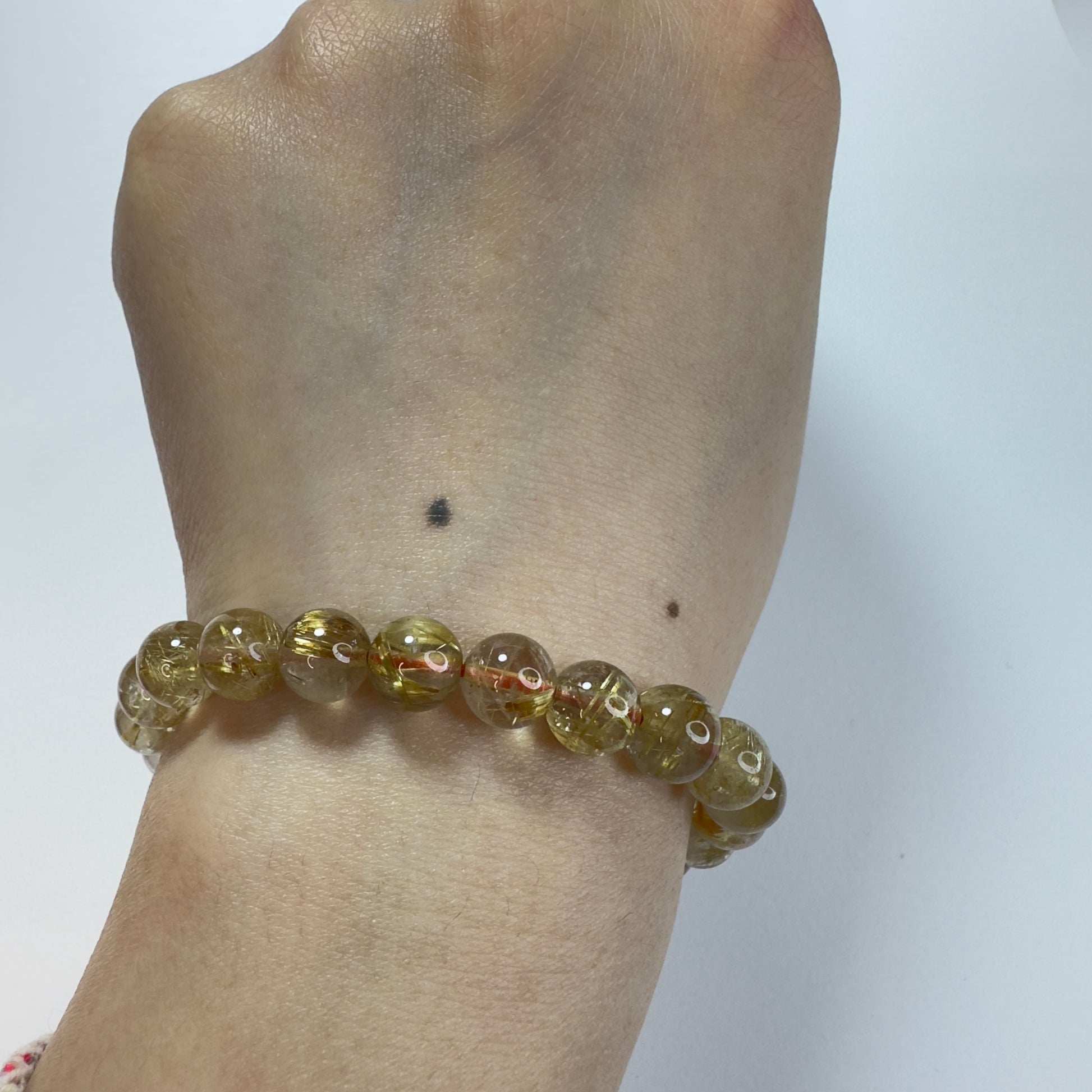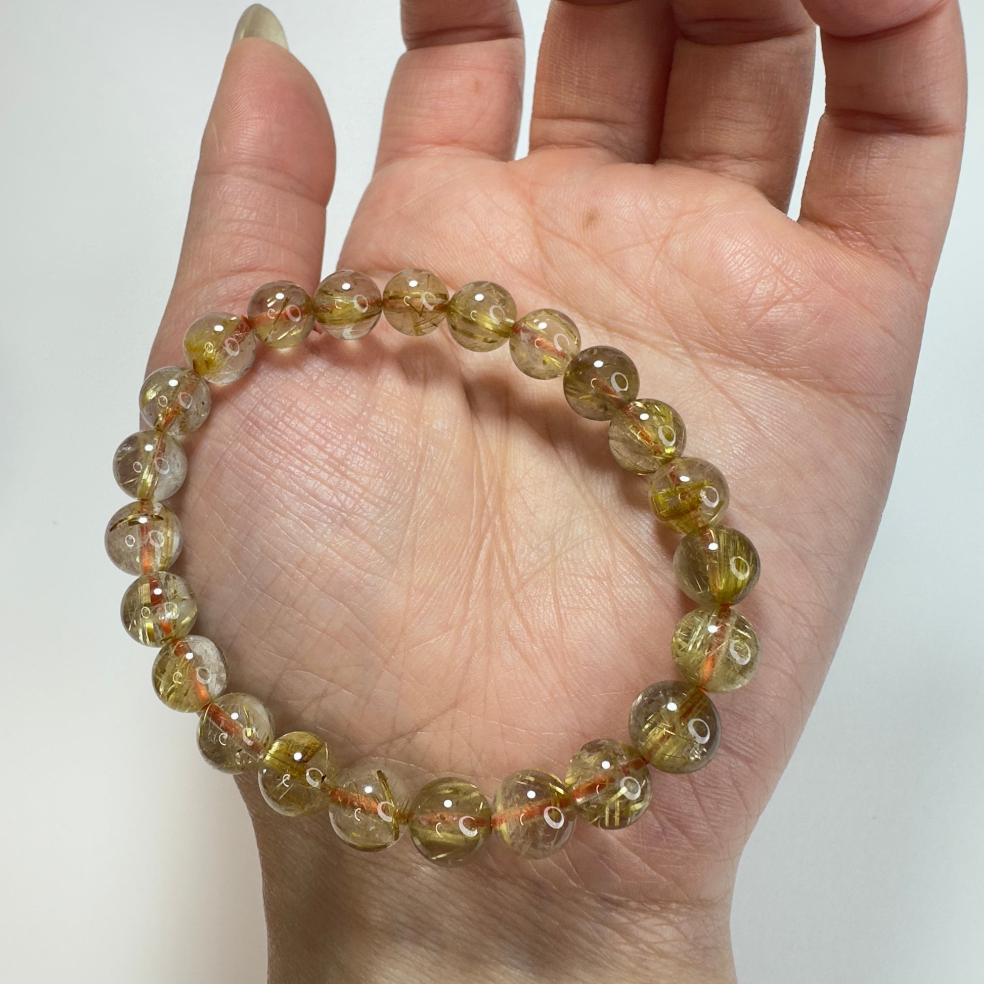 這款「星耀金絲」頂級鈦金髮晶手串,選用8mm晶瑩剔透的高品質金髮晶,內含清晰分明的金色針狀鈦晶,如星光閃閃的金絲交織其中。鈦金髮晶被譽為「財富之石」中的王者,不僅能招財聚氣,更能強化行動力與專注力,是追求成就與自信之人的絕佳選擇。