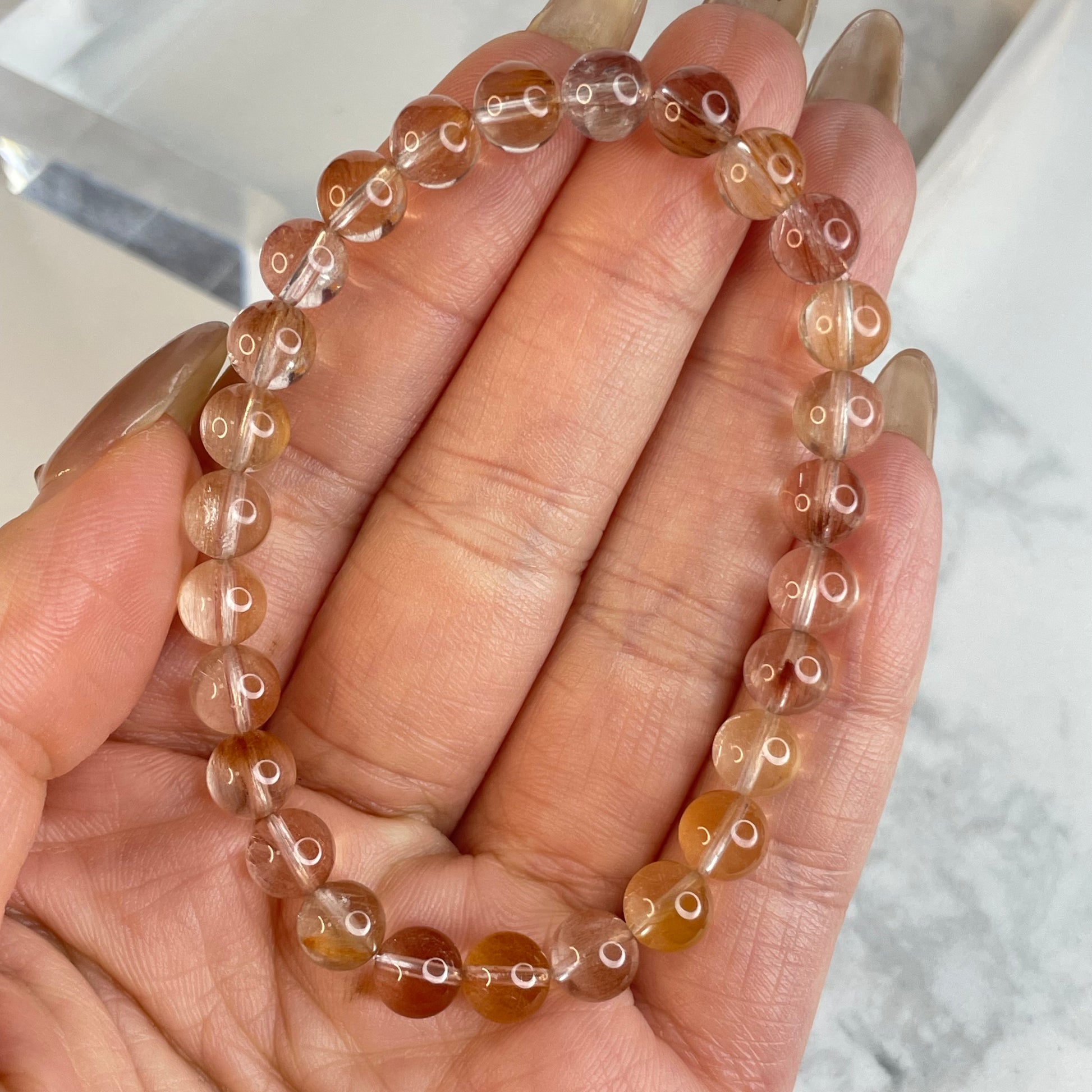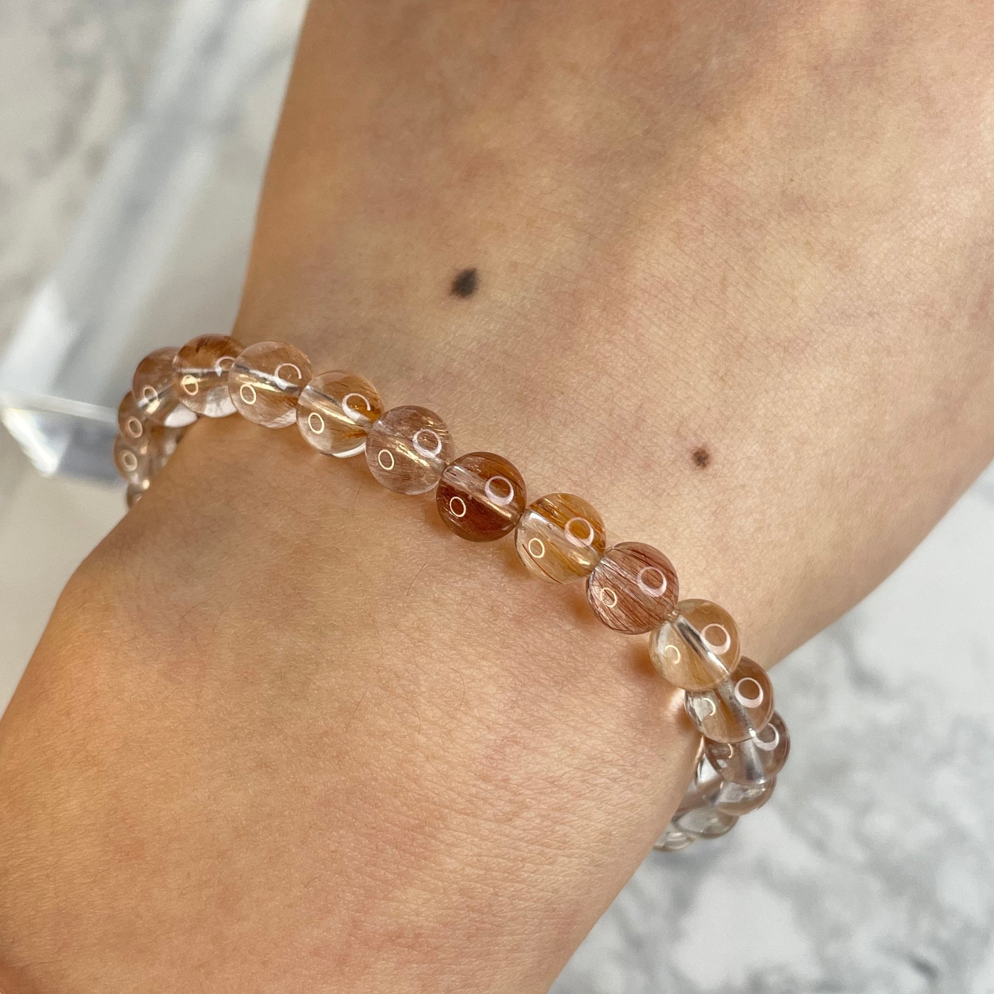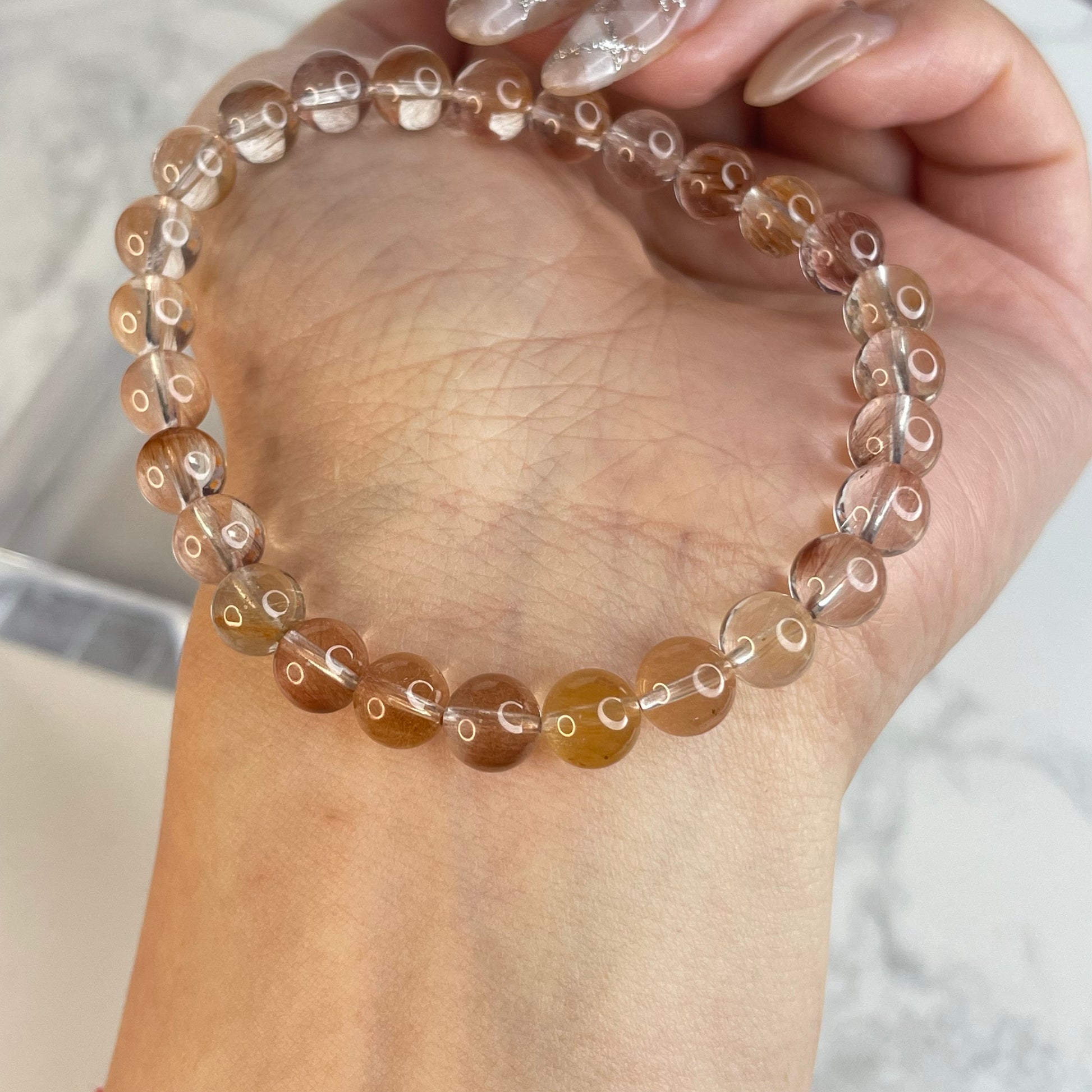 Step into a world of quiet elegance with this 6mm Rainbow Rutile Quartz bracelet. Each bead features delicately woven rutile threads — like soft rabbit hair — suspended in crystal-clear quartz. The gradient hues range from golden honey to burnt caramel, revealing a natural transition of warmth and depth.
