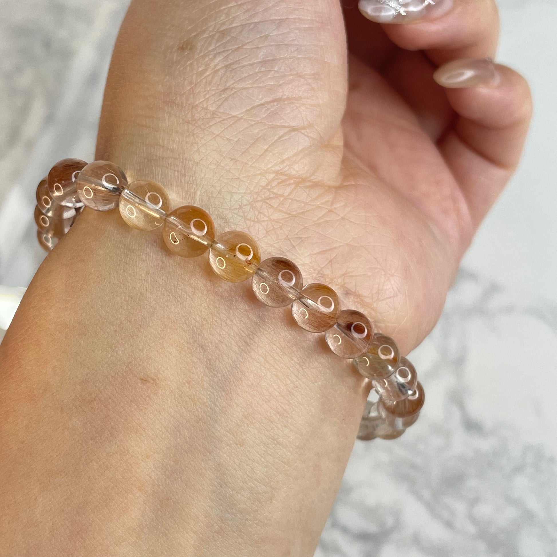 這條 6mm 彩兔毛水晶手串,如晨光穿透霧林般夢幻。每一顆珠子都清澈剔透,內部自然分佈著如兔毛般柔細的針狀礦物,從淡金色、蜜糖棕,到紅茶色自然漸變,展現柔和溫潤的靈氣。