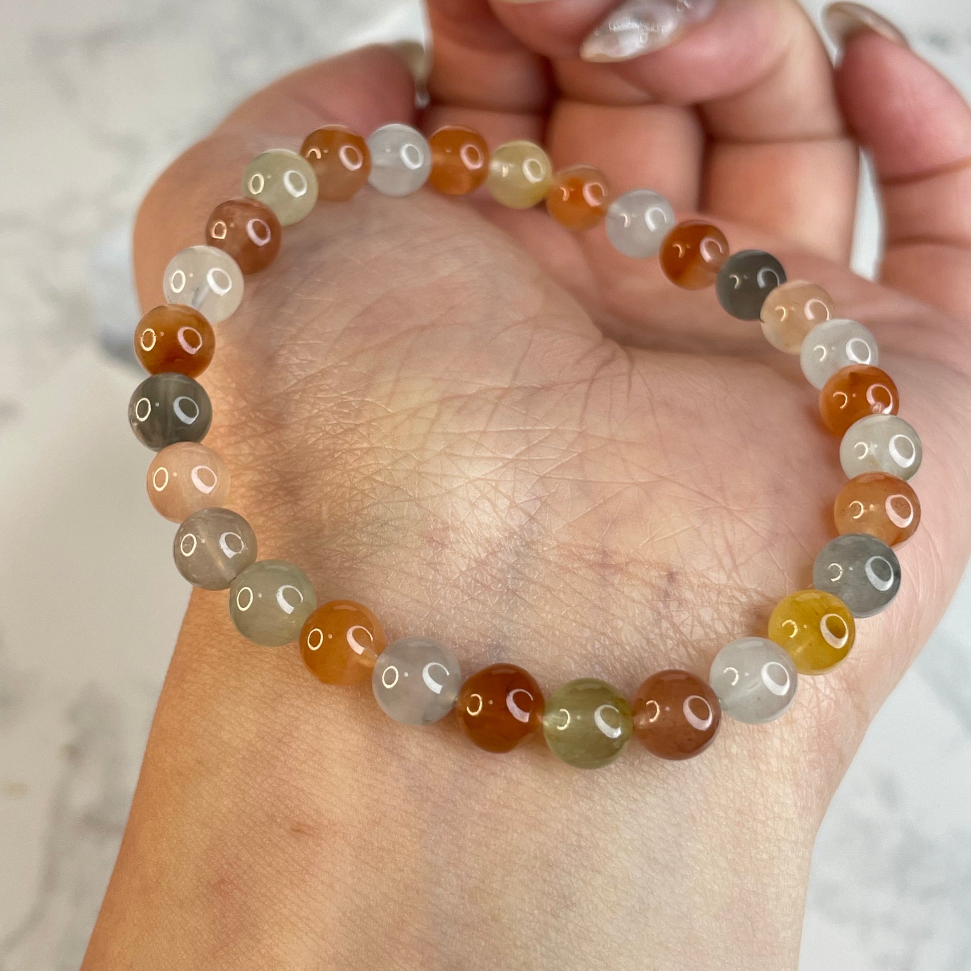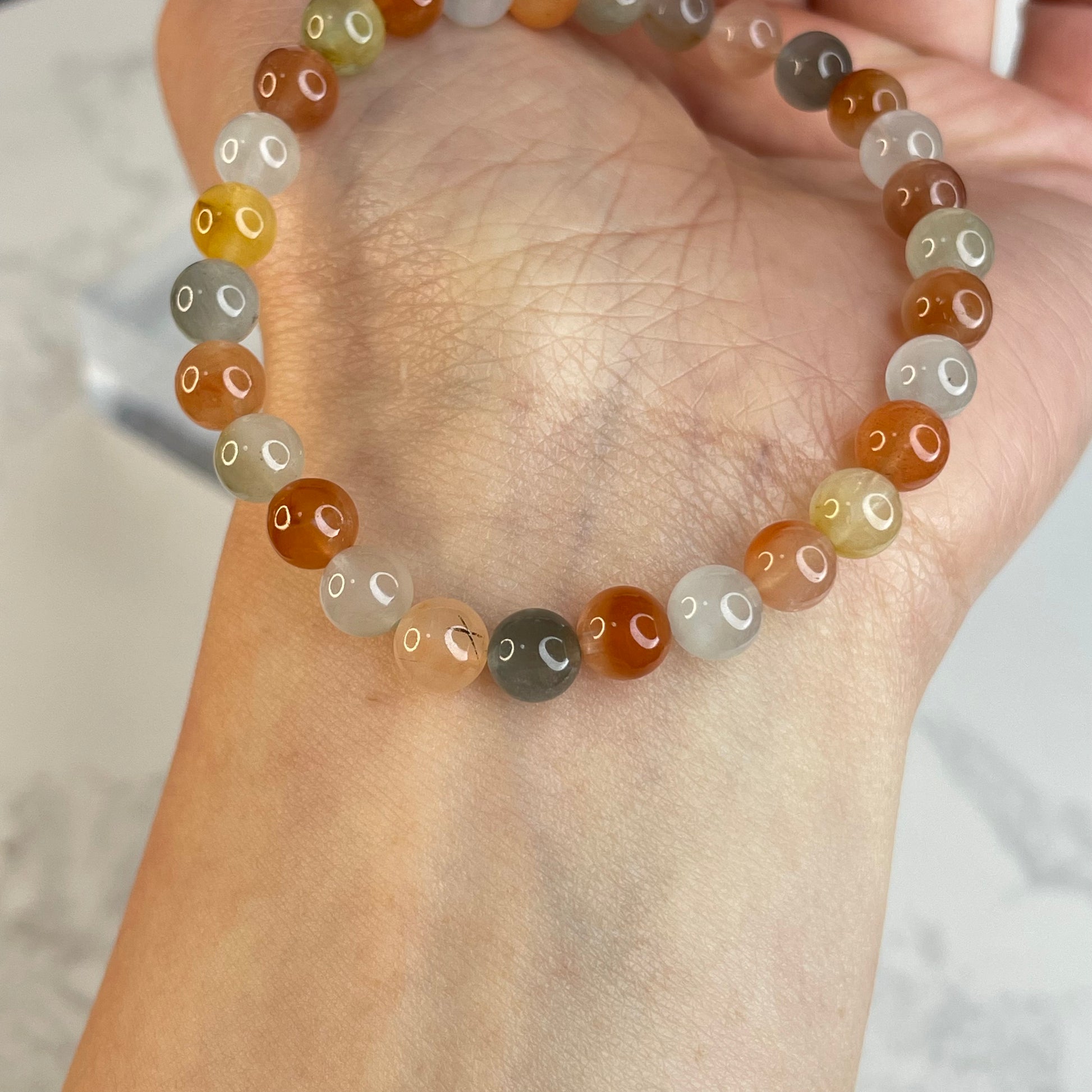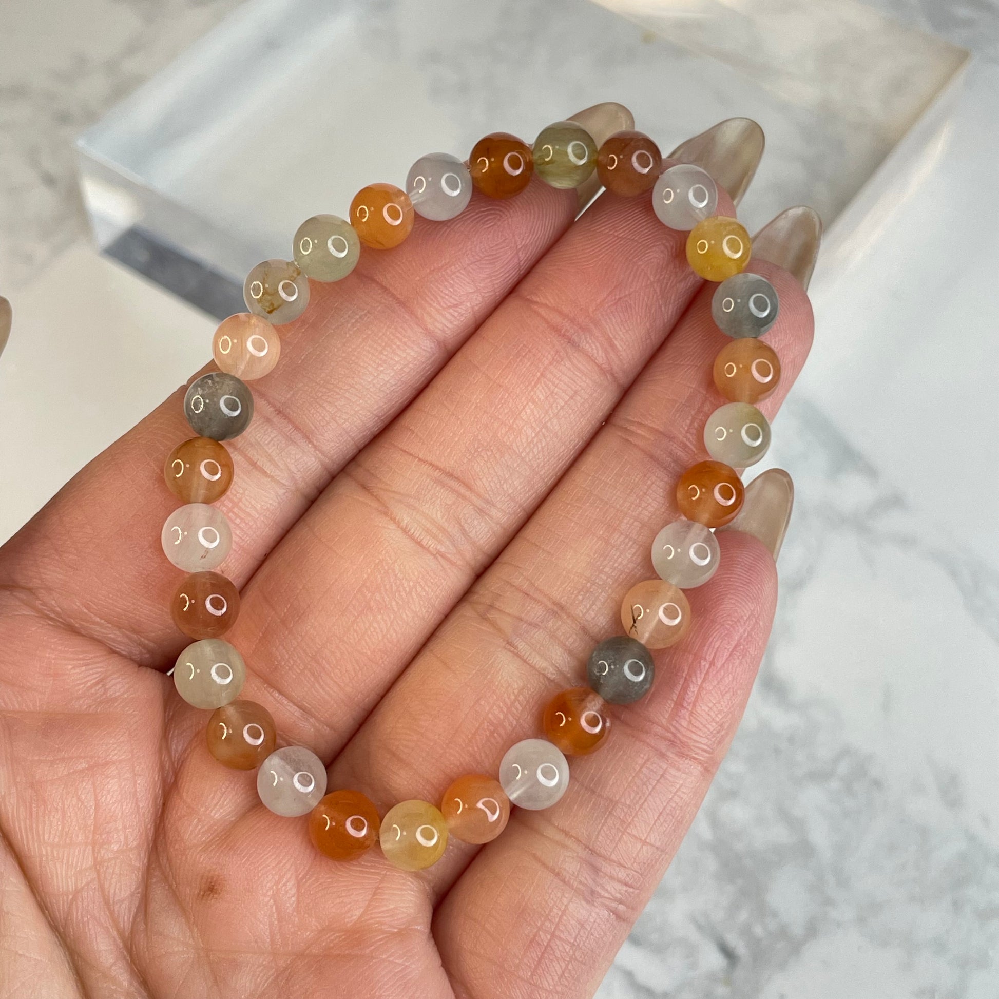 Tiny beads, big charm! This 6mm Rainbow Rutile Quartz bracelet is like a pastel candy mix for your soul. Soft and shimmering in hues of orange, peach, grey, honey, and snow white, these delicate beads are filled with dreamy rutile threads—just like fine rabbit hair under sunlight. Lightweight and easy to stack, it’s perfect for daily wear and layering with your favorite bracelets.