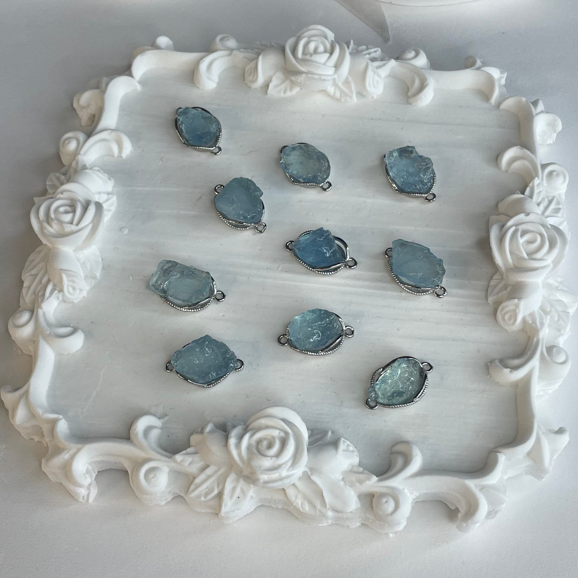These raw aquamarine links are perfect for creating dreamy bracelets or necklaces. With double loops on each side, they’re ideal for centerpieces in wire-wrapped designs or elegant beaded connections.