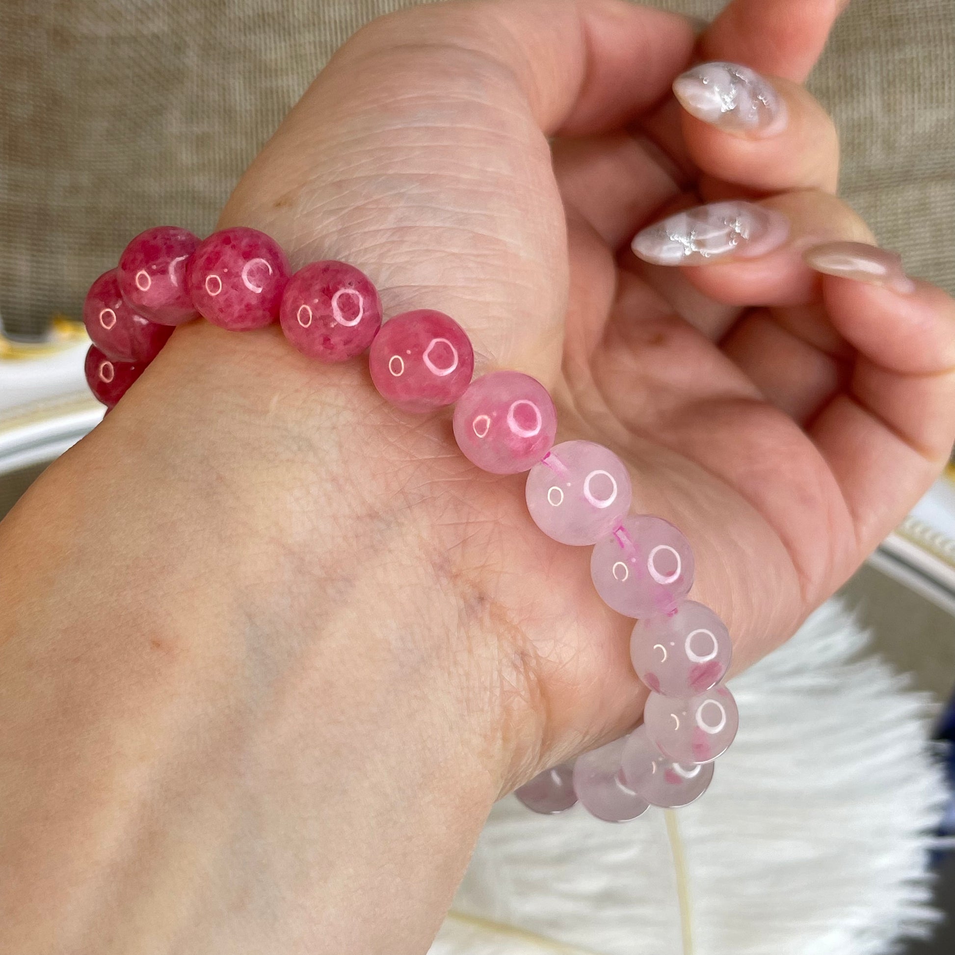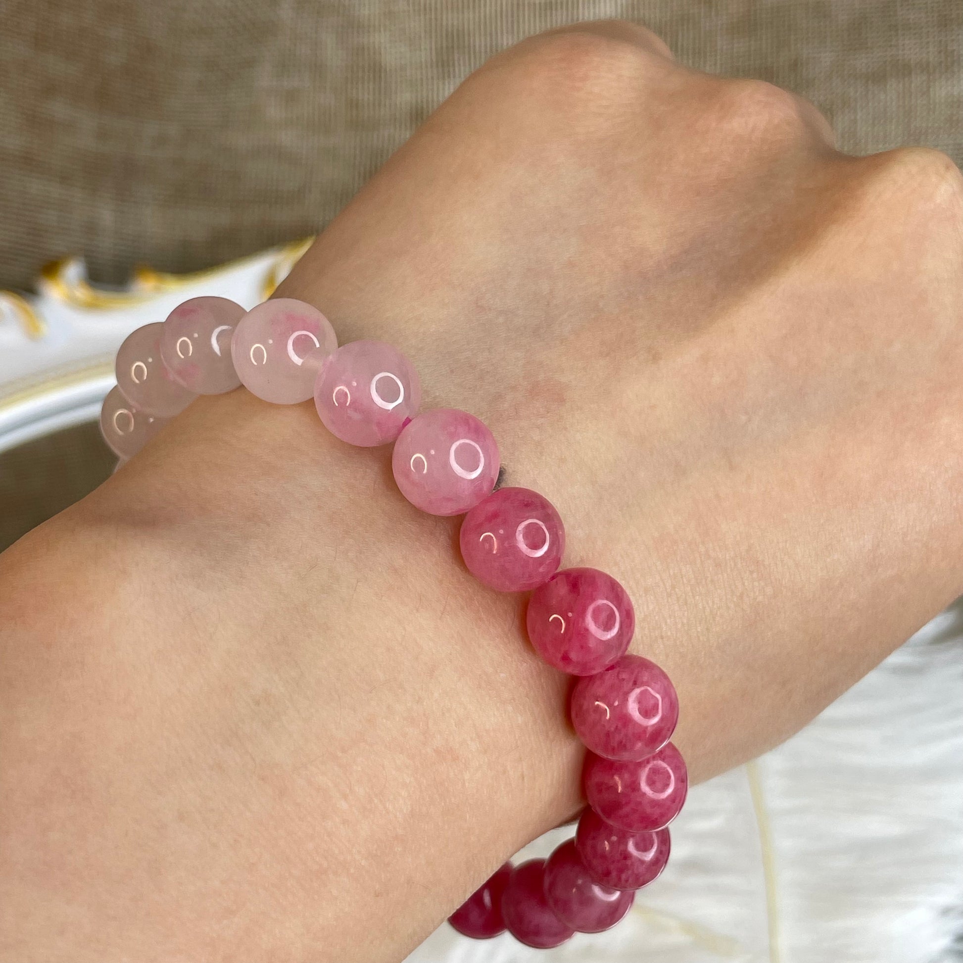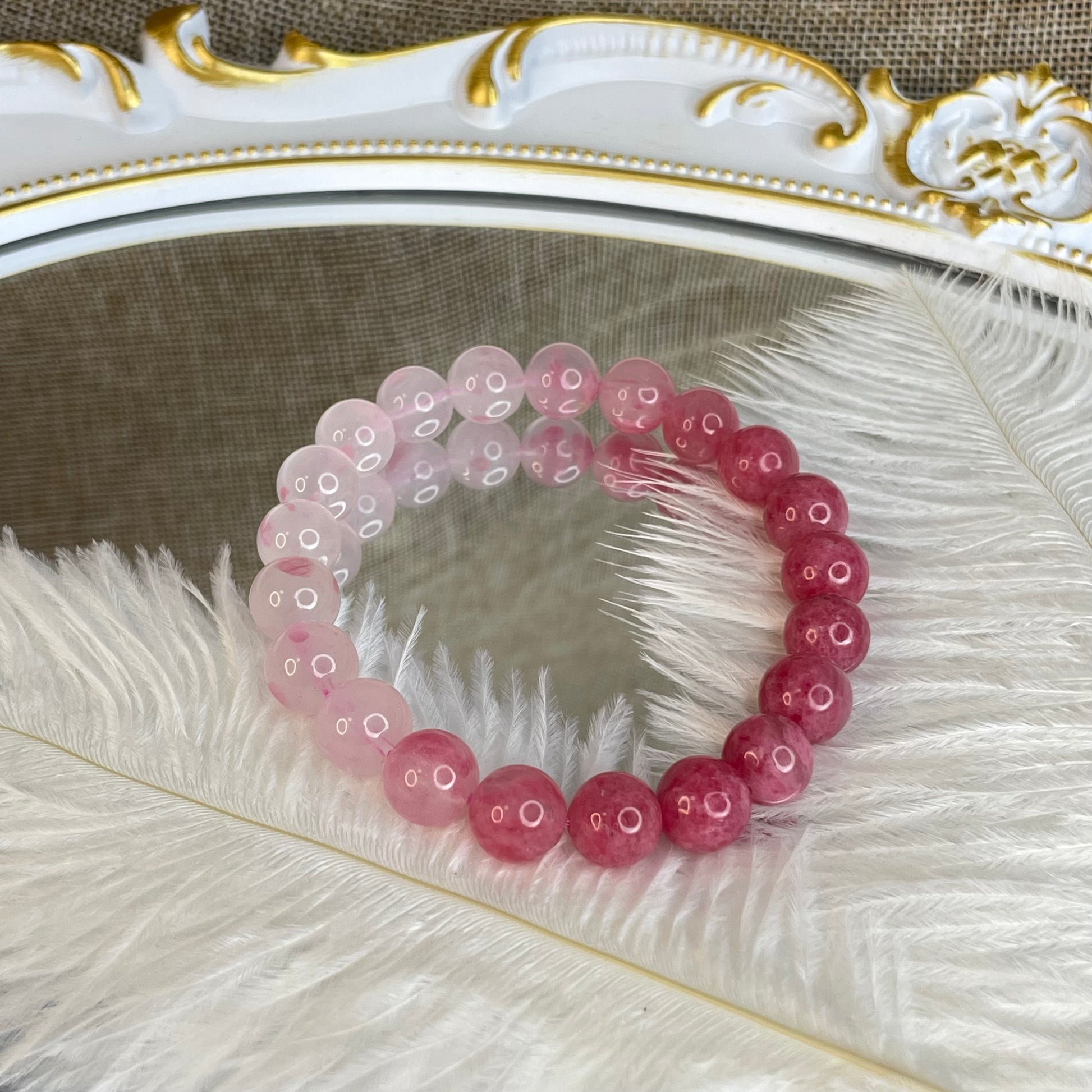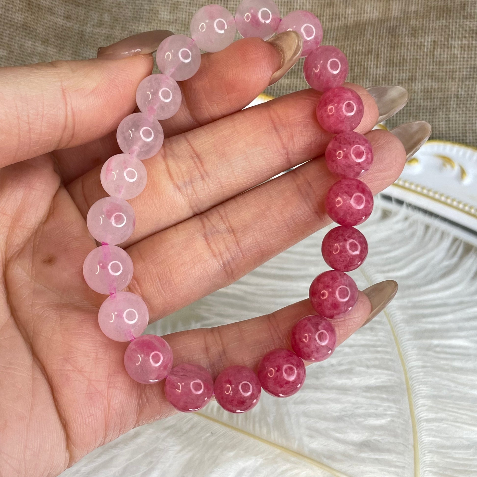 The “Rose Bloom” bracelet is made from natural rhodonite beads, featuring a gentle gradient of dusty pink and rose tones with occasional natural black inclusions. Each 9mm bead is polished and smooth, showcasing the stone’s calming, earthy beauty. Rhodonite is known for its powerful heart-healing energy—promoting compassion, emotional balance, and resilience through change. A beautiful choice for those on a journey of emotional healing and self-love.