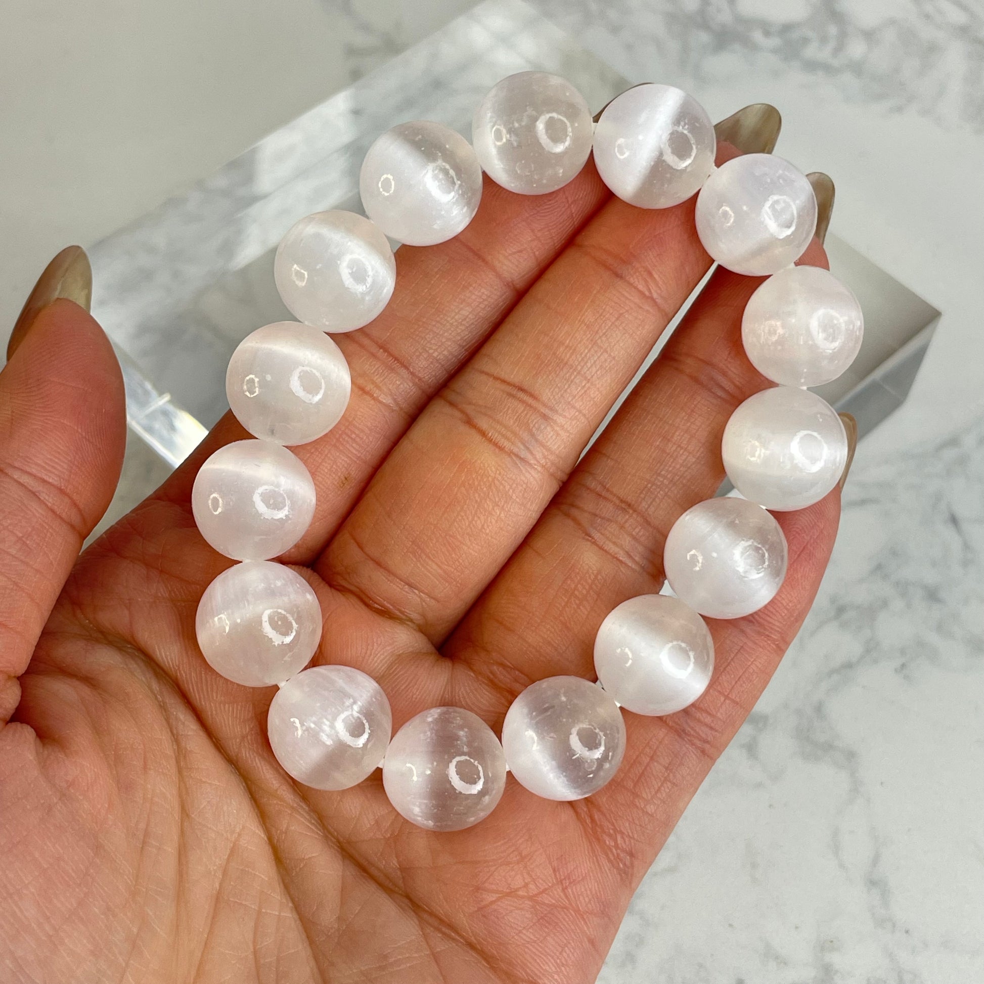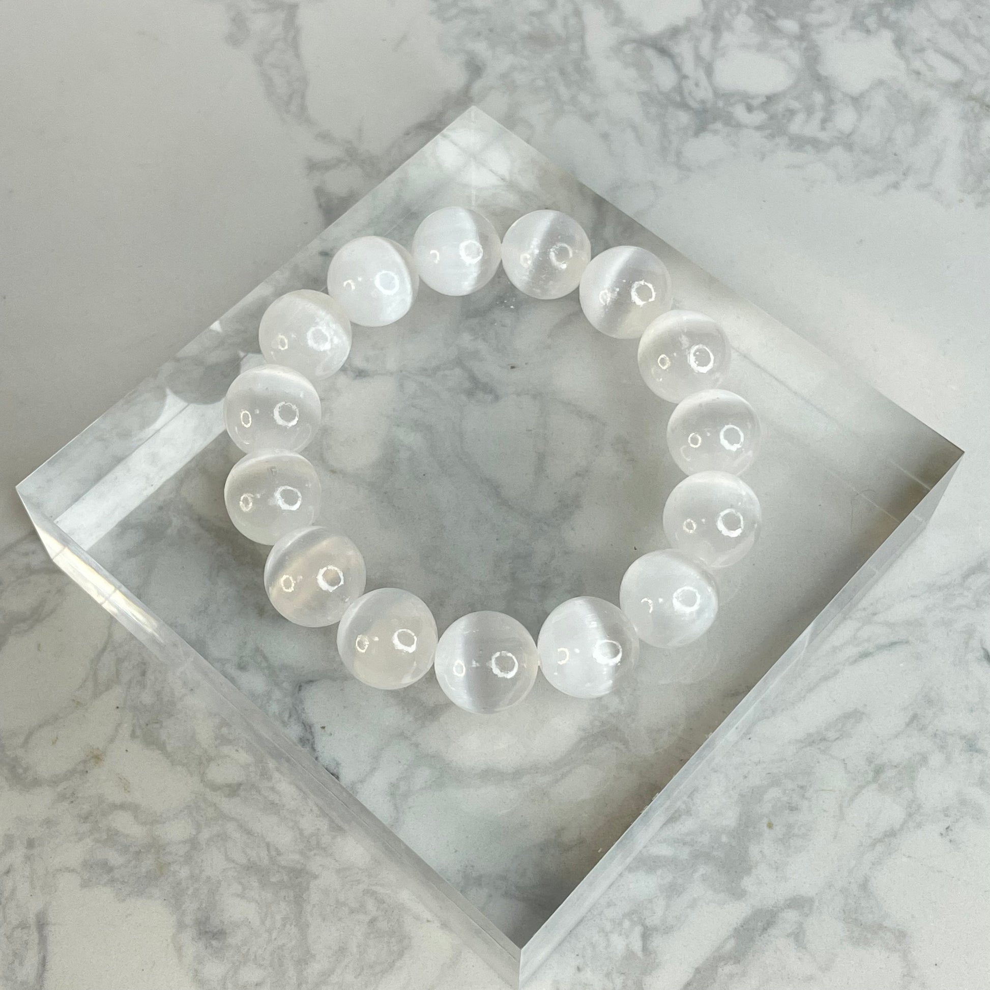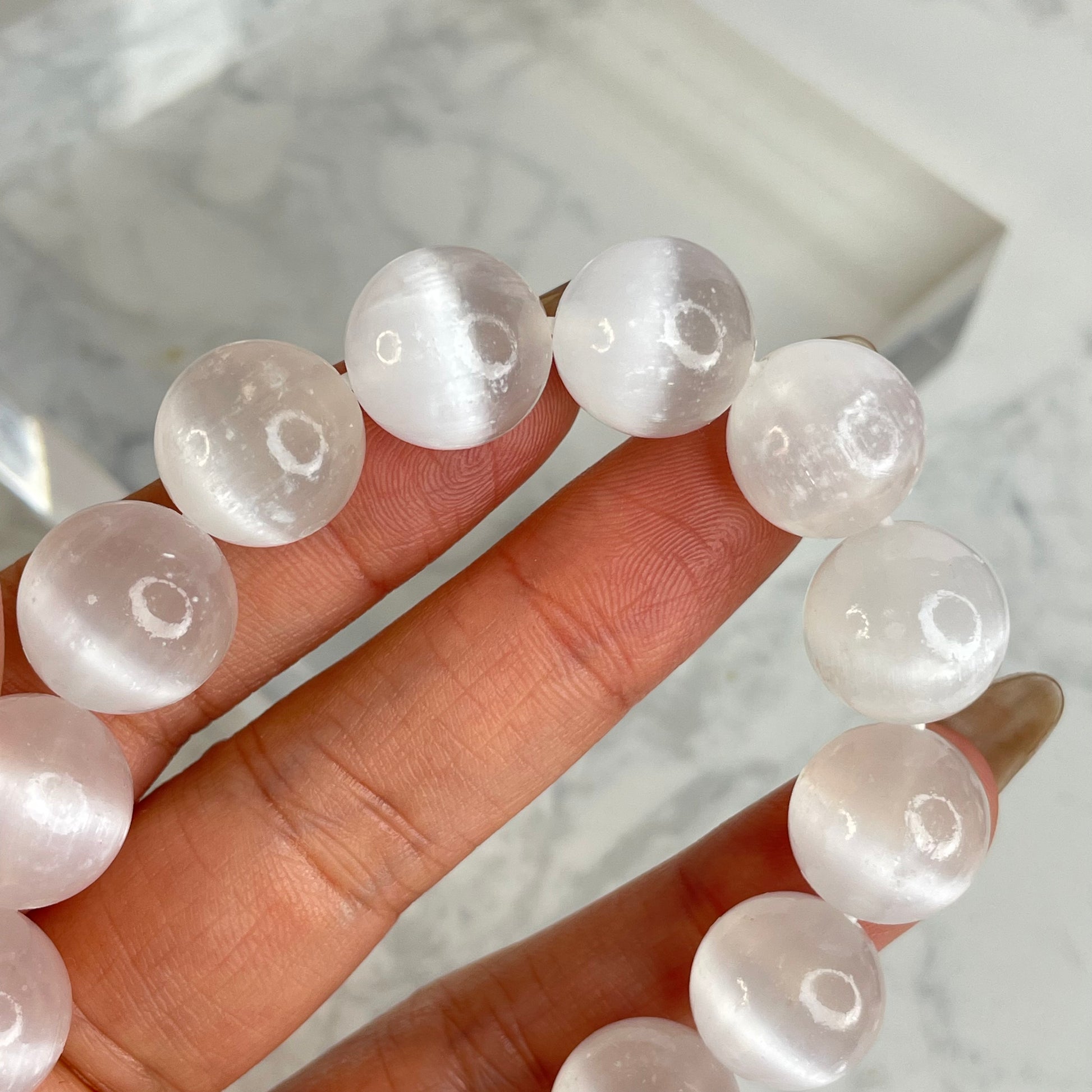 This 14mm Selenite bracelet showcases a beautiful, silky-white glow with soft chatoyancy across each bead. Known for its calming and purifying properties, Selenite is a powerful stone for clearing negative energy, enhancing mental clarity, and promoting spiritual connection. Its high vibrational energy makes it a favorite for meditation and aura cleansing.