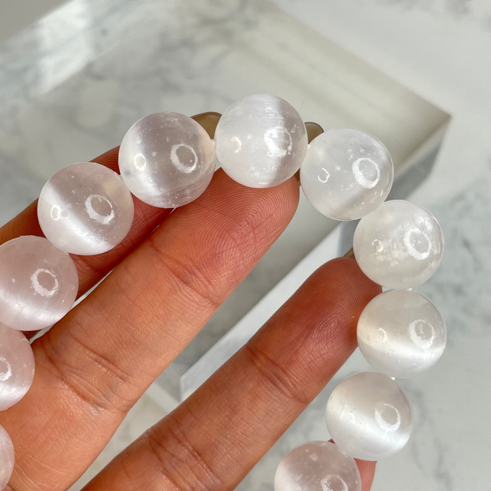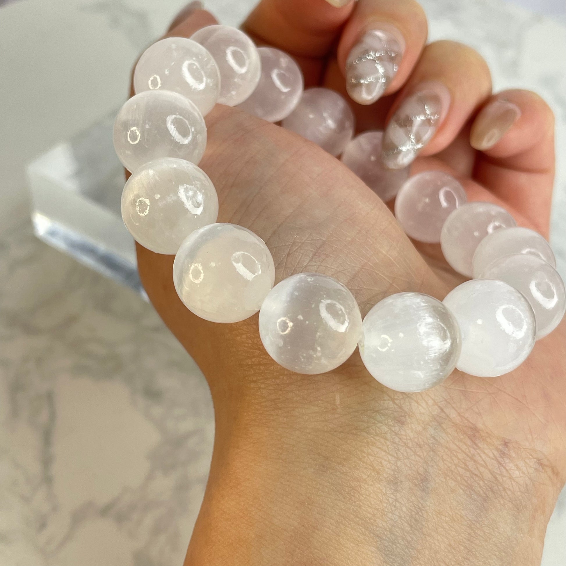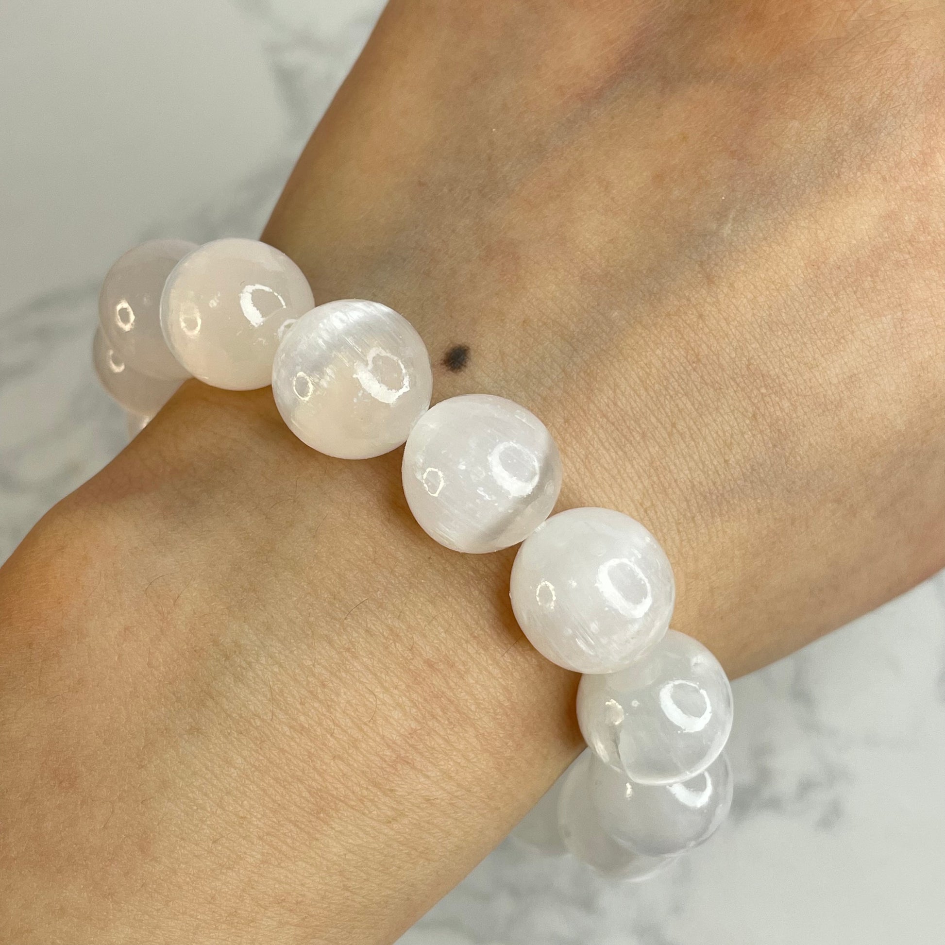 This 14mm Selenite bracelet showcases a beautiful, silky-white glow with soft chatoyancy across each bead. Known for its calming and purifying properties, Selenite is a powerful stone for clearing negative energy, enhancing mental clarity, and promoting spiritual connection. Its high vibrational energy makes it a favorite for meditation and aura cleansing.