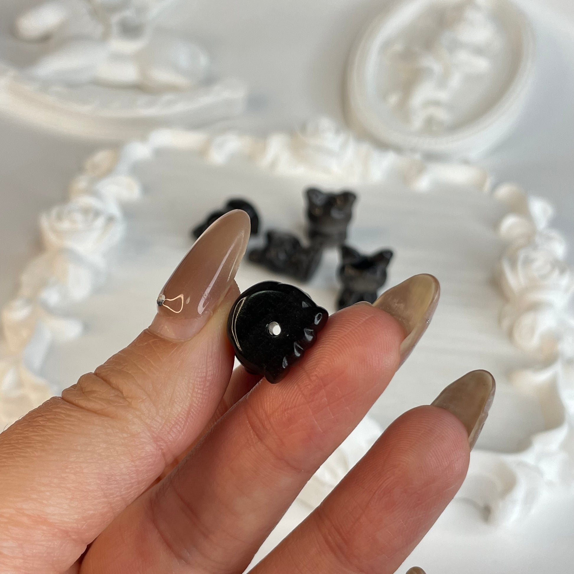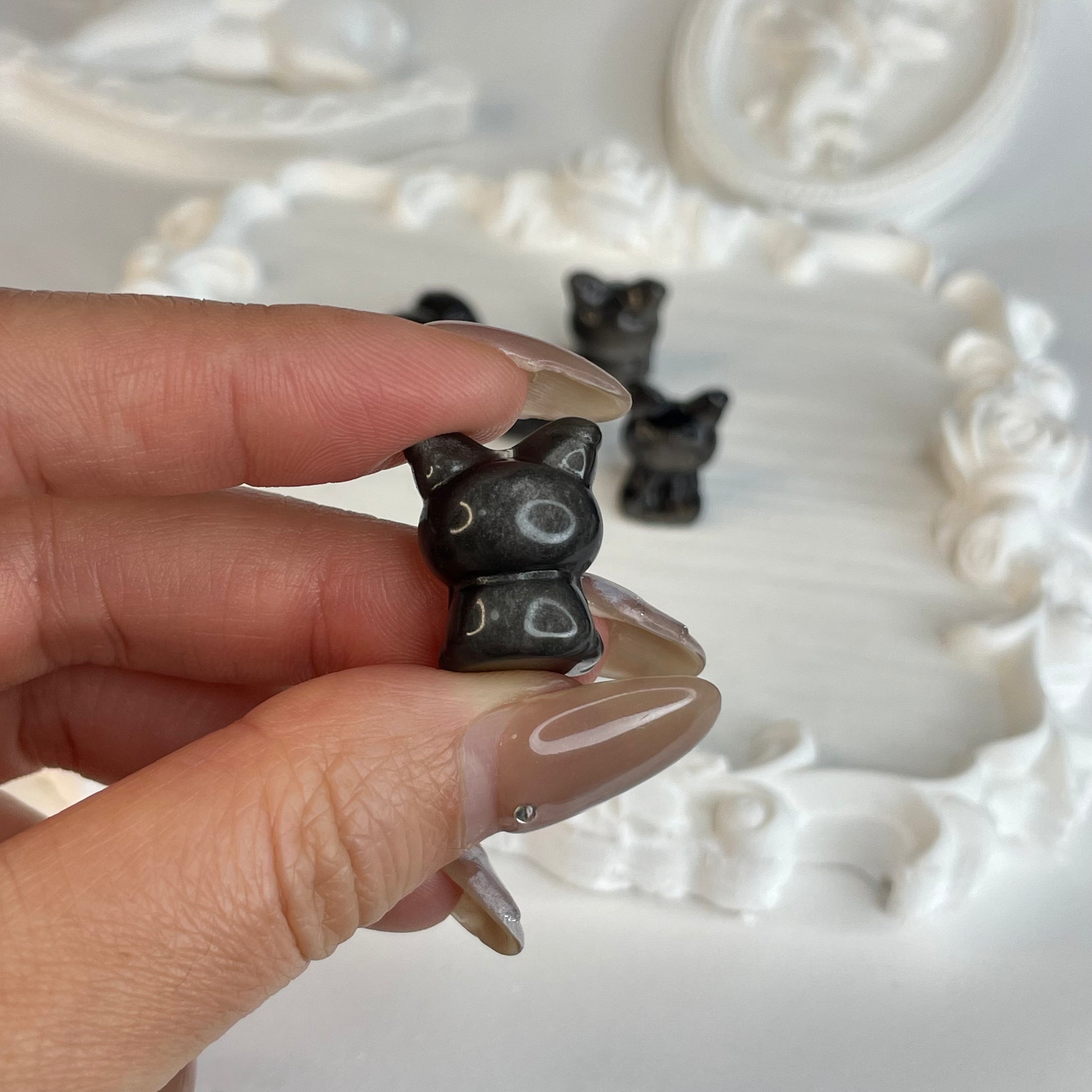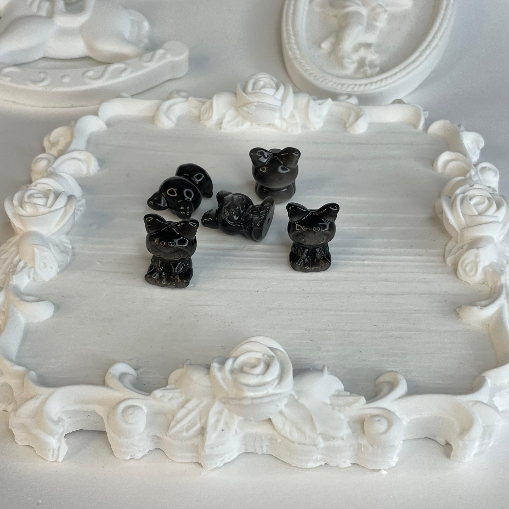 Set of 5 – Hand-Carved Silver Obsidian Kitty Beads | Cute DIY Crystal Charms (18mm)