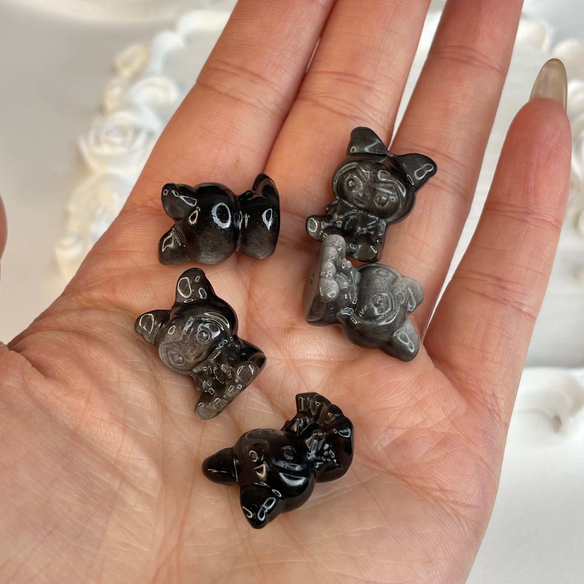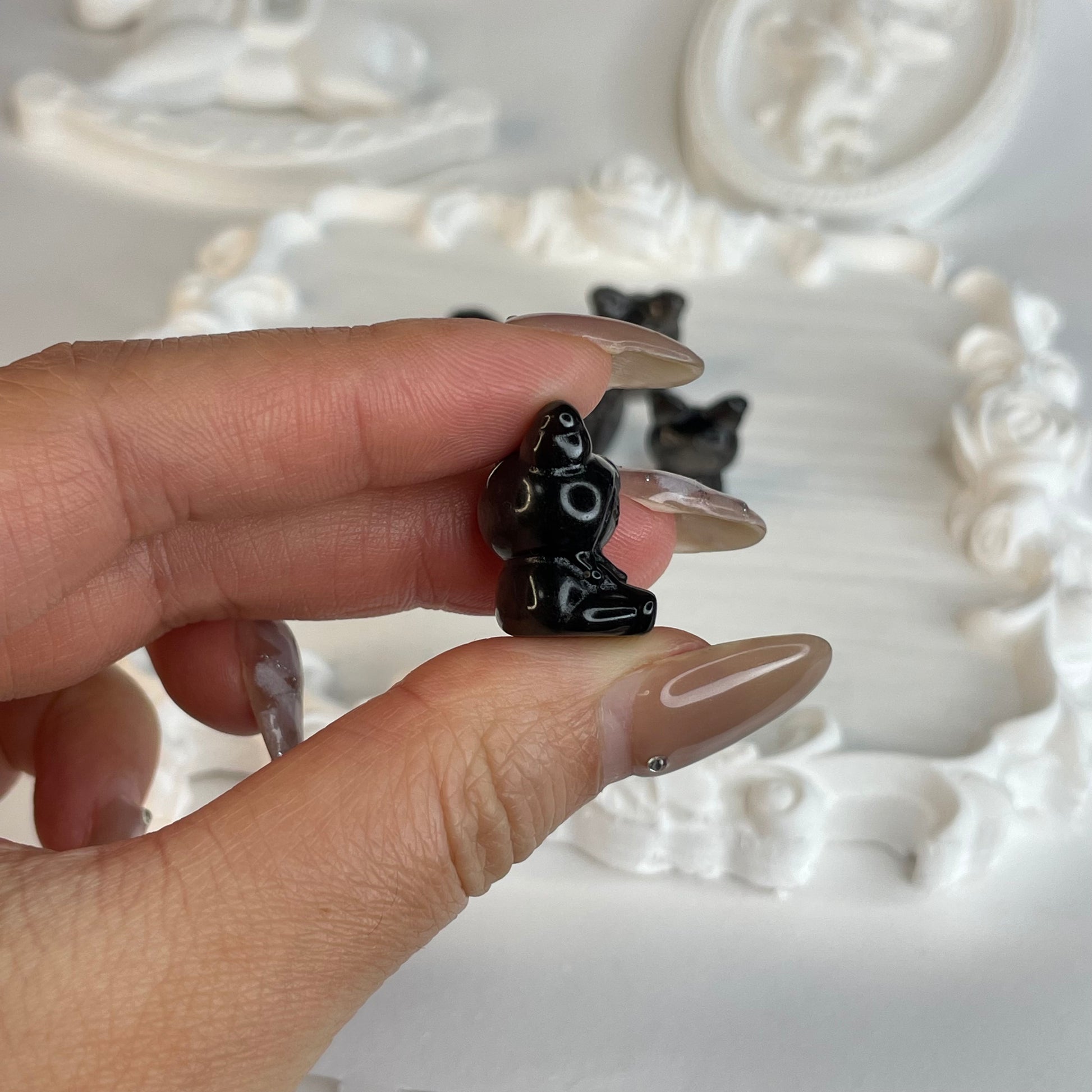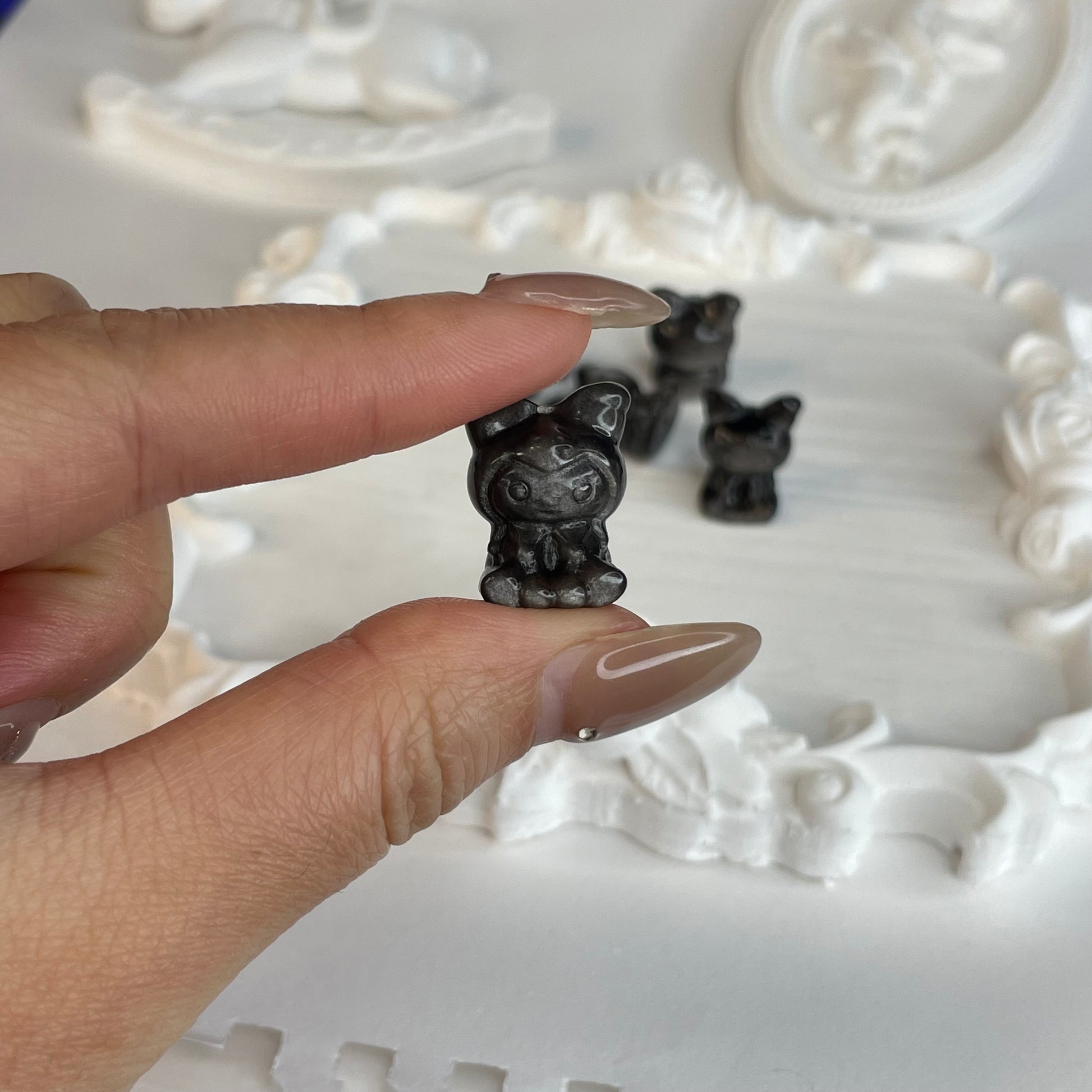 Set of 5 – Hand-Carved Silver Obsidian Kitty Beads | Cute DIY Crystal Charms (18mm)
