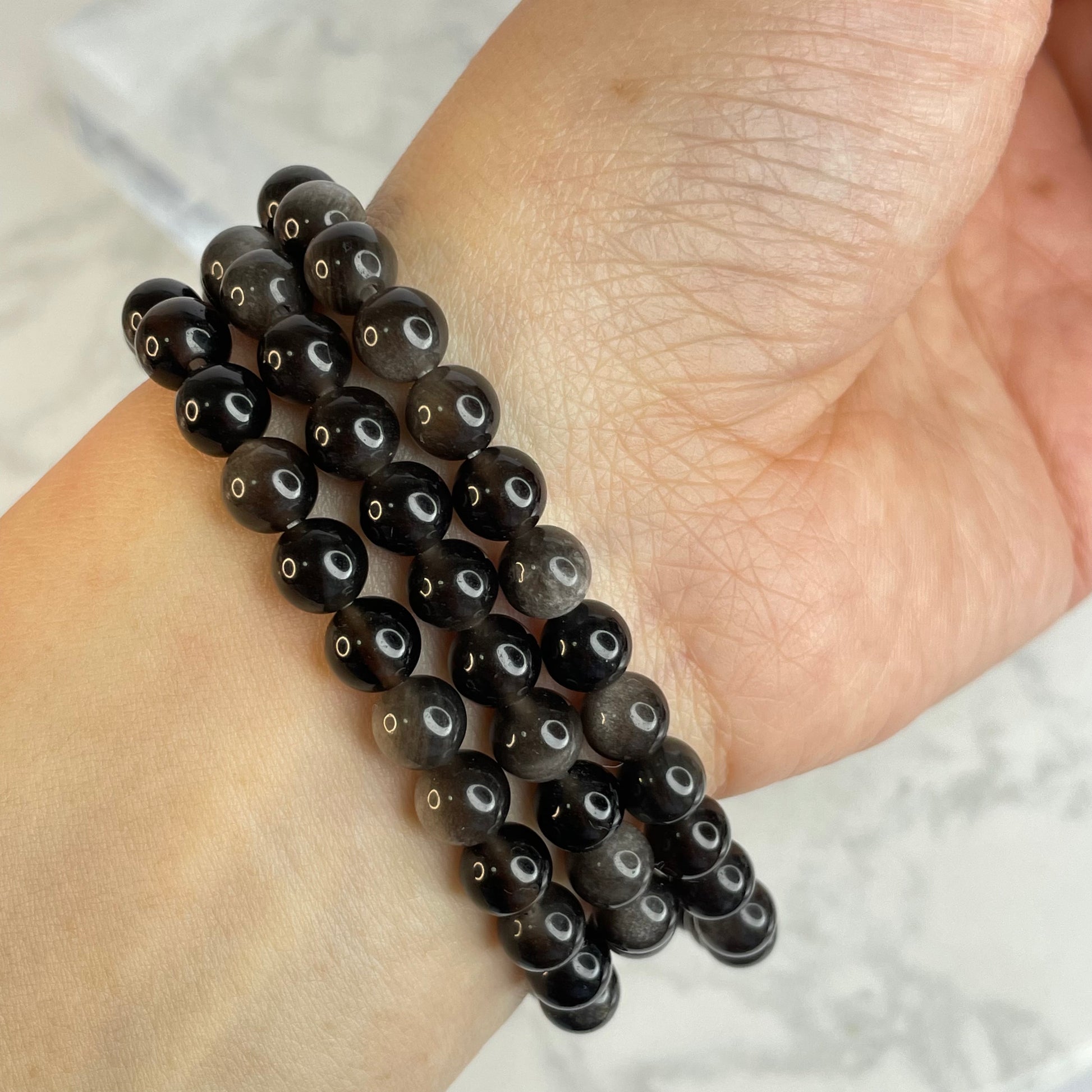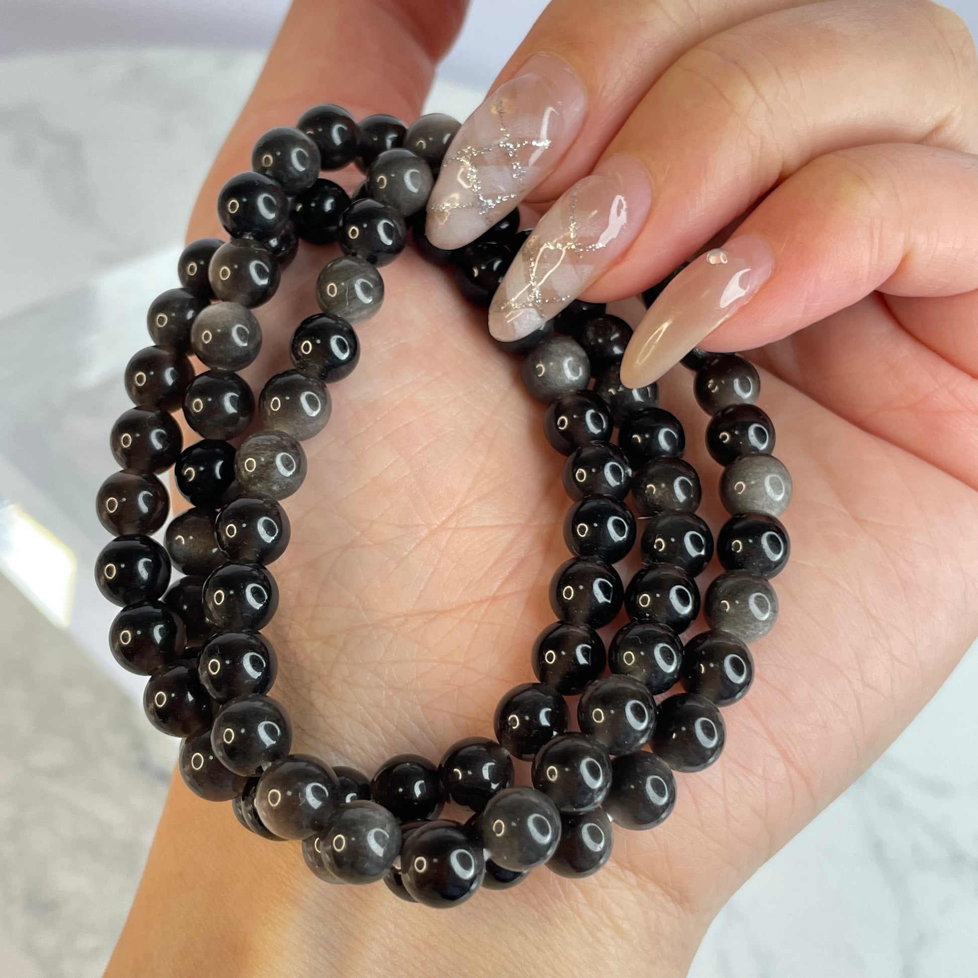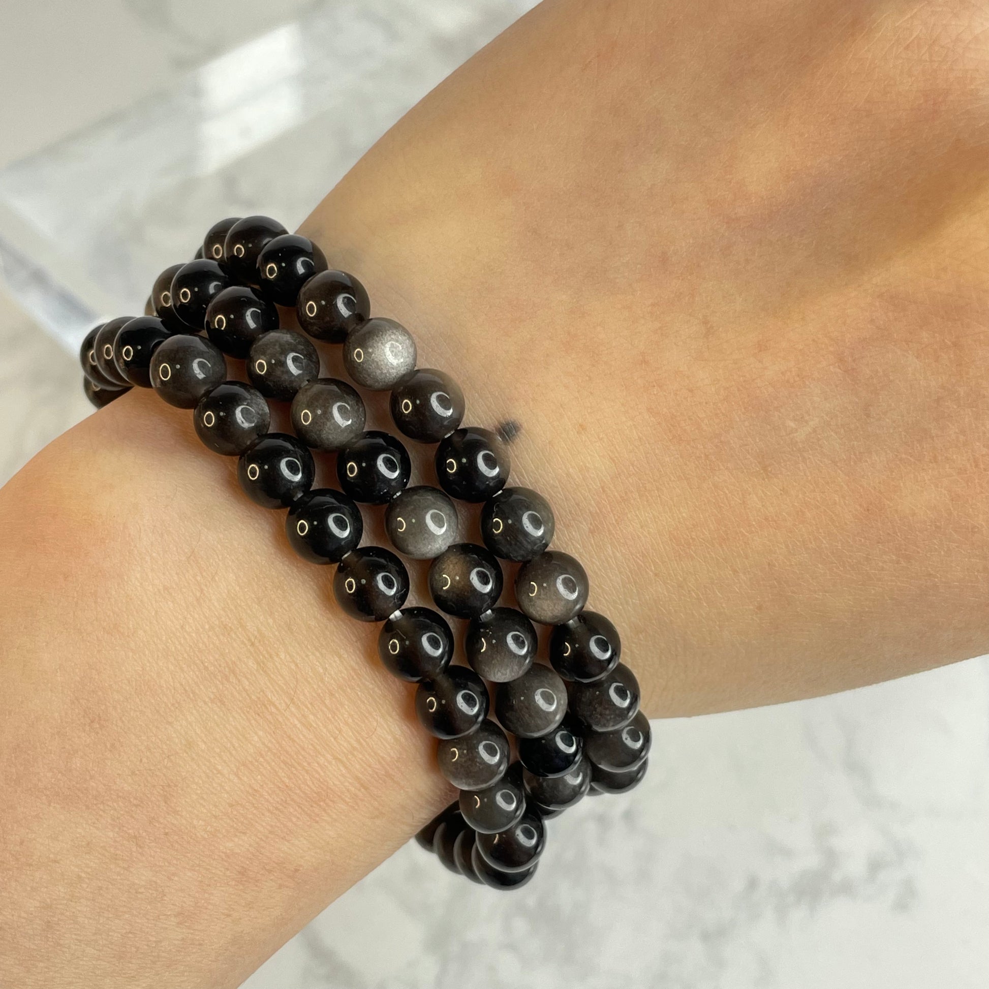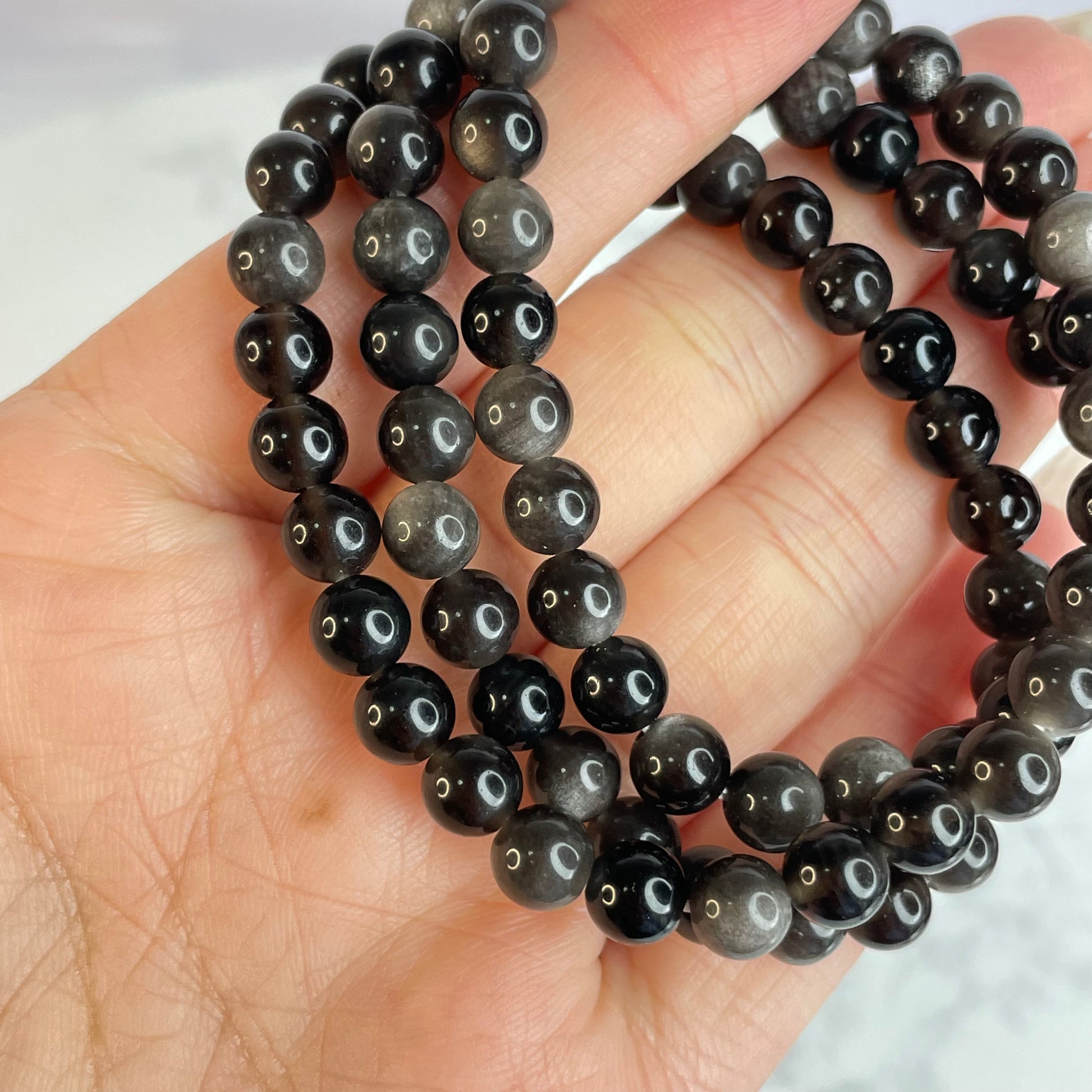This 6mm Silver Sheen Obsidian bracelet is crafted with smaller beads for a refined and versatile look. It can be wrapped three times around the wrist or worn as a stylish necklace. The beads exhibit beautiful shades ranging from deep black to soft silvery grey. Known for its protective and introspective energy, Silver Sheen Obsidian is ideal for grounding and spiritual clarity.