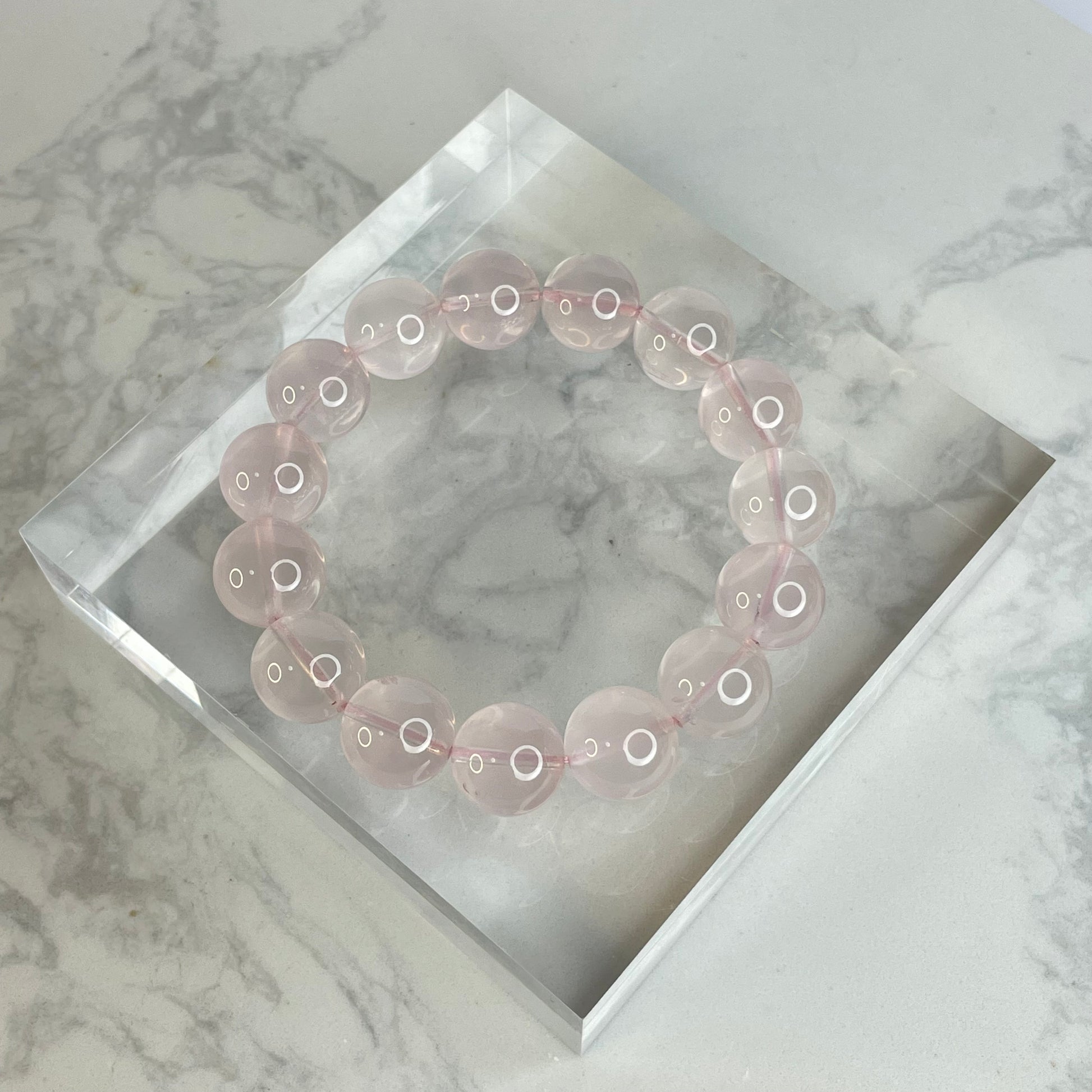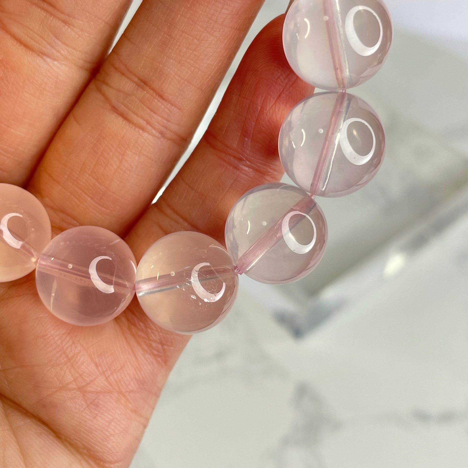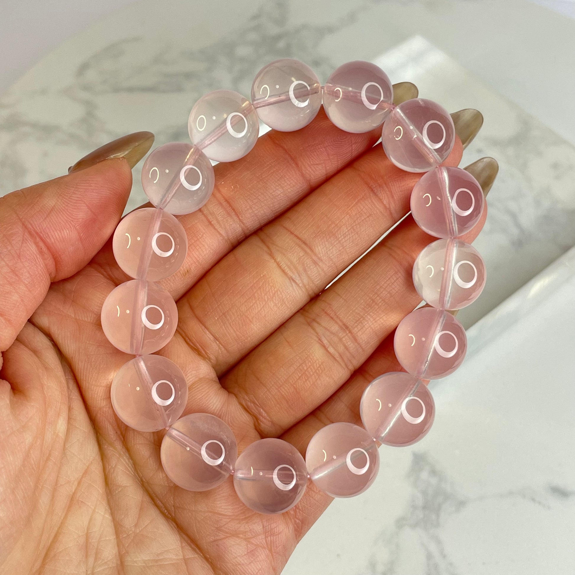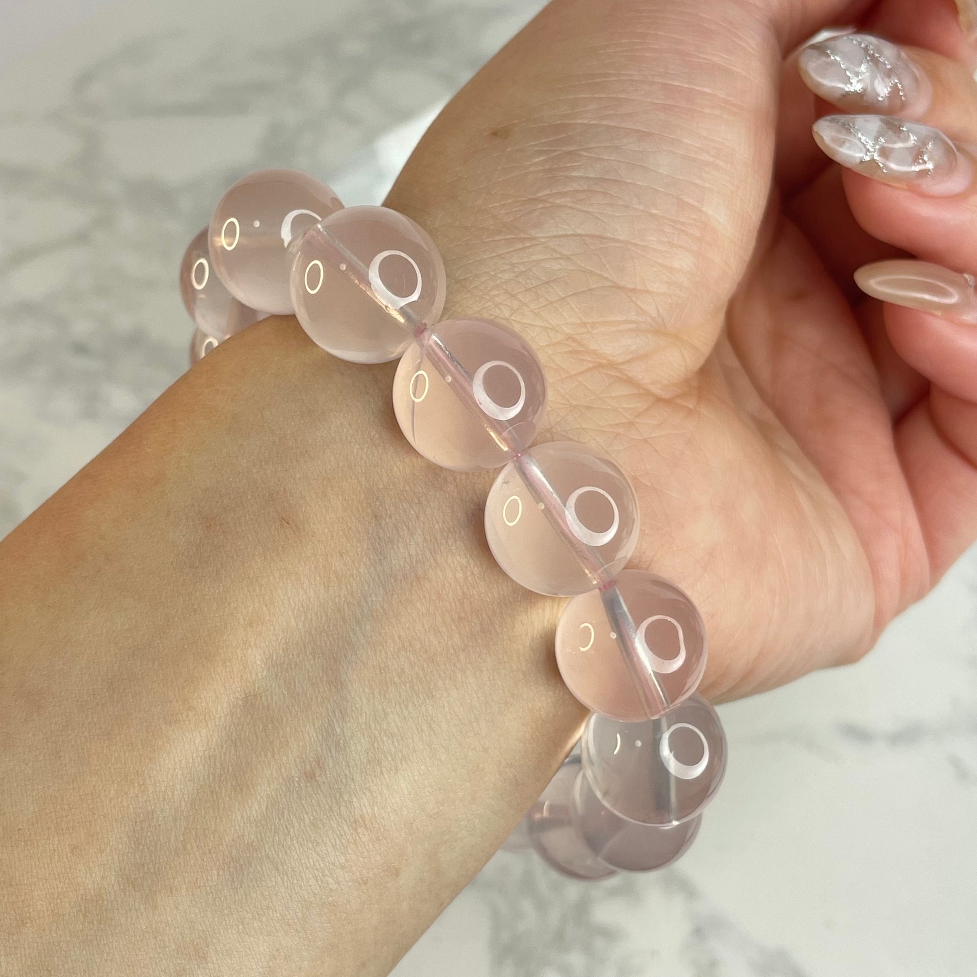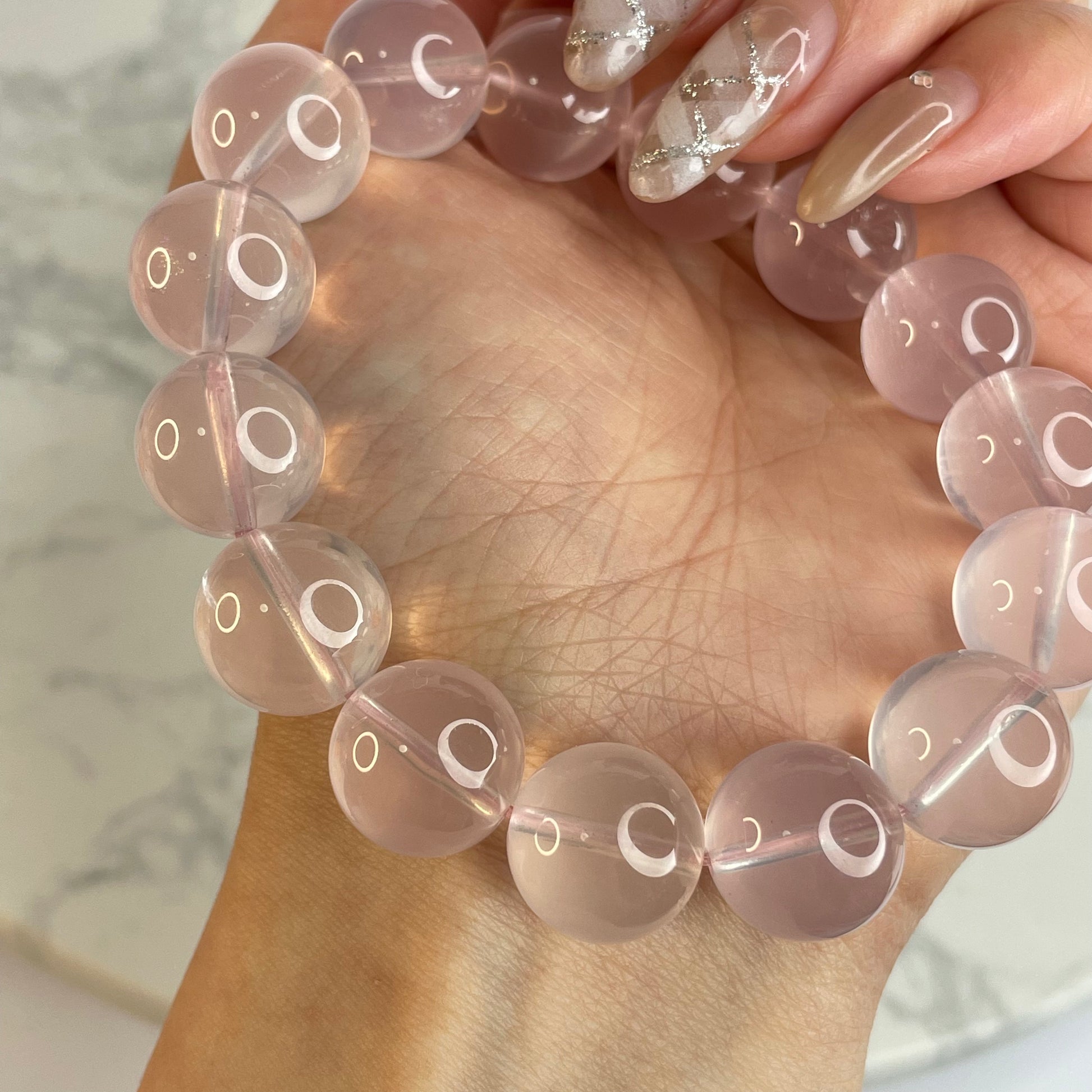This 14mm star rose quartz bracelet features beautifully translucent pink beads with a soft, glowing finish. The overall clarity is excellent, with only one bead showing a more visible surface flaw, while the rest carry minor natural marks. Star rose quartz is known for enhancing emotional healing, calmness, and self-love—making this bracelet both elegant and meaningful.