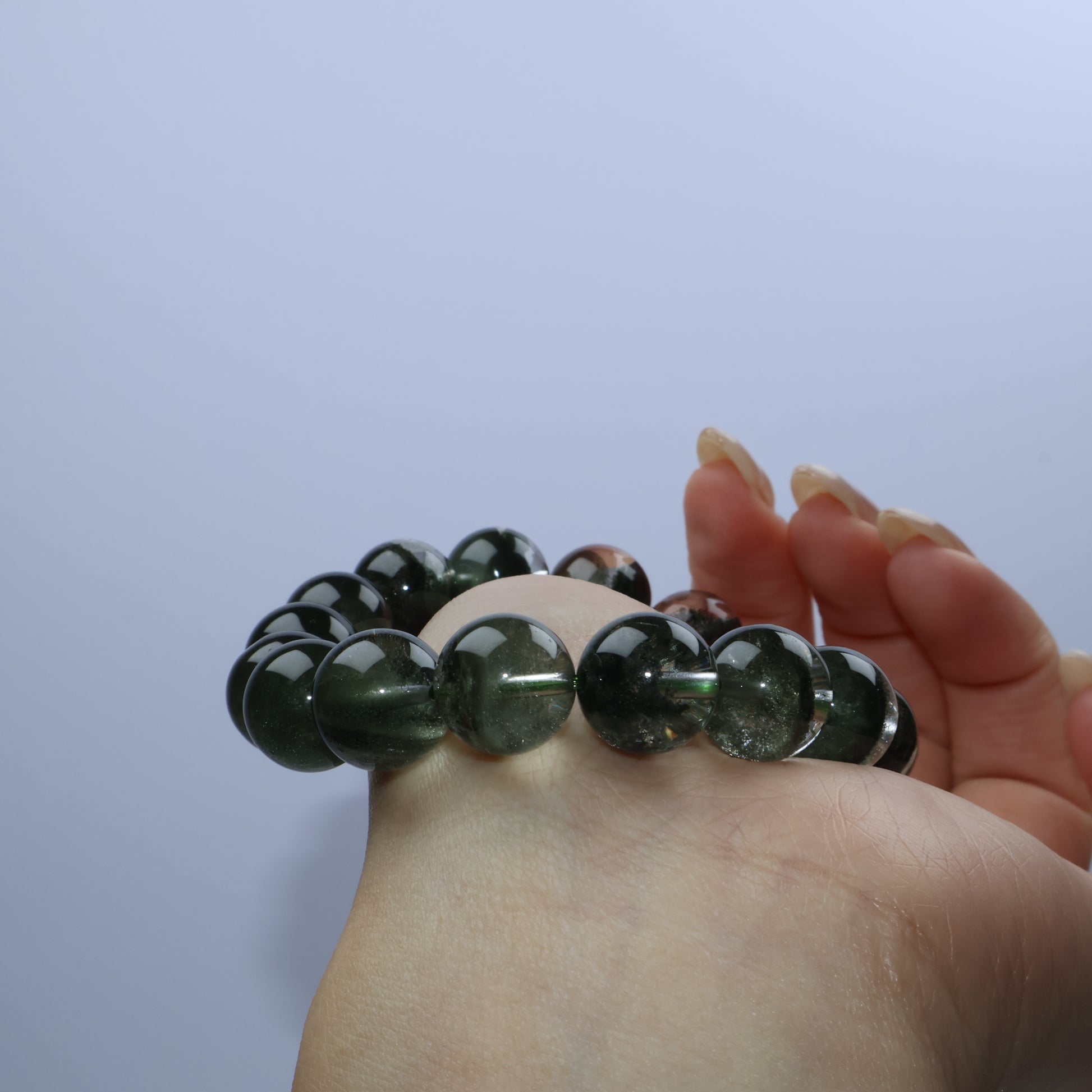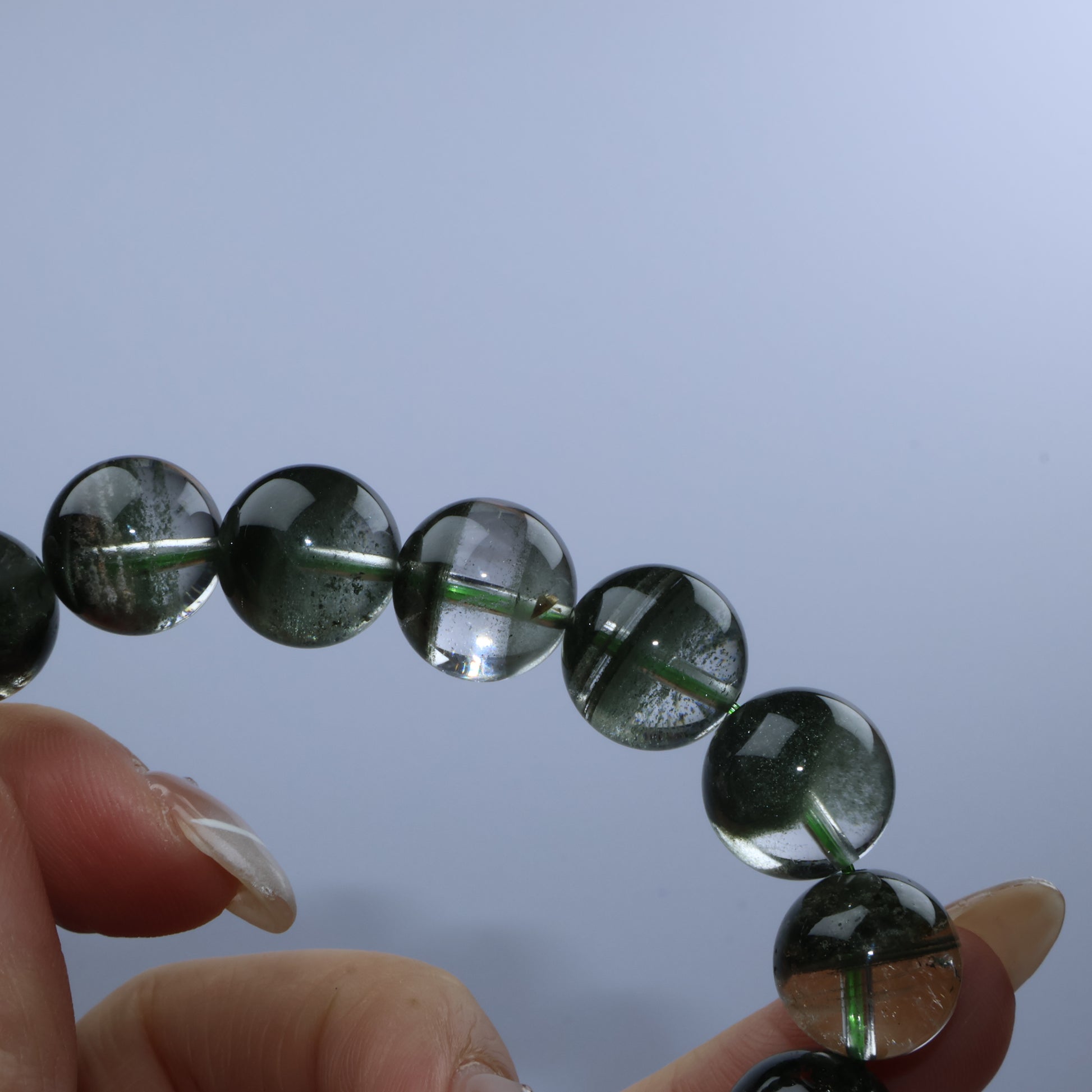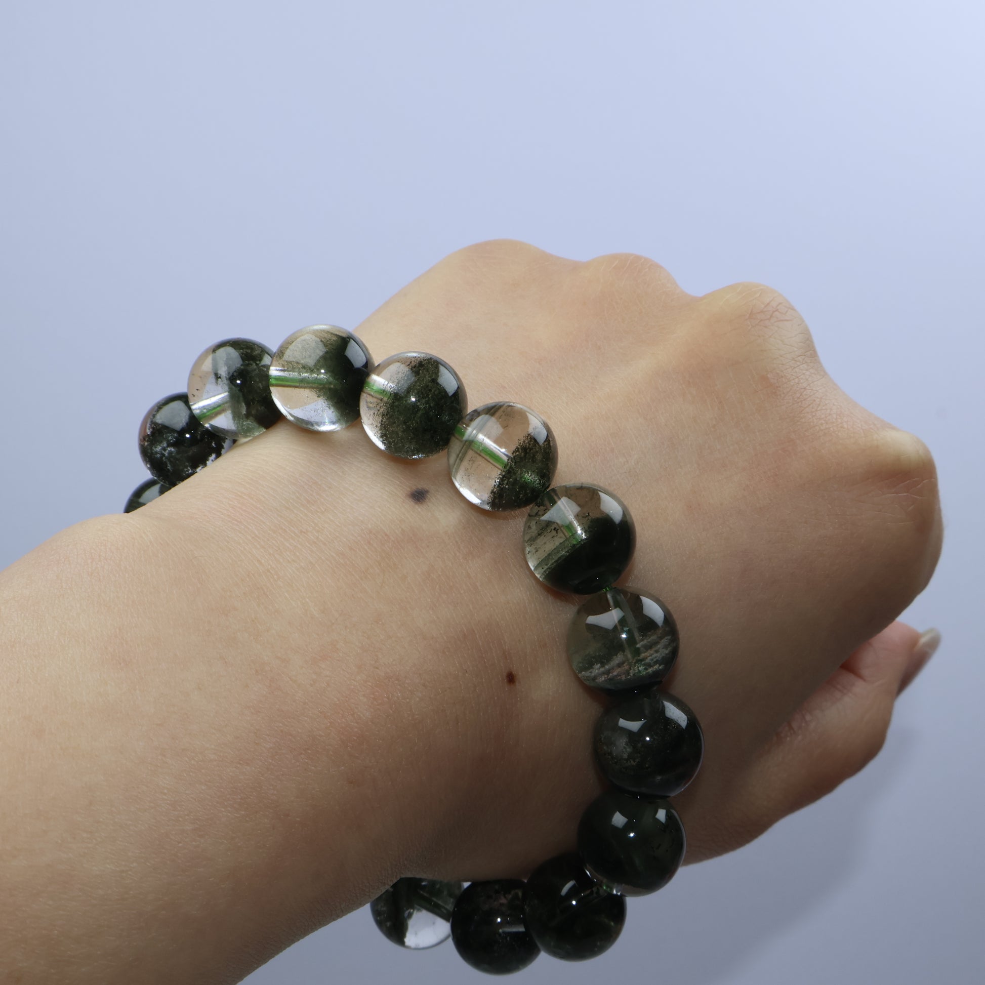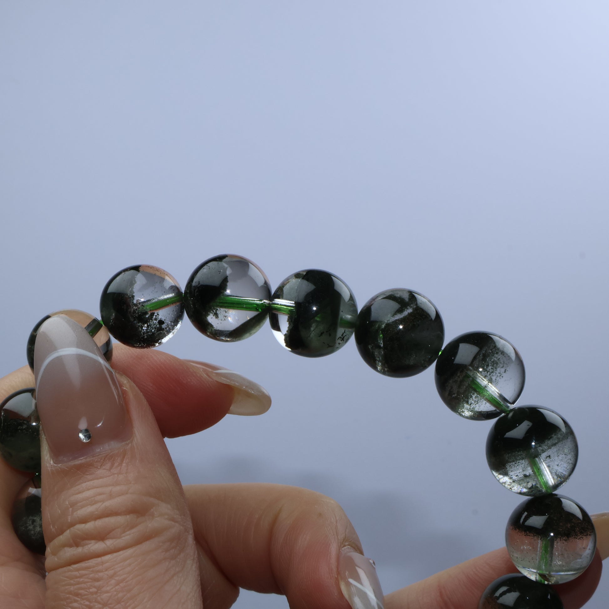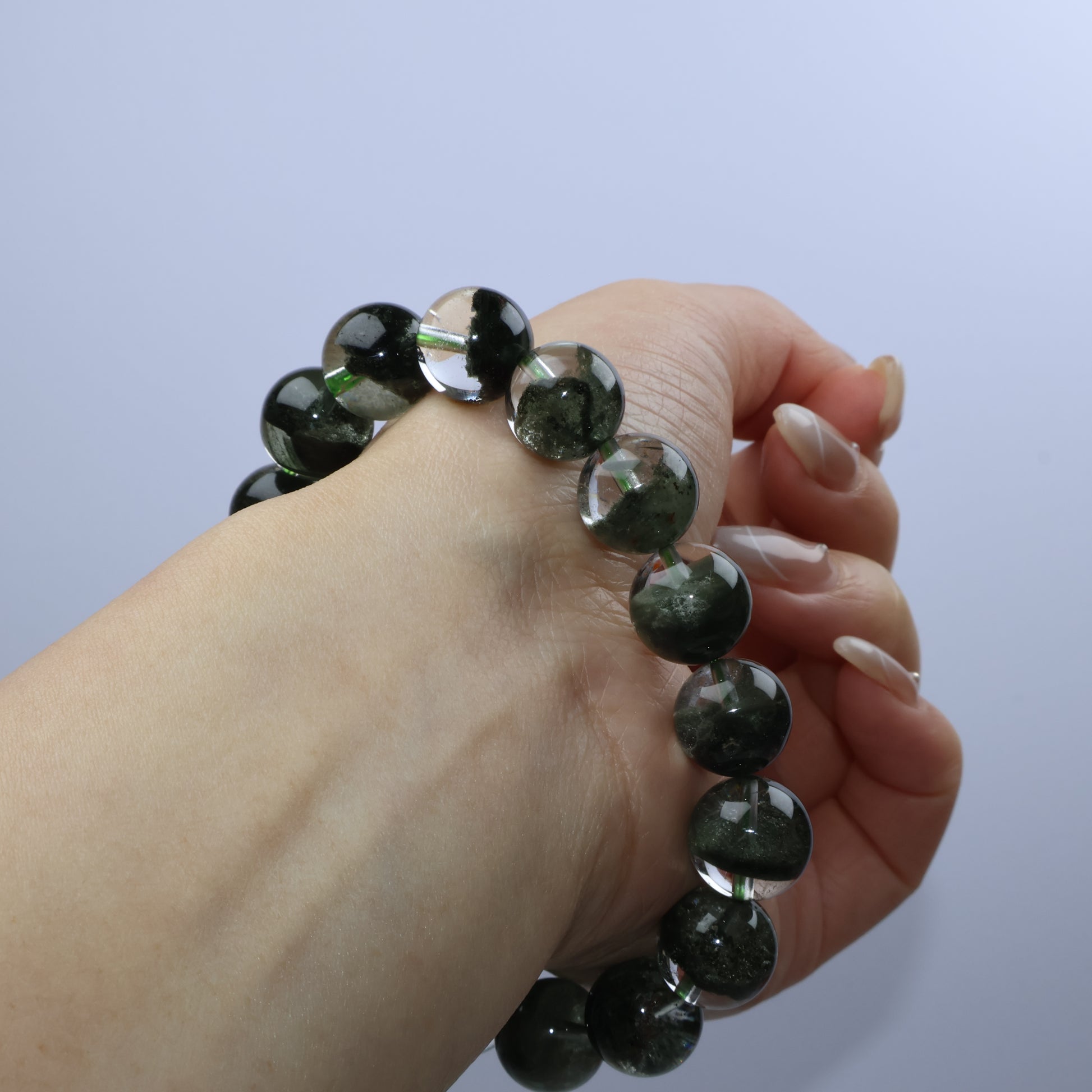 踏上「蒼翠之徑」:每顆通透水晶珠內皆蘊含層層深綠幽靈,如苔蘚森林靜止於時光中,別具立體層次。綠幽靈象徵生長、豐盛與自然能量,為佩戴者帶來穩定的向上動力與靈感。